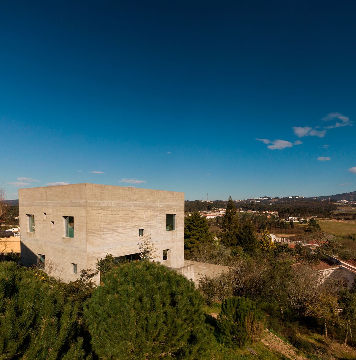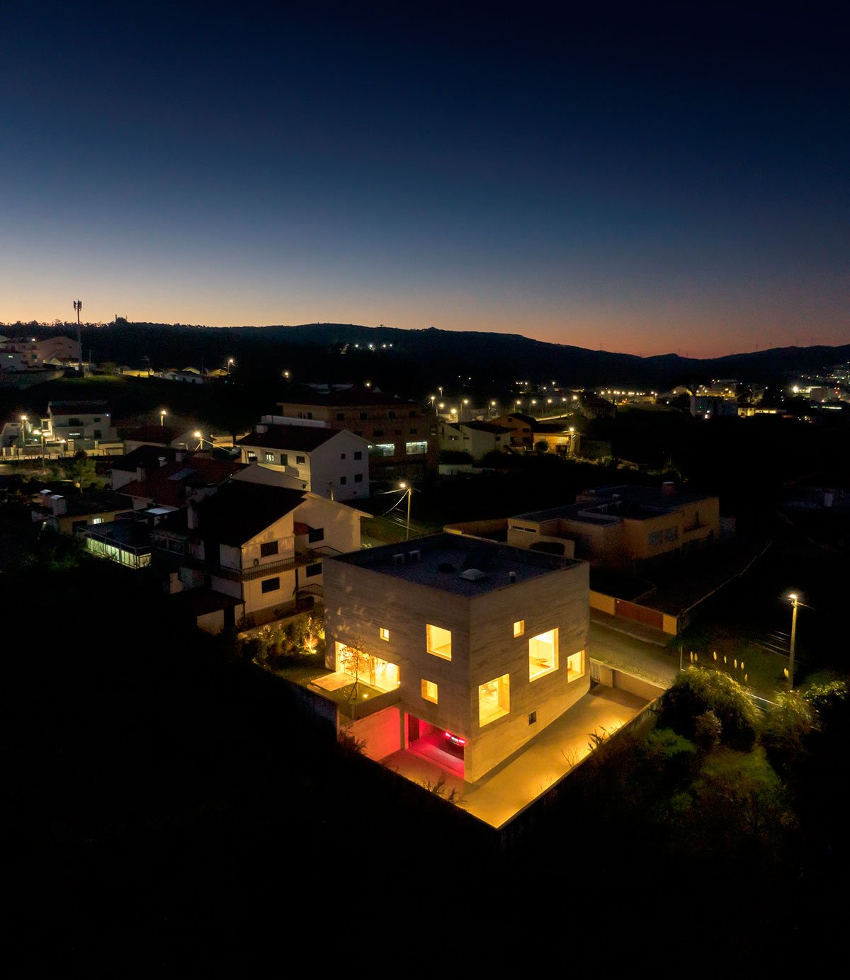 The house materializes itself in a concrete block where openings for the different spaces go beyond the mere need for ventilation and natural lighting. From the outside, they are an important element in the composition of the elevations and in the perception of the occupation of the house that they reveal, but without revealing too much. Internally, these openings focus on framing pieces of the distant landscape, or even the sky, avoiding the close surroundings punctuated by houses.