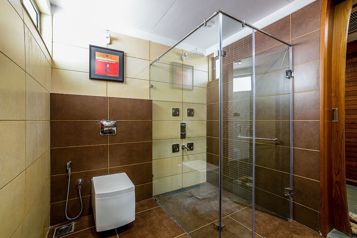 While the younger son’s bedroom has a small seating area at a lower level and a raised sleeping area.It extends into an attached terrace designed with a wooden deck and soothing lighting and further overlooks onto the main garden in the south.