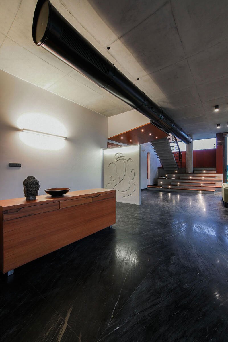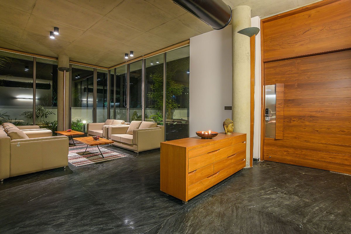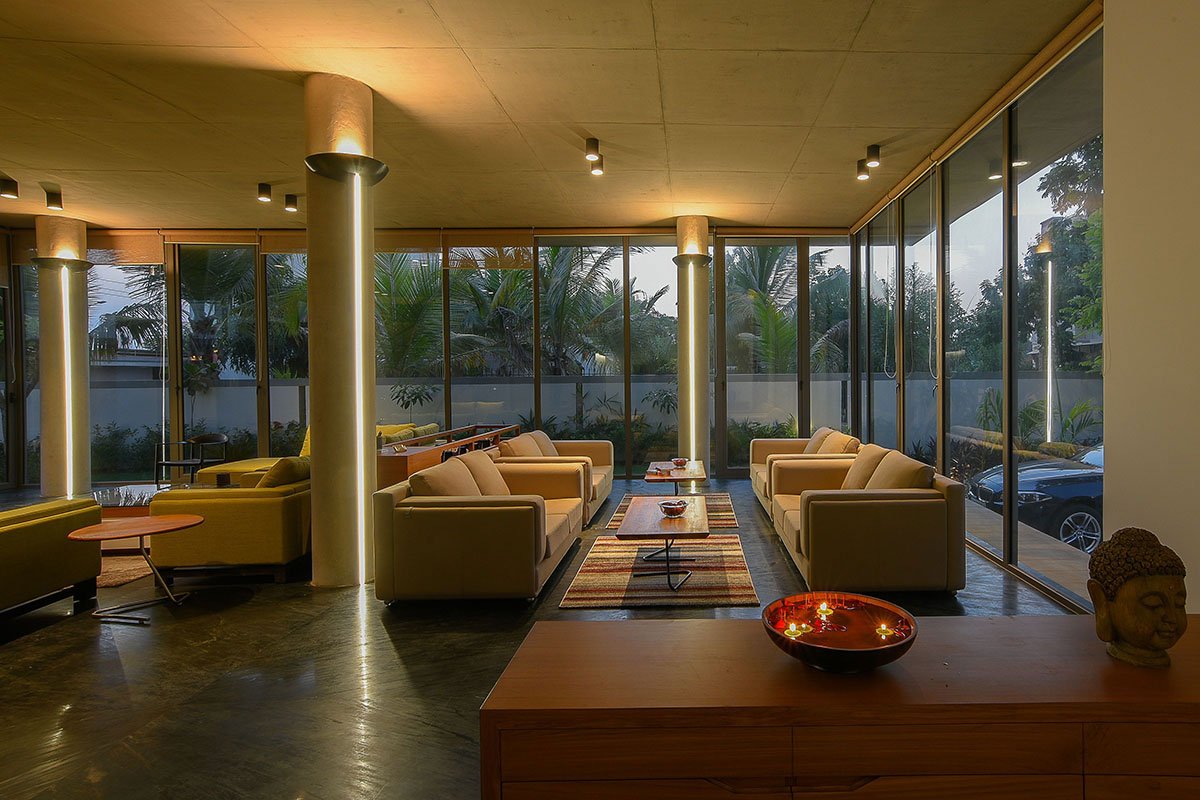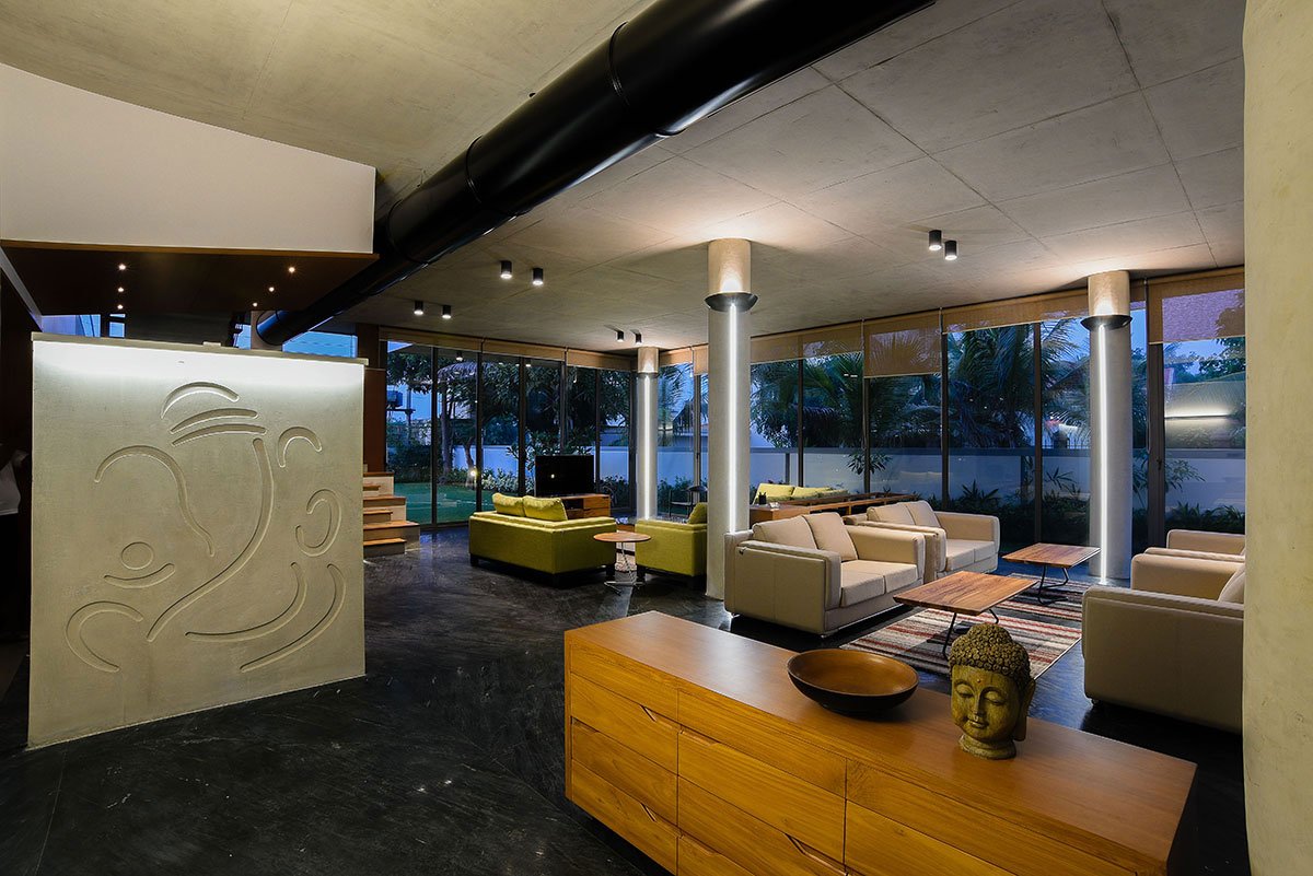 A free-standing exposed RCC wall with beautifully recessed linework of Lord Ganesh welcomes you into the house. The vast and infinite experience was created by not putting any divider element between formal and informal living. The use of black natural stone flooring acts as a binding element to all the common spaces which kept deliberately minimal, circular columns lit up with customized light features.
