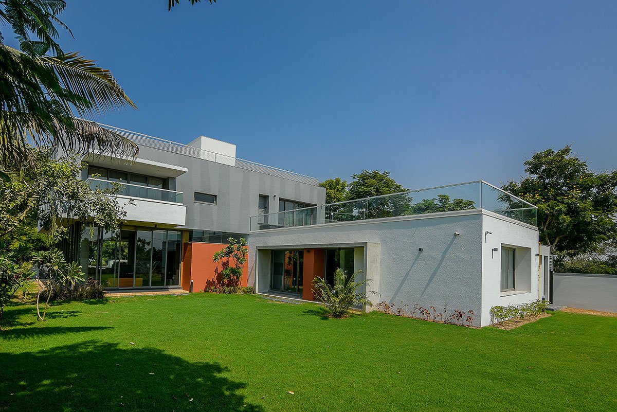 Excerpt: T house is an architectural representation of a home designed by Associated Architects (i) Pvt. Ltd. in Ahmedabad, Gujarat. Associated Architects (i) Pvt. Ltd. deliberately treated both floors differently. The ground mass is white and the upper mass painted dark Grey with vertical texture bands.