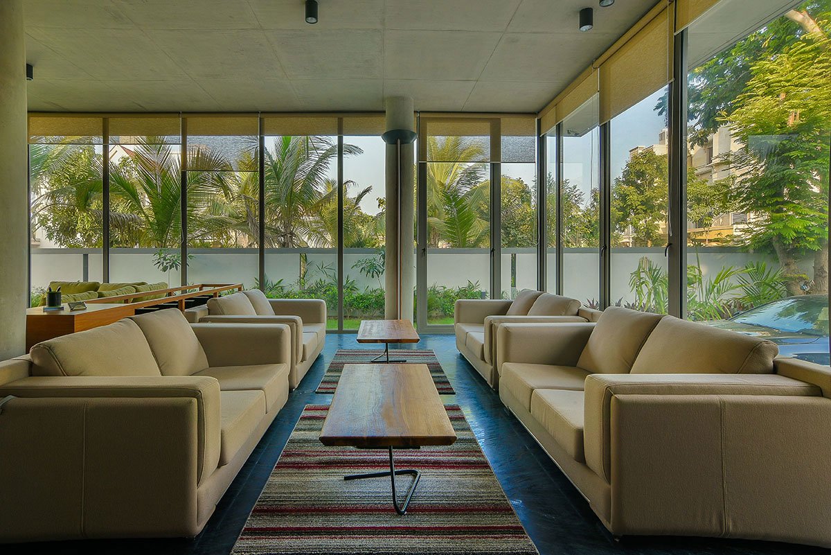 The interior with clean delineated masses, planes and lines along with the minimal furniture and a carefully coordinated colour palette. Exposed RCC, natural stone and wood are the basic materials that are blended to create the space reminiscent and reflective of the client’s personalities, lifestyles and identities despite major relocation of the functions planned previously. The placements of the existing columns were taken as a challenge and, we arranged the formal and informal seating layout in a way that allowed the interconnection of formal seating and the landscape area with the best 270′ view.