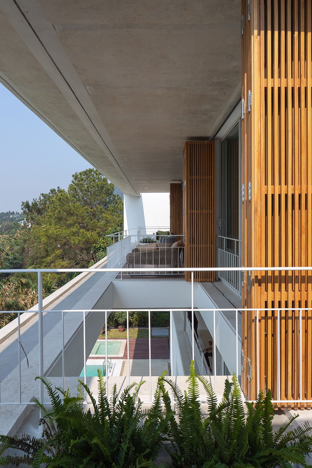 Excerpt: Tam Đảo Villa by Tropical Space is a three-story house with a simple architectural shape comprising three square boxes placed on top of each other. The house’s interlocking of empty and solid spaces allows for ventilation and natural light, while layers of voids create depth and penetration of views. A courtyard and pond located in the centre aid in ventilation to bring breeze into the house.