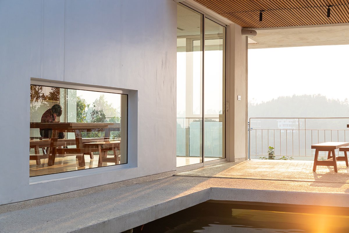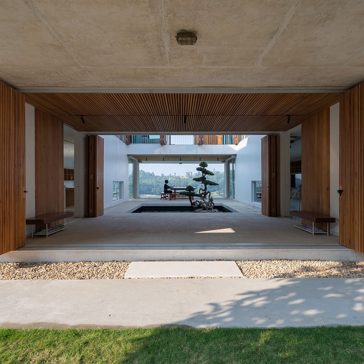 The courtyard and the pond also take part in ventilating to bring breeze into the house. The hall is designed open, is a place to sit down, have some tea, relax and feel the changing moments of the weather, the scenery, the sunshine and the rain.
