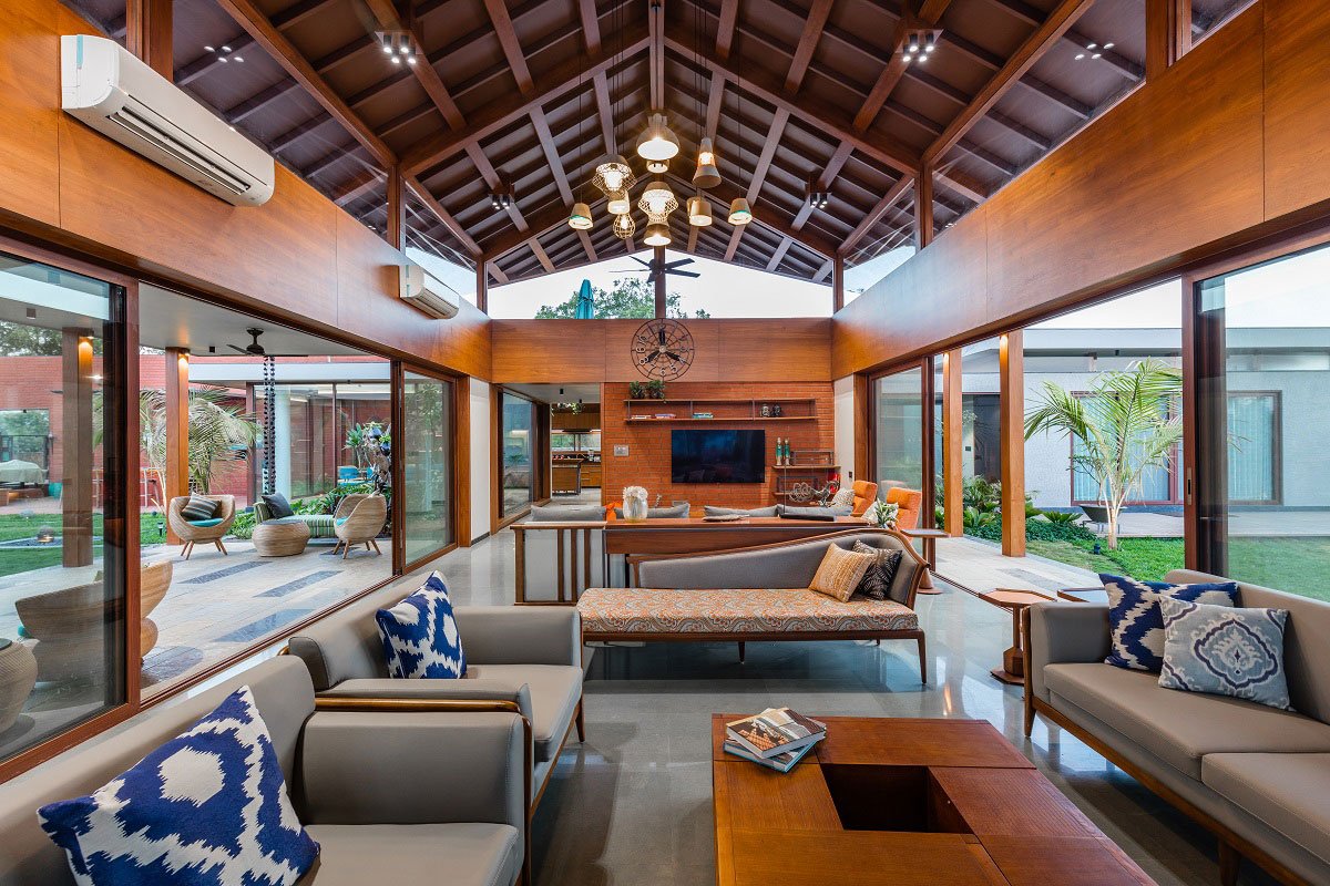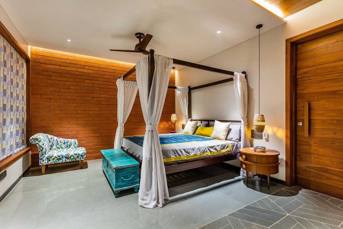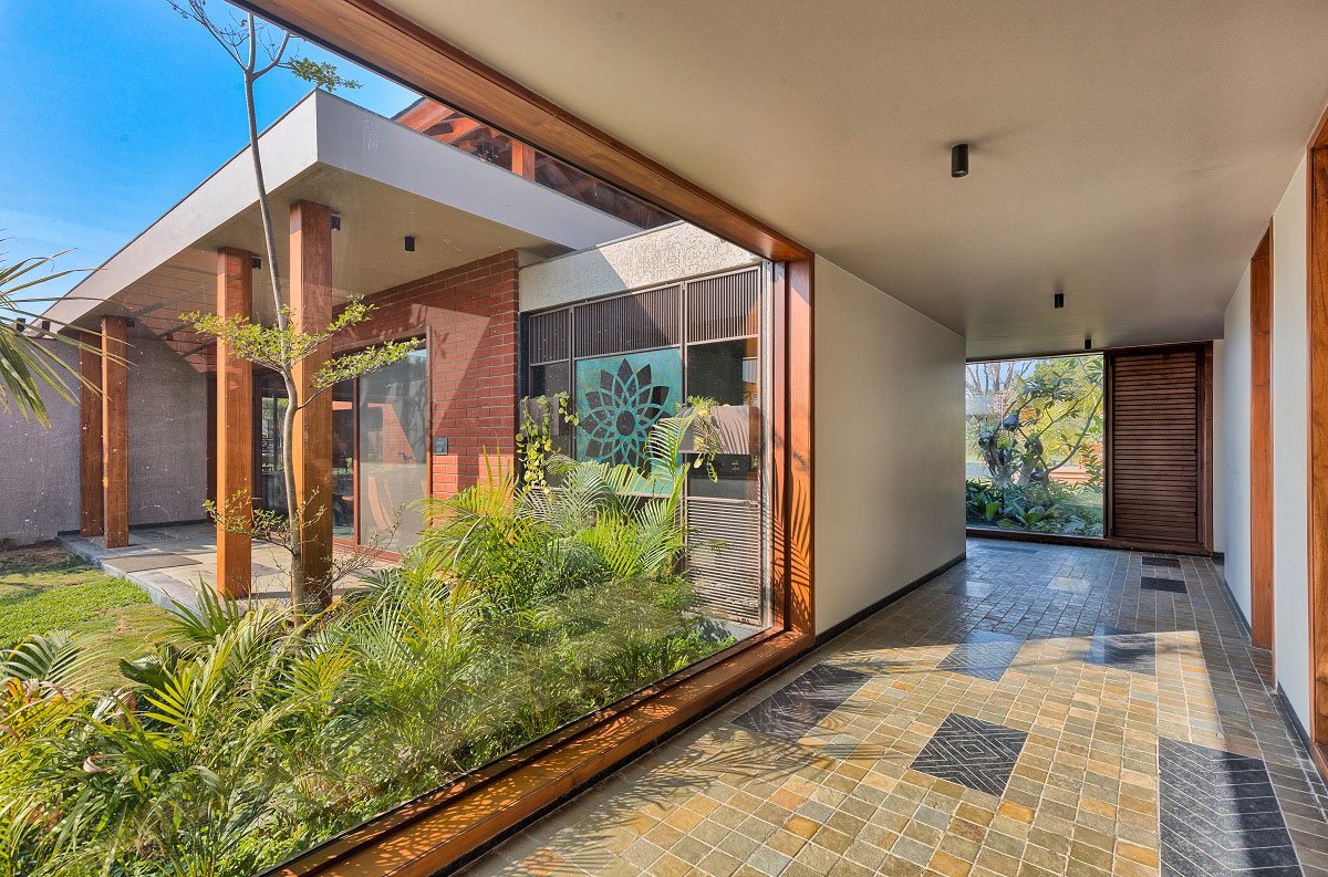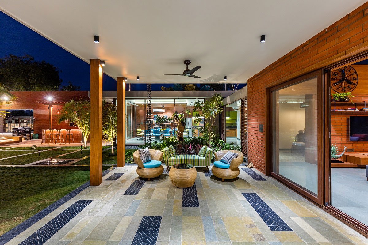 The symbol of ‘tamara’ (designed by us) has been uniquely used at various parts of the house, like in the entrance water-body, screen motifs, furniture pieces, flooring, etc, to have a sense of continuity throughout the house. The flooring has been done using locally avaible kota stone and steel grey stone with interesting patterns to add the muse. Tropical bright colors along with earthy, rustic tones of browns and greys, both in interior and exterior, add onto the tropical character of the house. The entire house has flat roof except, the living + drawing core, which has a traditional sloping roof, signifying the importance of the space to stand-out as a unique element in the roof-scape of the house.