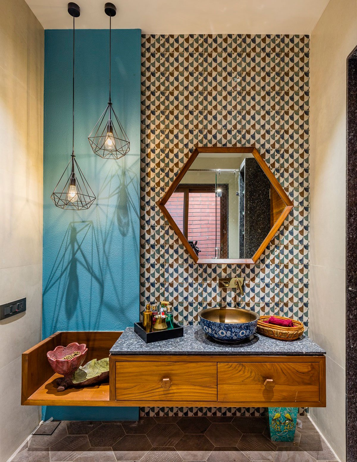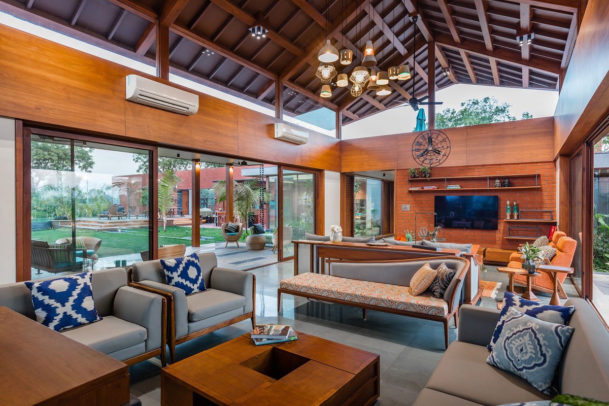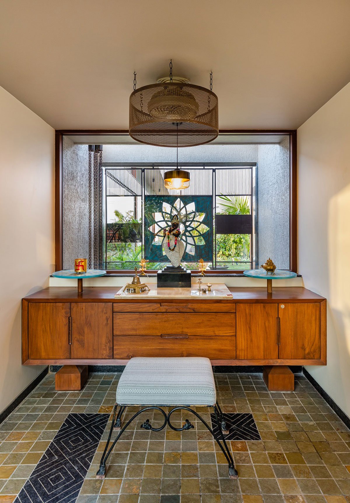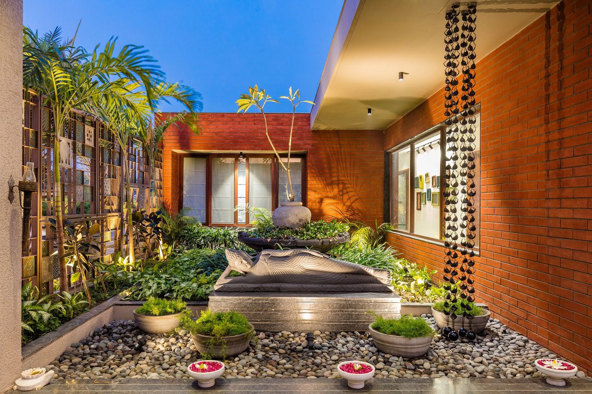 The symbol of ‘tamara’ (designed by us) has been uniquely used at various parts of the house, like in the entrance water-body, screen motifs, furniture pieces, flooring, etc, to have a sense of continuity throughout the house. The flooring has been done using locally avaible kota stone and steel grey stone with interesting patterns to add the muse. Tropical bright colors along with earthy, rustic tones of browns and greys, both in interior and exterior, add onto the tropical character of the house. The entire house has flat roof except, the living + drawing core, which has a traditional sloping roof, signifying the importance of the space to stand-out as a unique element in the roof-scape of the house.
