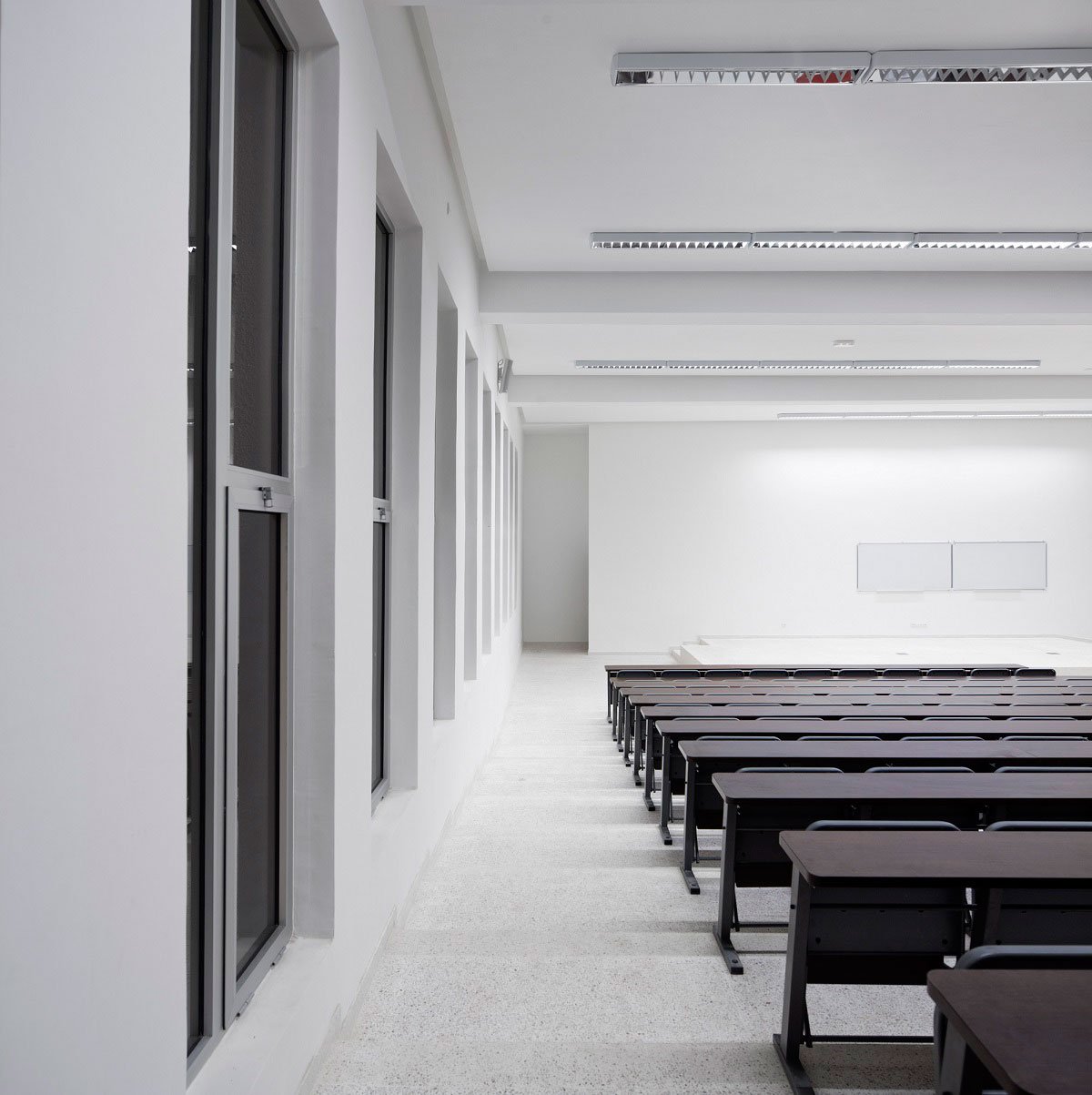 This organization helps readability and clarity of the various entities of the project while maintaining a set of scales adapted to the diversity of the program.Similarly, a reflection on the thermal quality results a work orientation, protection of openings and vegetation cover, thus conditioning part of the architecture vocabulary and principles. At last, the project Research finally assumes a certain theatricality, a certain gravitas that meets the solemnity inherent to educational institutions.