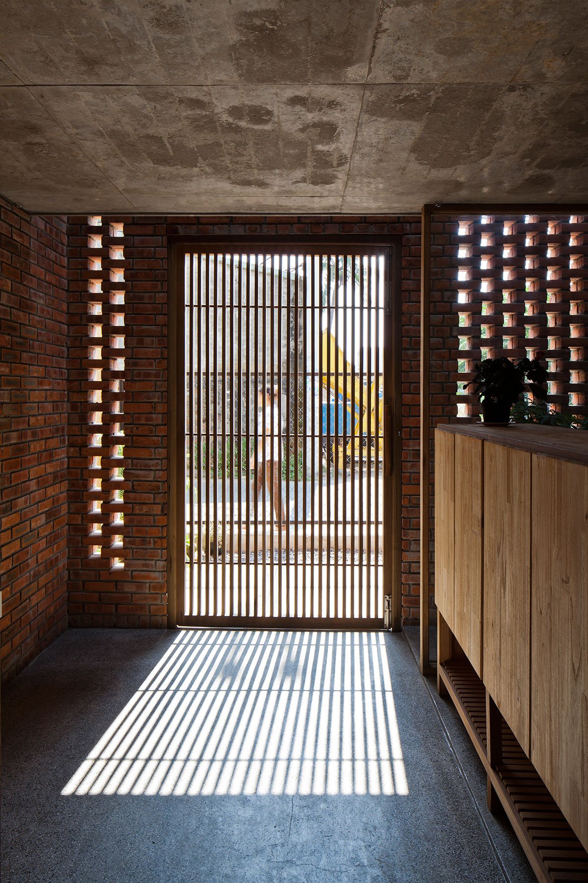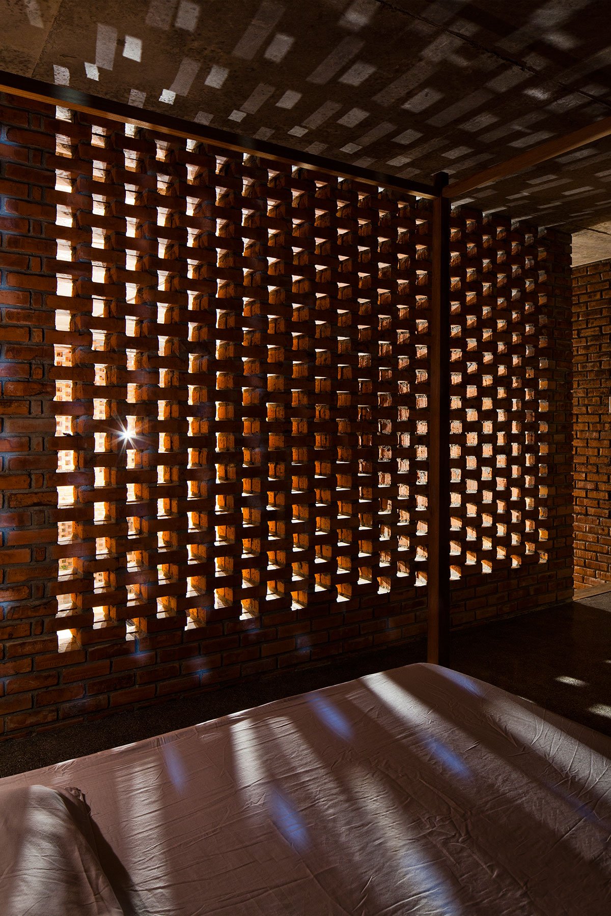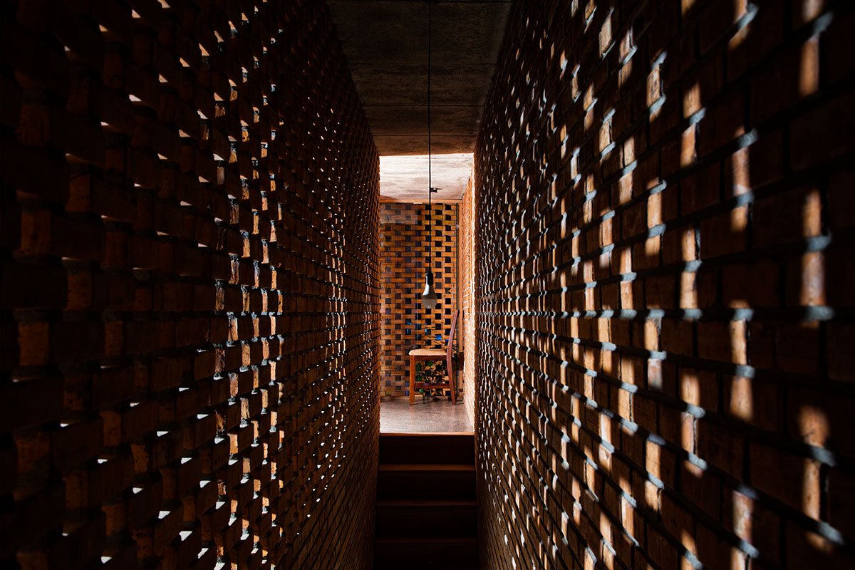 The special design of the baked-brick walls with a lot of holes, together with the large inter-floor space, allows breeze and light to get to all the corners of the house, even the hardest-to-access areas. The house owners are also able to enjoy the blue sky during the daytime or the moonlight night-time from the living room, the dining table or the kitchen. At different times during the day, the variety of the light intensity getting through the inter-floor holes makes the brick wall colors change from the light red in the morning, red at noon, dark red in the afternoon and more purple in the late afternoon and early evening.