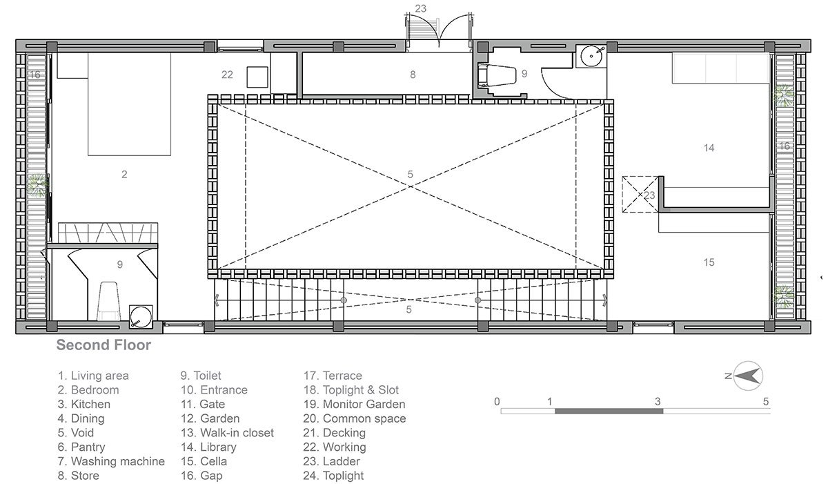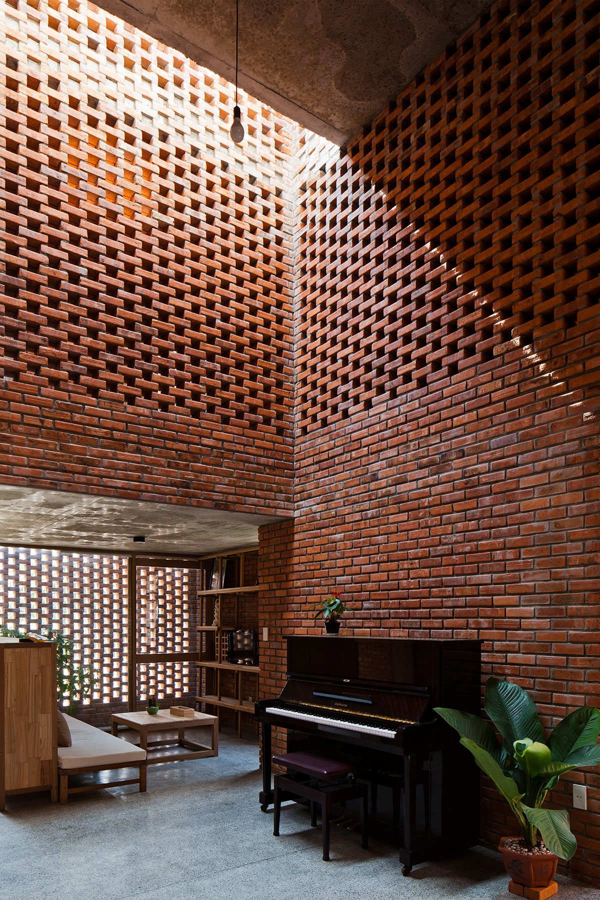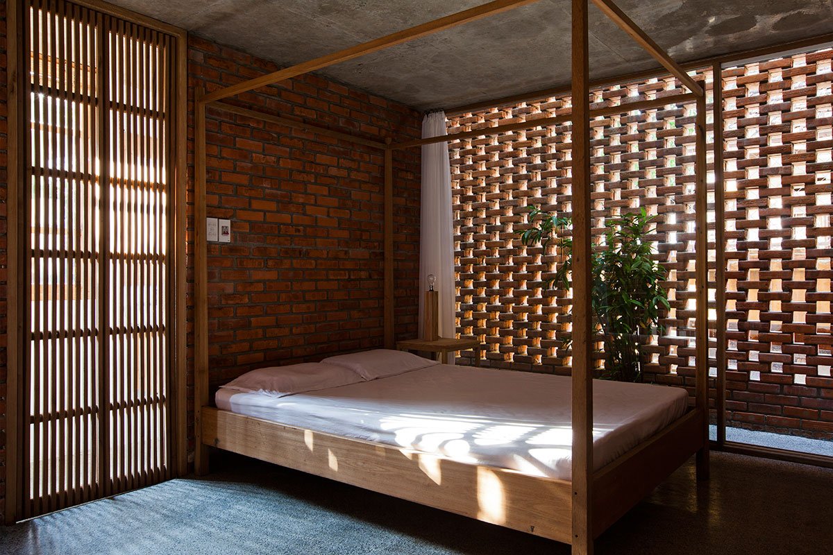 The special design of the baked-brick walls with a lot of holes, together with the large inter-floor space, allows breeze and light to get to all the corners of the house, even the hardest-to-access areas. The house owners are also able to enjoy the blue sky during the daytime or the moonlight night-time from the living room, the dining table or the kitchen. At different times during the day, the variety of the light intensity getting through the inter-floor holes makes the brick wall colors change from the light red in the morning, red at noon, dark red in the afternoon and more purple in the late afternoon and early evening.