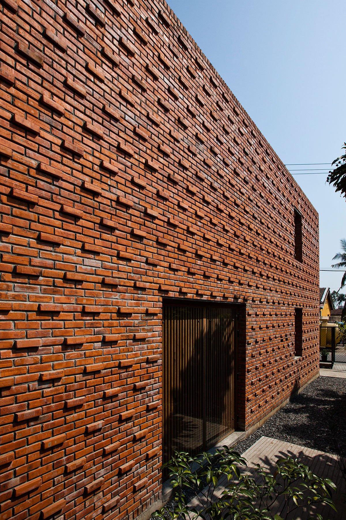 In the evening and at night, the house looks like a giant lantern with lights here and there from the holes. The surrounding brick walls are decorated with some rough bricks to make shadows. This improves the beauty and charm of every single samel-brick regarding its own shape and color.