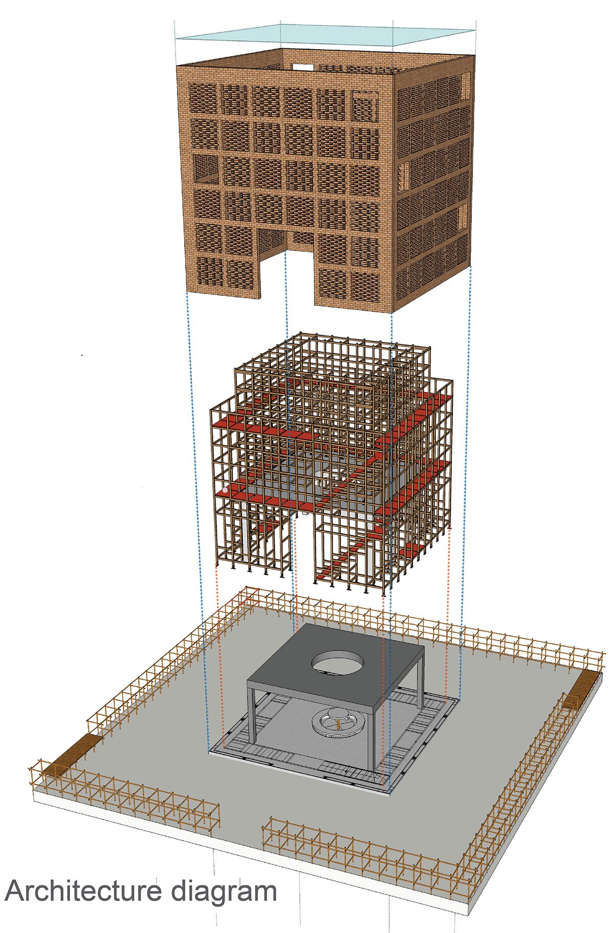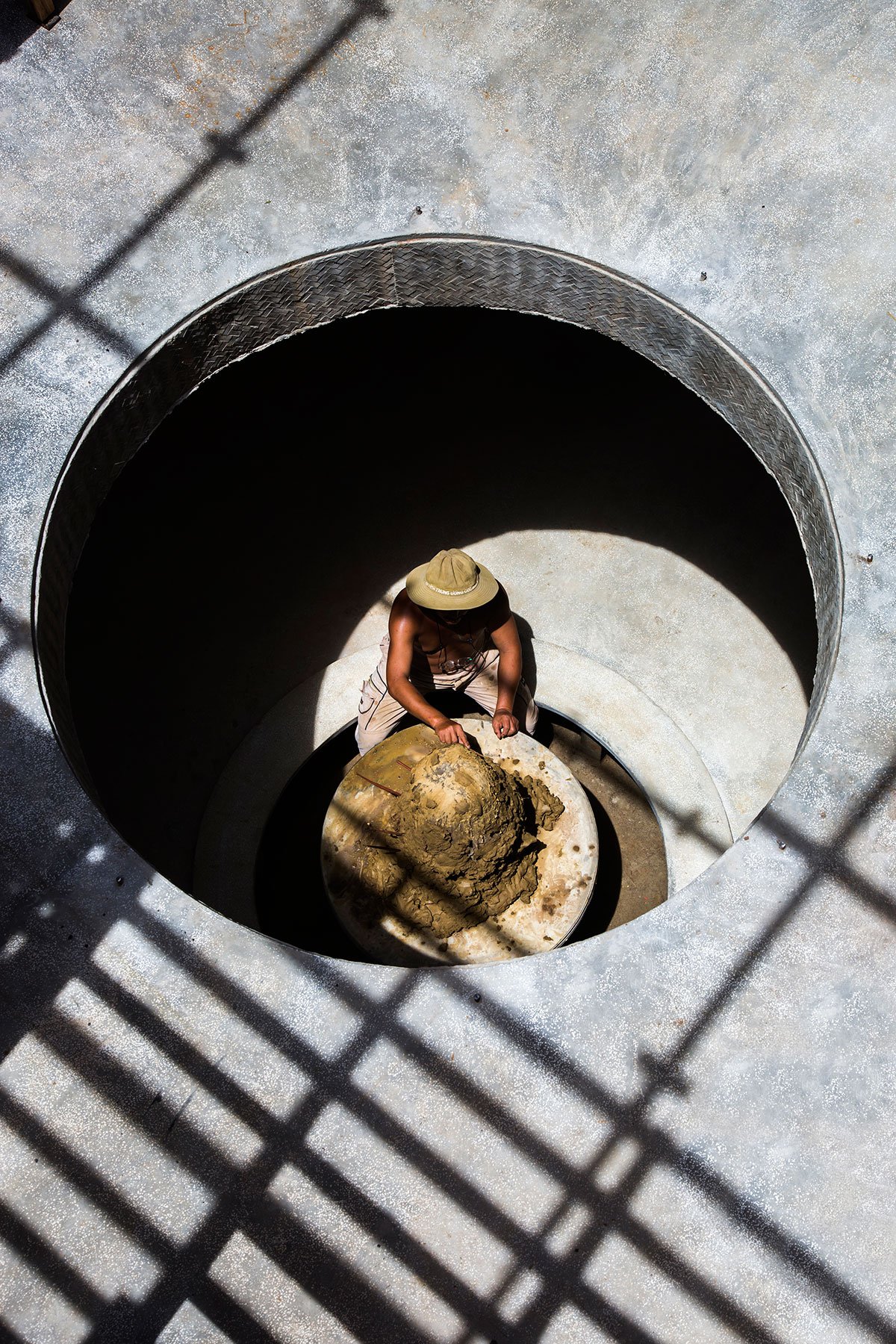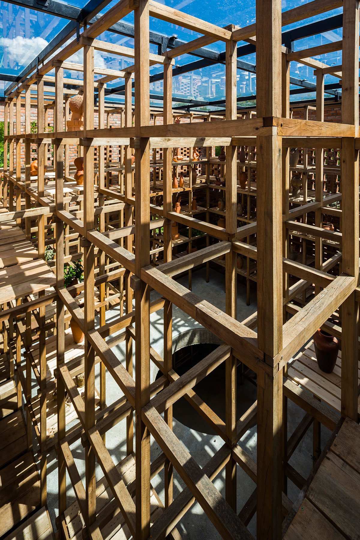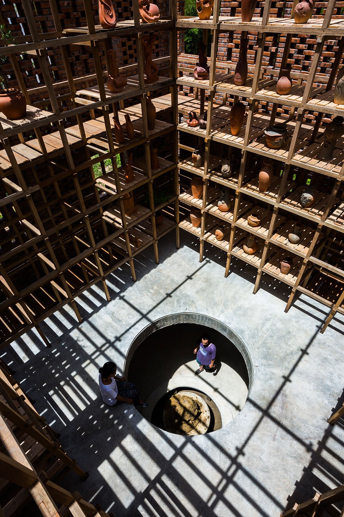 At the same time, people can see and feel the time passing in terra cotta artworks through the movement of the sunlight. On the mezzanine, people can see many different spaces inside and outside the studio, as well as observe the artist working by the round void in the center. Flooding was also a consideration when designing the building. By encouraging the artist to put both finished and unfinished works on the upper shelves, they should remain safe if the river bursts its banks and flows into the building.