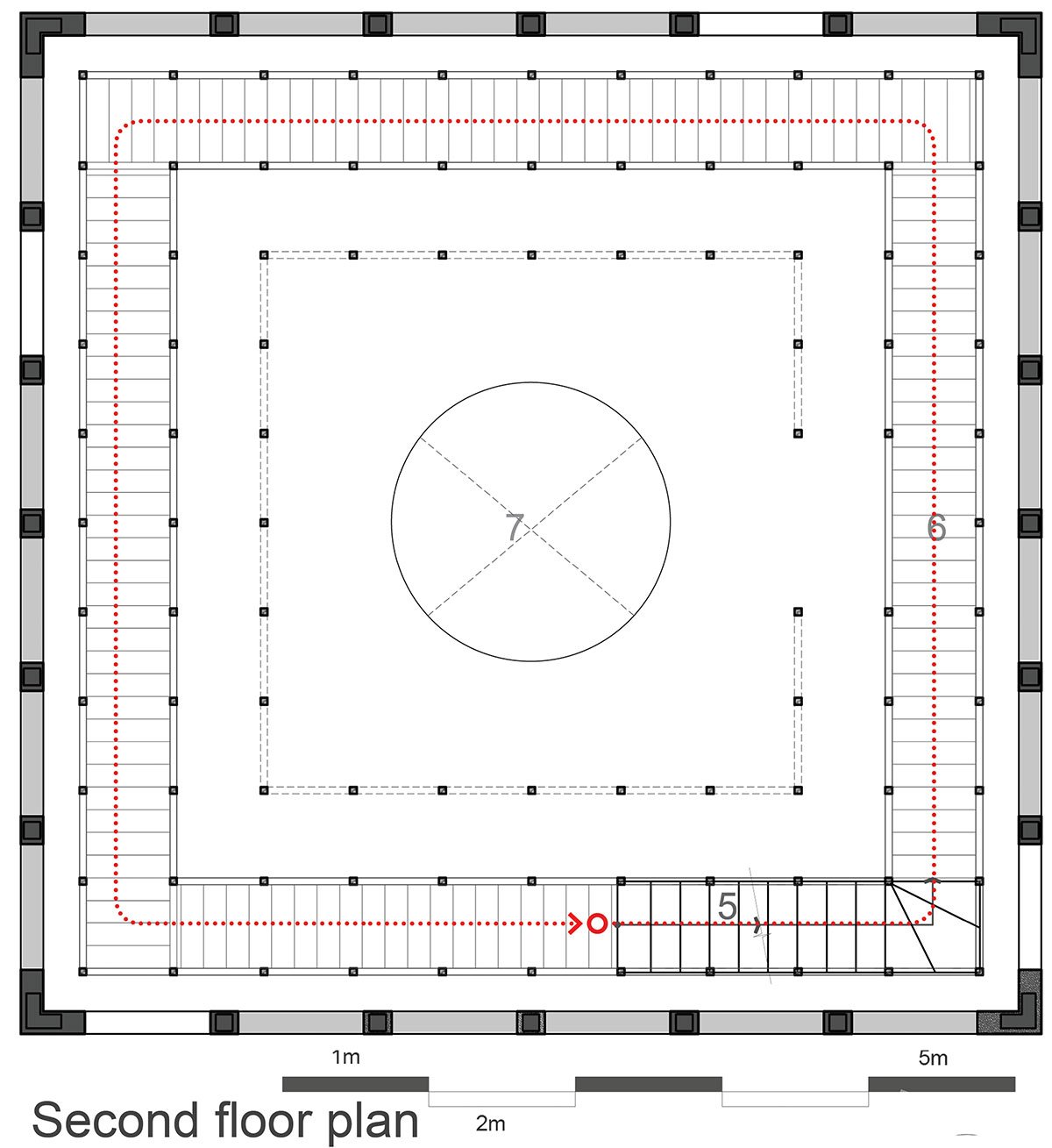 The center of the studio consists of two floors. On the ground floor, there is a turning table where the artist works. The artist and his works can interact with the sunlight from sunrise to twilight. Here, people can find the conversation of the artist and his works, as well as himself and his shadow in the silence.