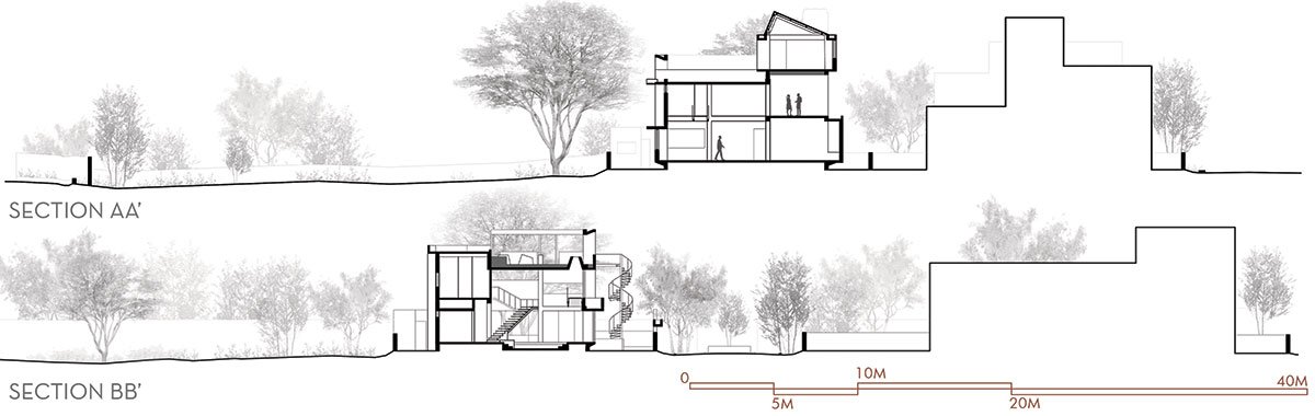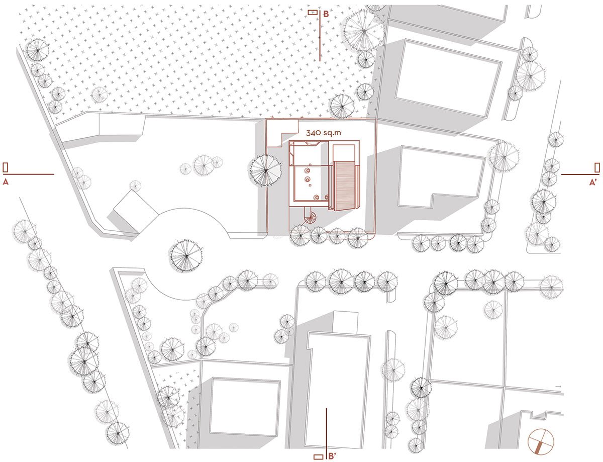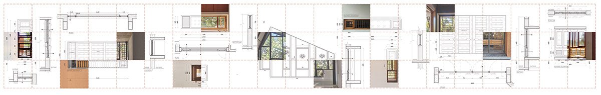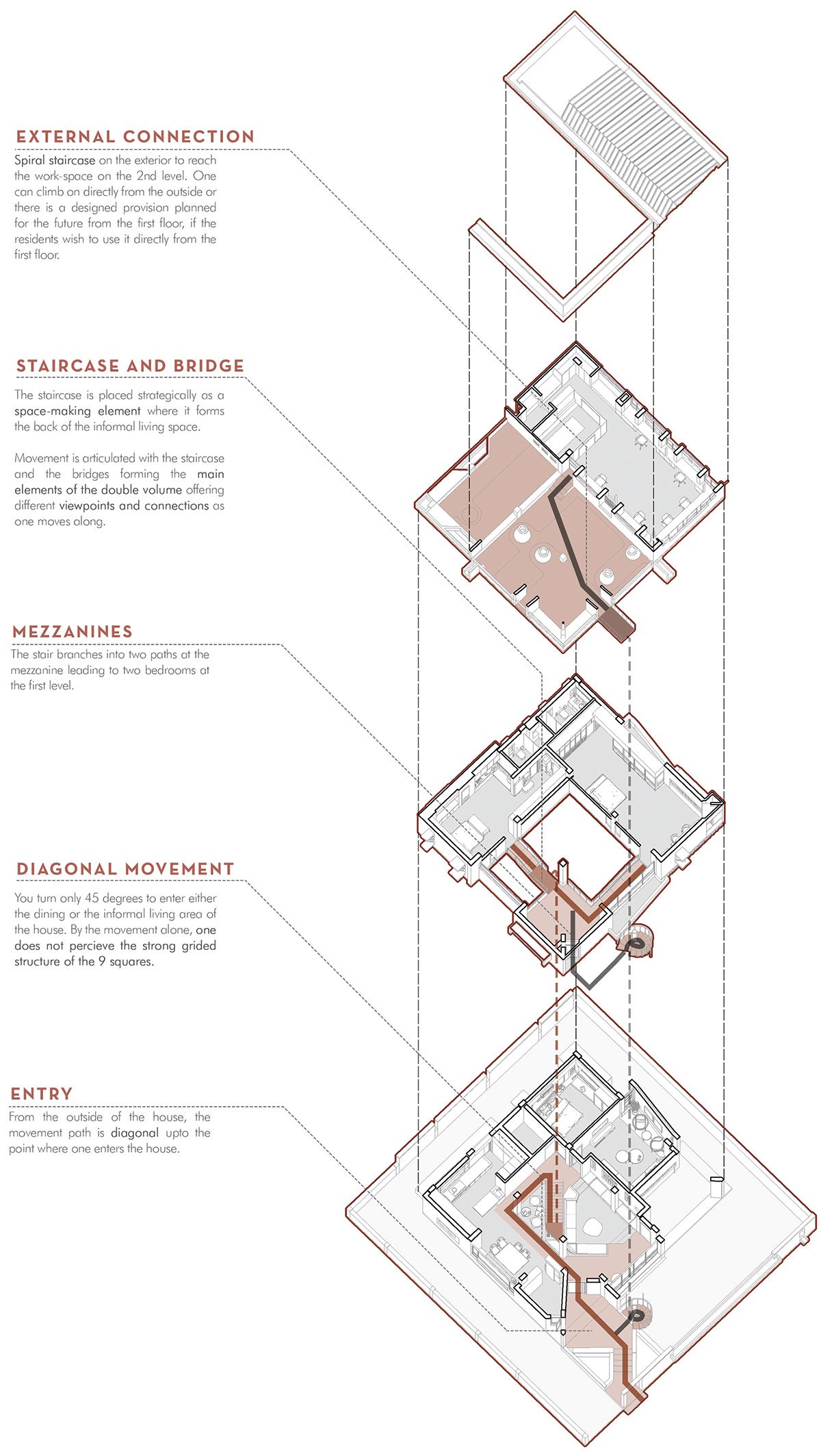 Built on a frame structure, the house consists of 9 squares that hold and negotiate the program with the surrounding grids. The built form is essentially a cuboid carved in and projected out in response to the functions inside. However, when one enters the built form, the axis of orienting is twisted diagonally by the entry which is in contradiction to the overall massing of the cuboid.
