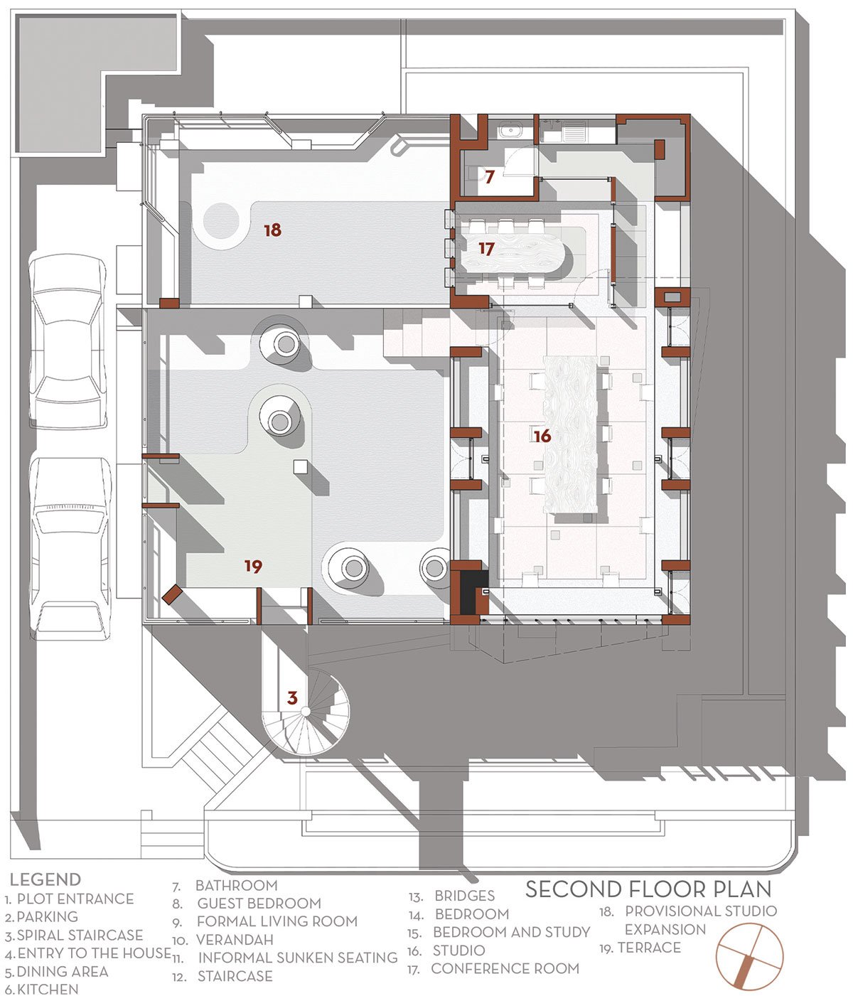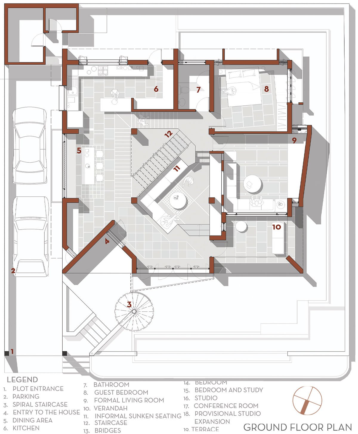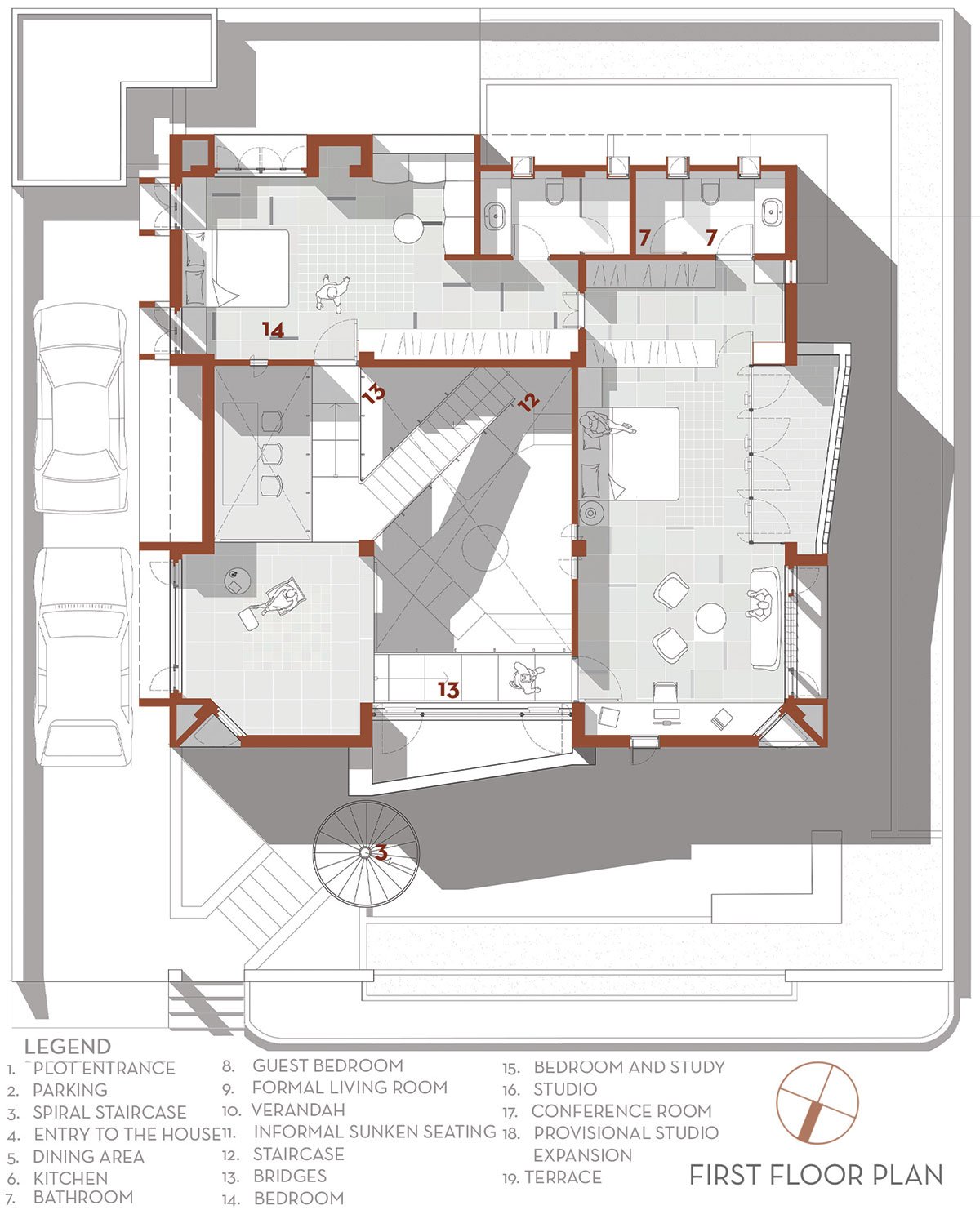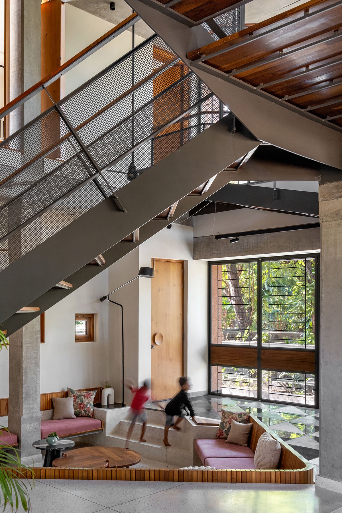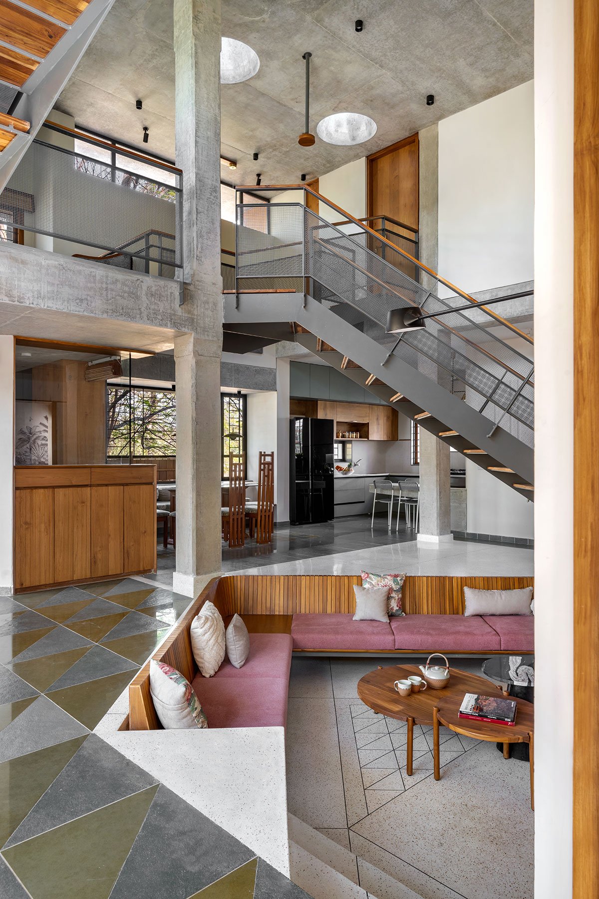 Further, as one progresses, the paths diverge into two of which one moves towards the kitchen and the other to the sunken seating in the centre of the house. This central seating is a double volume which visually connects the entire house and brings it together. It has been designed to be the most social and interactive space of the house. The staircase is a central element here which wraps around the sunk seating and stretches from one corner to the other in the form of bridges. The first floor consists of two bedrooms on the south and west side that overlook the double volume internally, thus creating a very visually connected space.