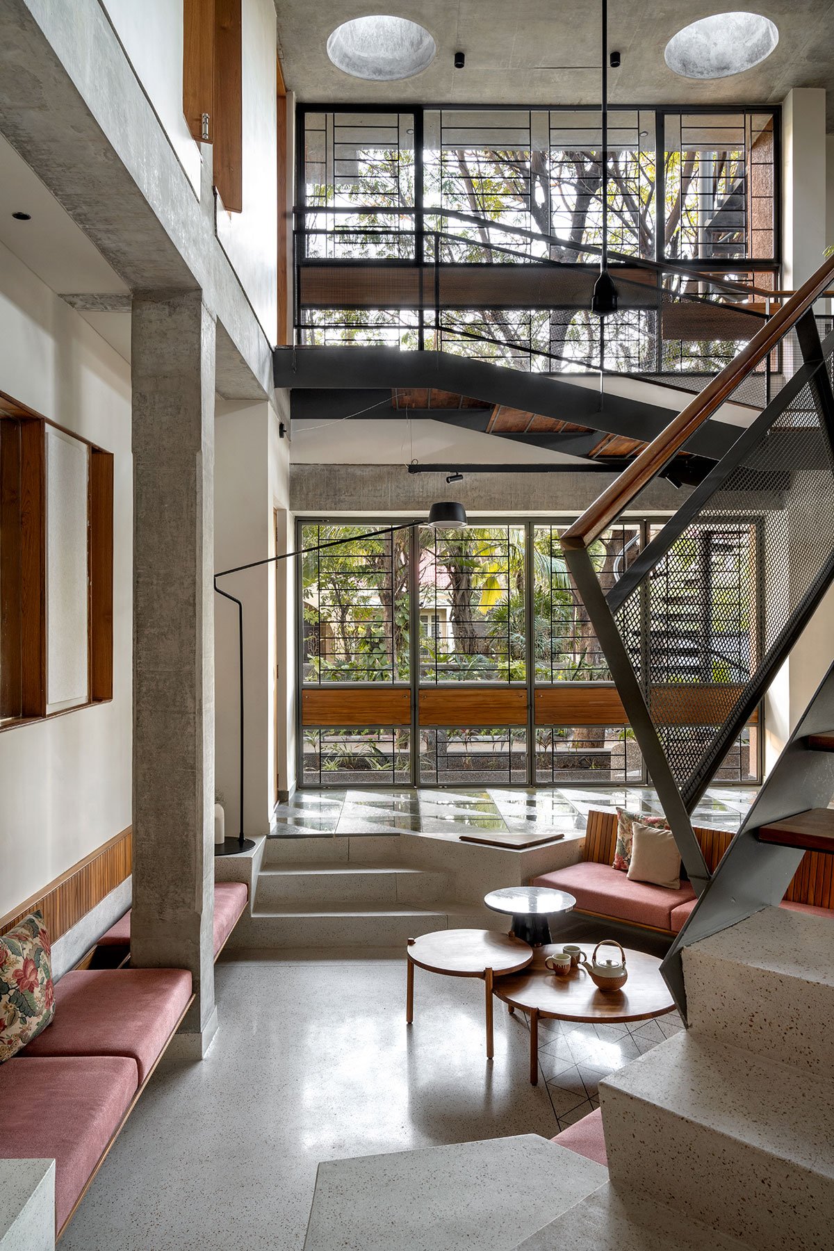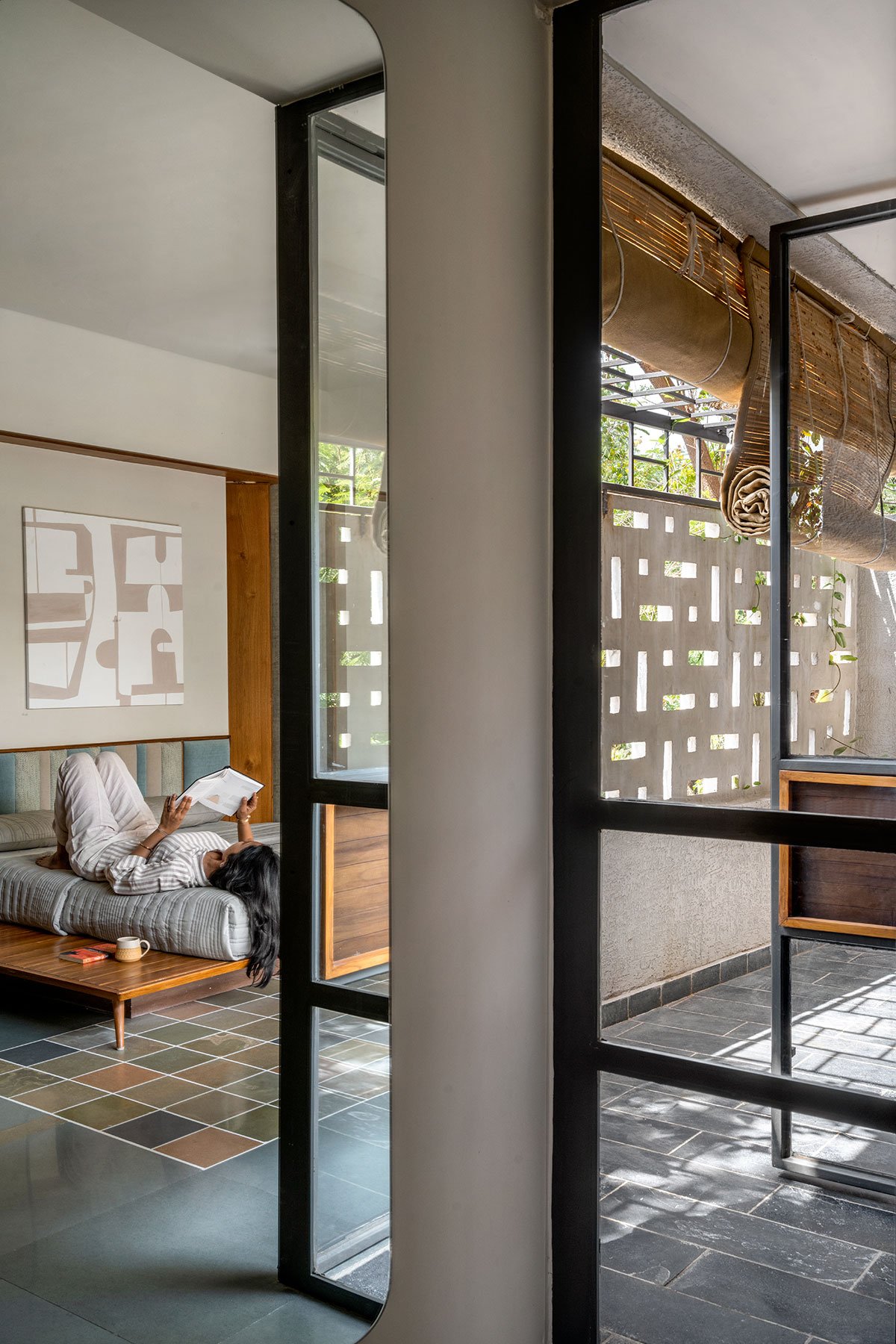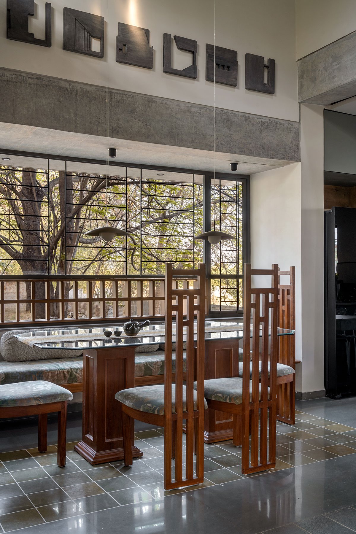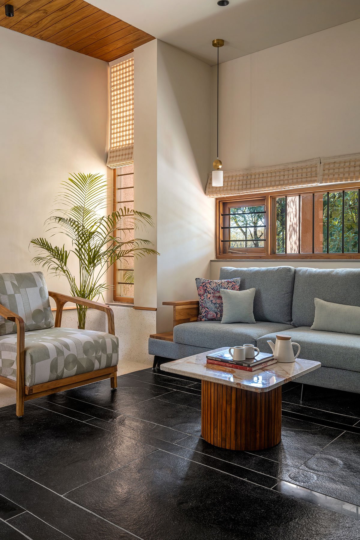 Keeping in mind such a brief the architecture responds to a variety of scales of spaces where one can unwind. This house thus responds to the climate and the life-style of the inhabitants. Use of kota stone and terrazzo for flooring, maximum wooden windows and inbuilt seatings was to keep the home timeless and user friendly.
