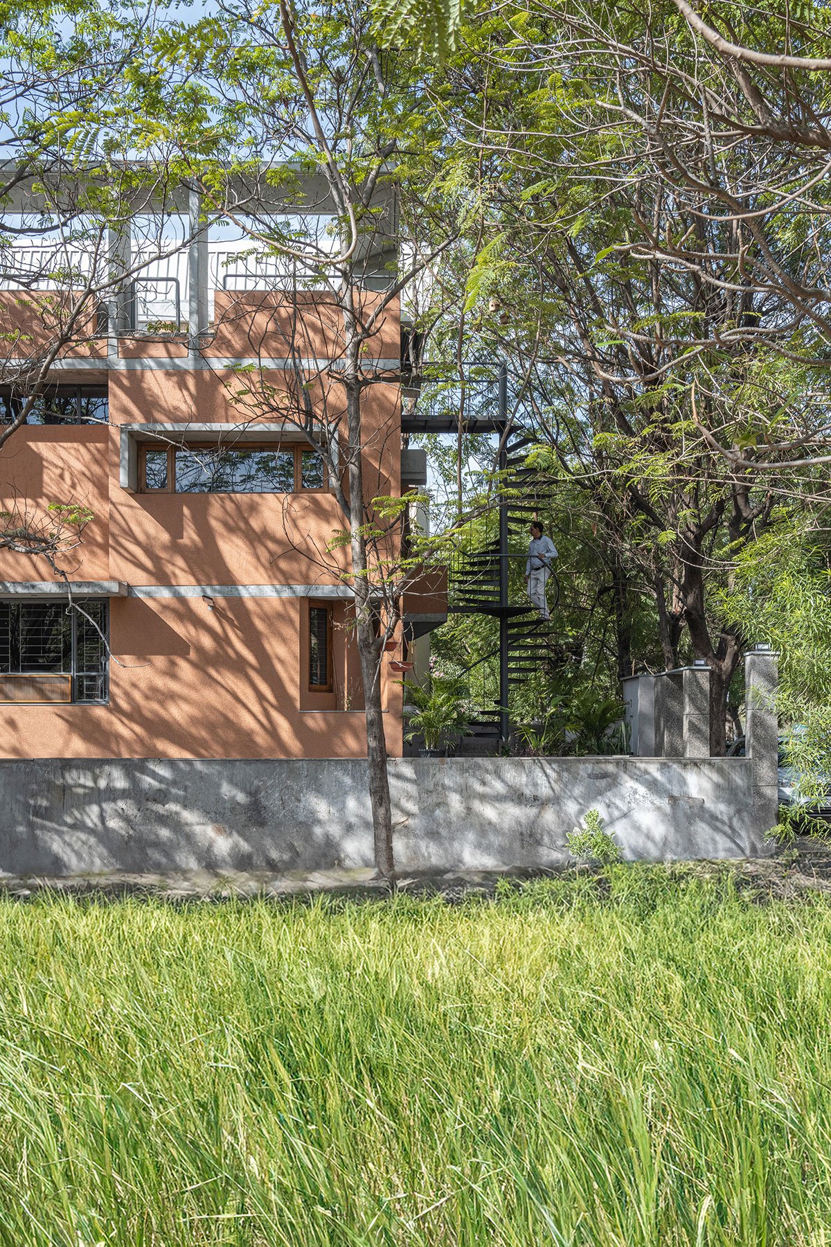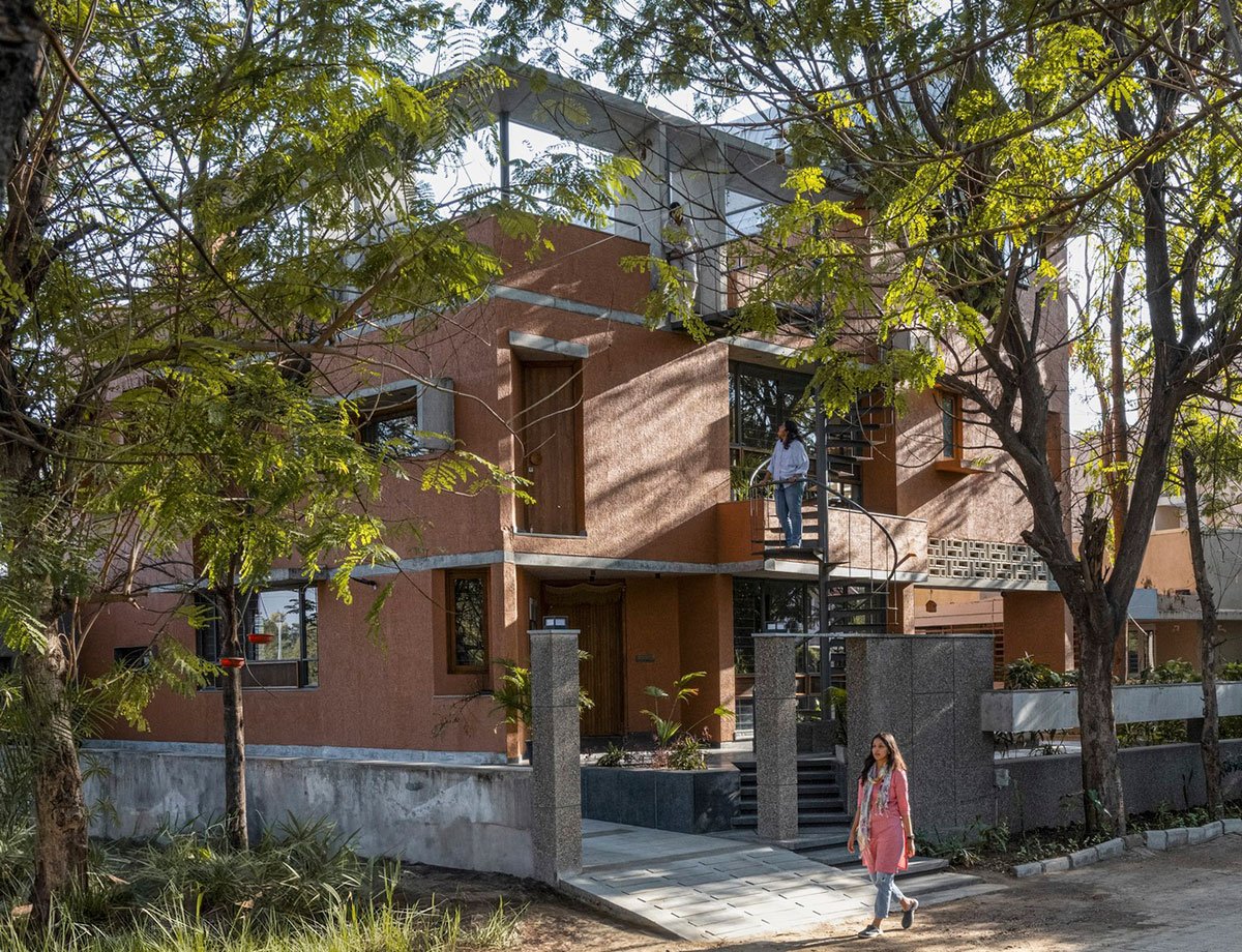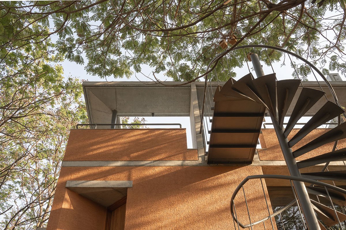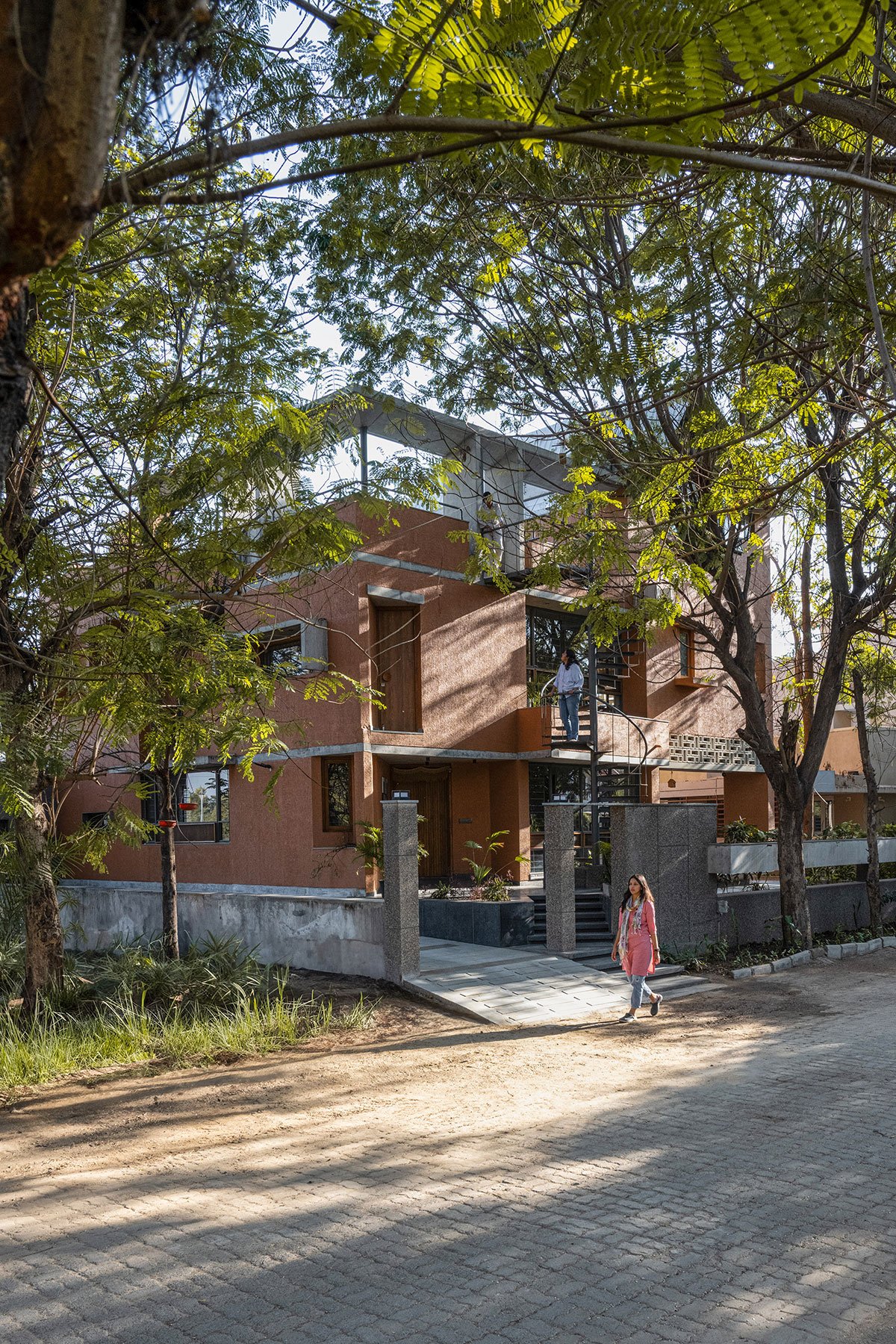 [Text as submitted by architect] The house, situated in the outskirts of west Ahmedabad, is surrounded by a canopy of the Peela Gulmohar trees. It has been designed for a family of four where the parents would spend their retired life while the children would be engrossed in developing their careers. Fundamentally, it had to respond to the needs of two generations where one can come together to enjoy each other’s company but also respect their time alone.