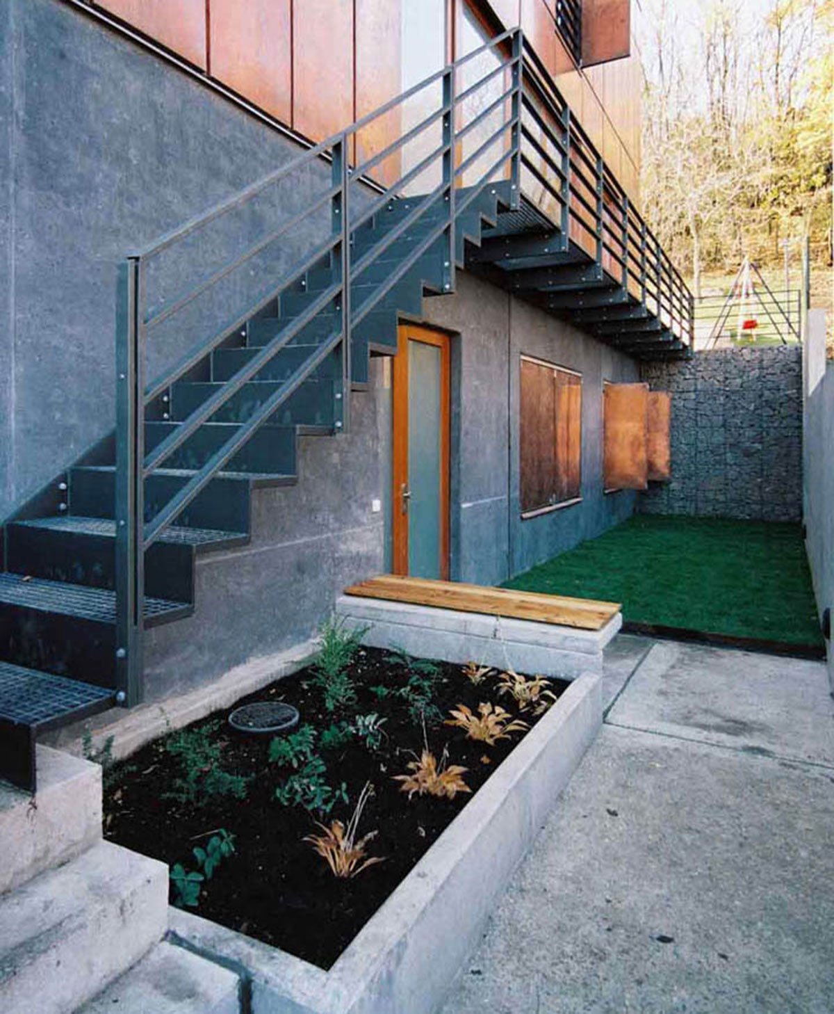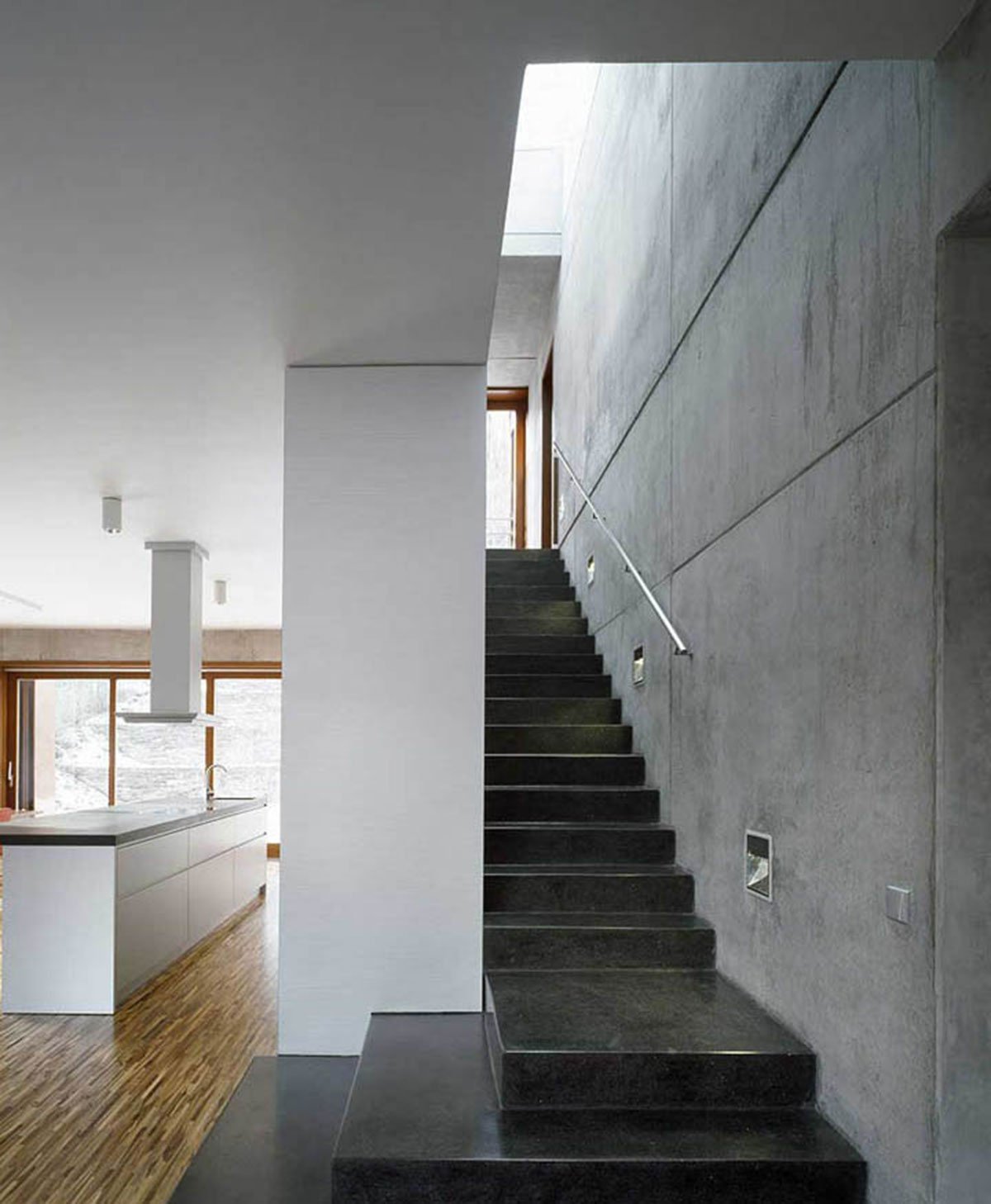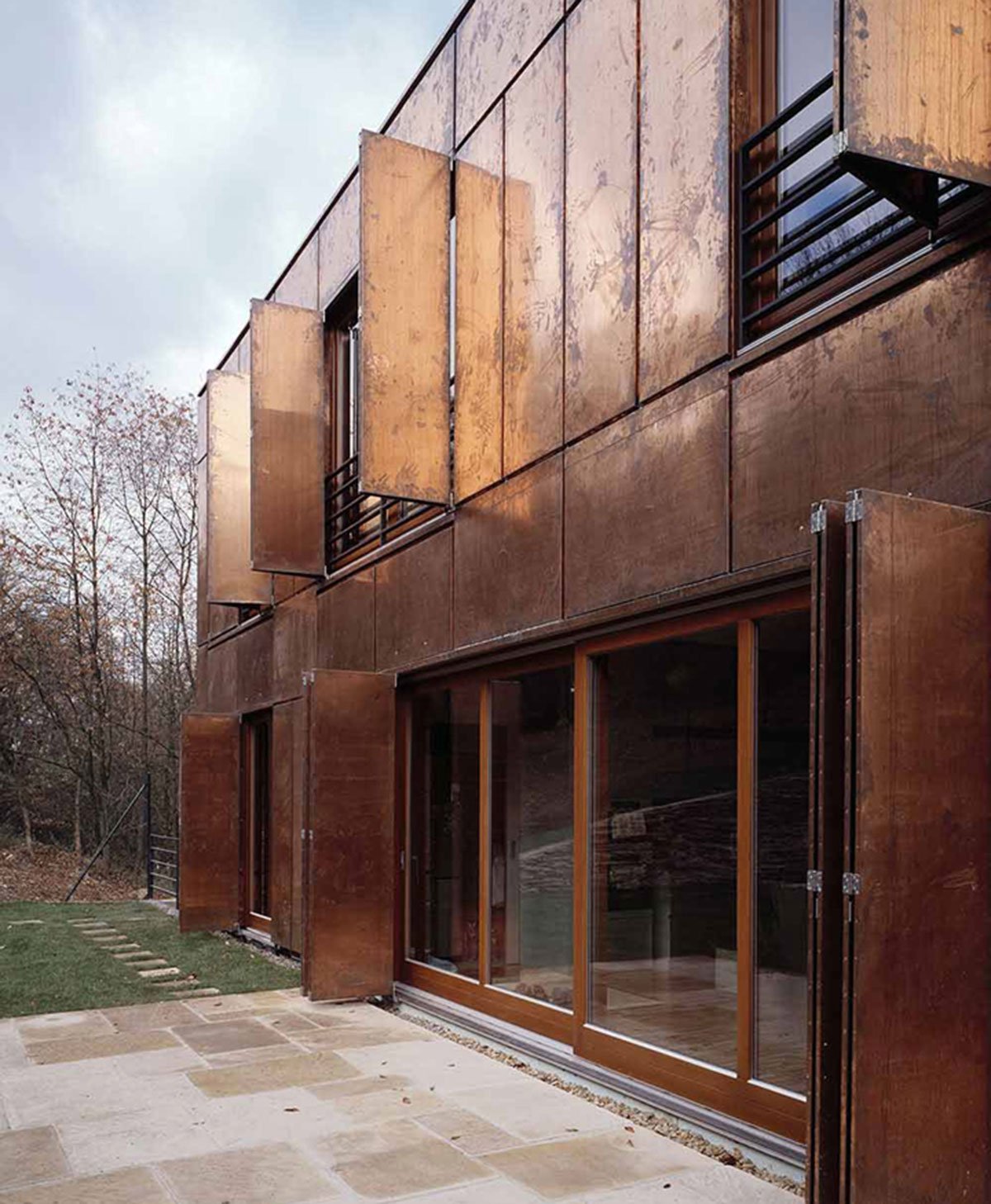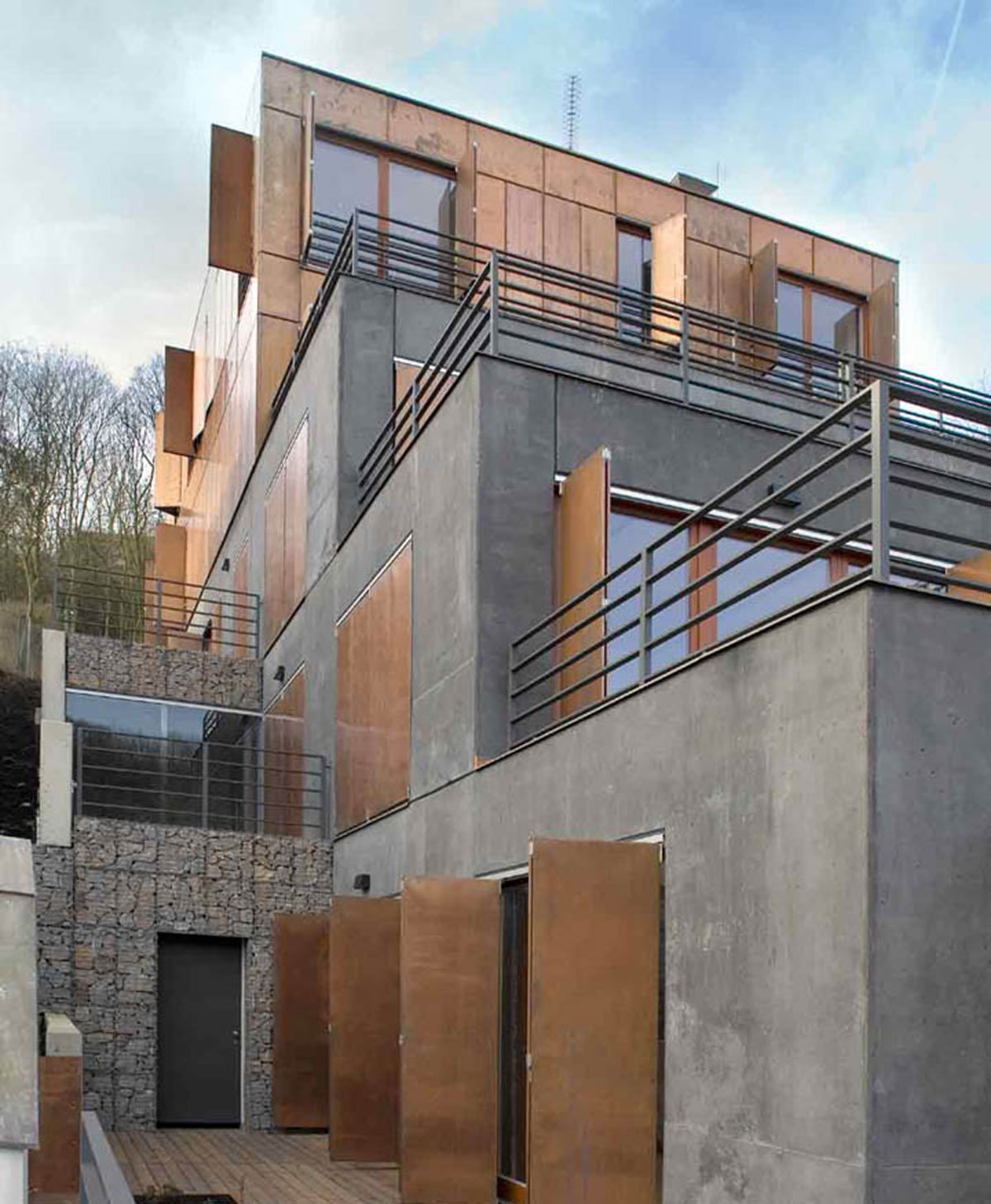 The house is articulated into two parts: the lower base sinked into the slope and the upper “crown”, which has the dimensions of a standard family house. The heavy lower part is made of dark coloured face concrete and refers to the slate rock under the house. The copper panels covering the upper part give it a light roof-like impression.