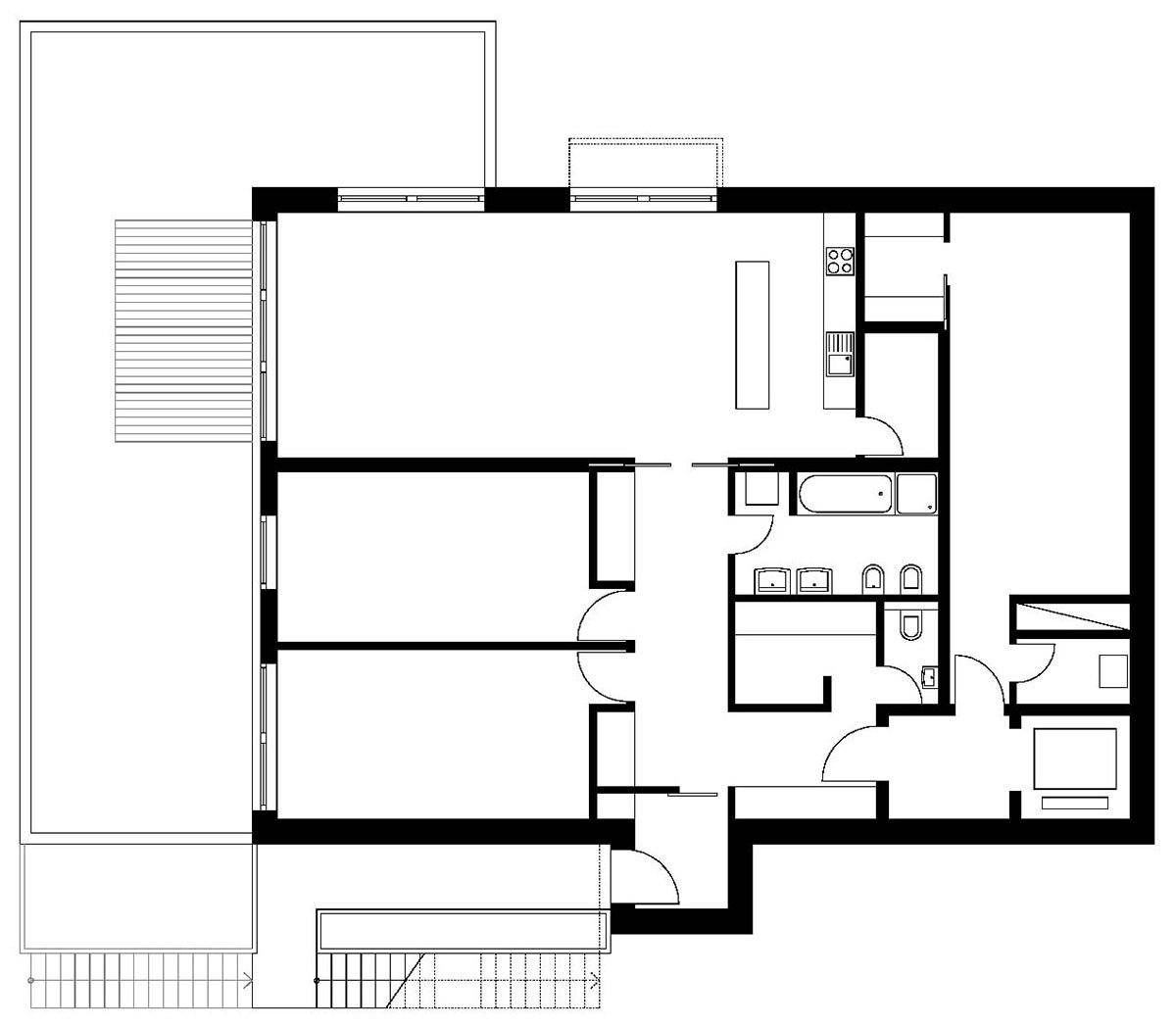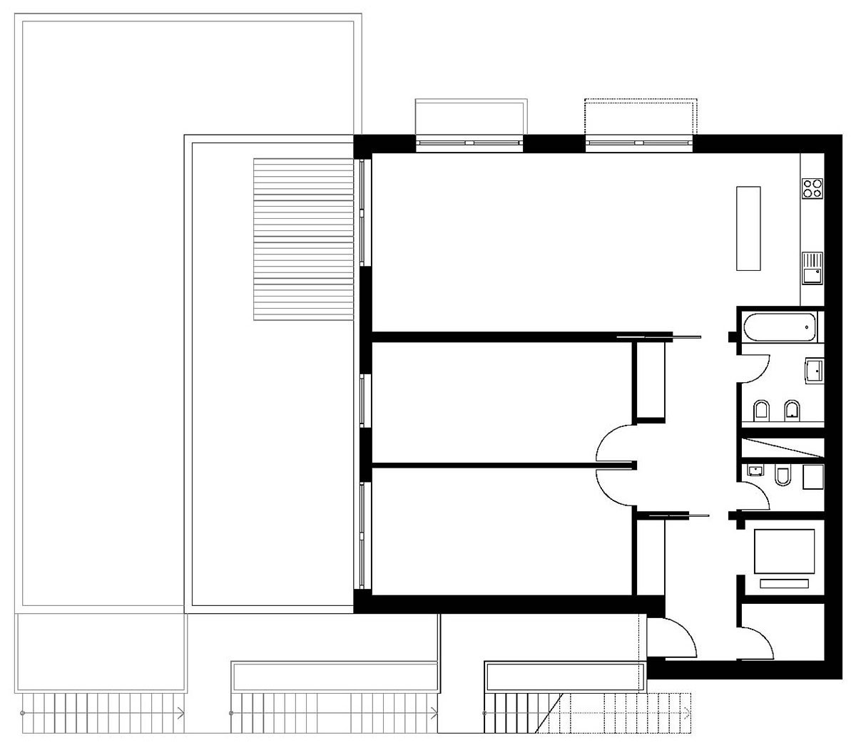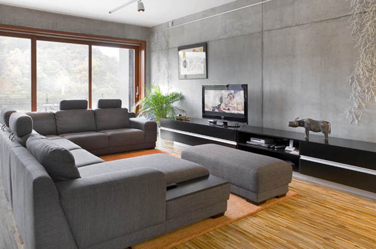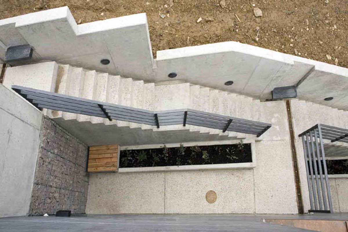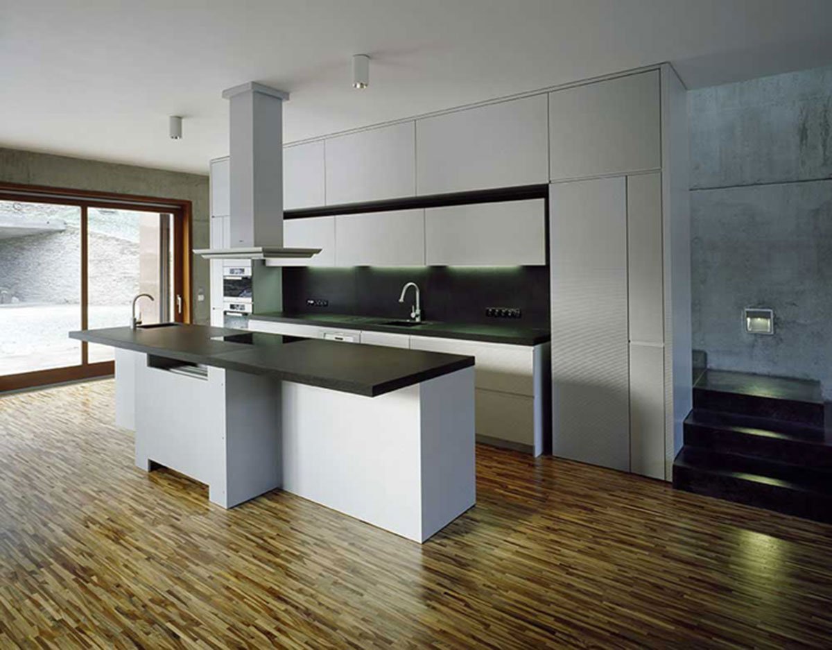 The house is articulated into two parts: the lower base sinked into the slope and the upper “crown”, which has the dimensions of a standard family house. The heavy lower part is made of dark coloured face concrete and refers to the slate rock under the house. The copper panels covering the upper part give it a light roof-like impression.