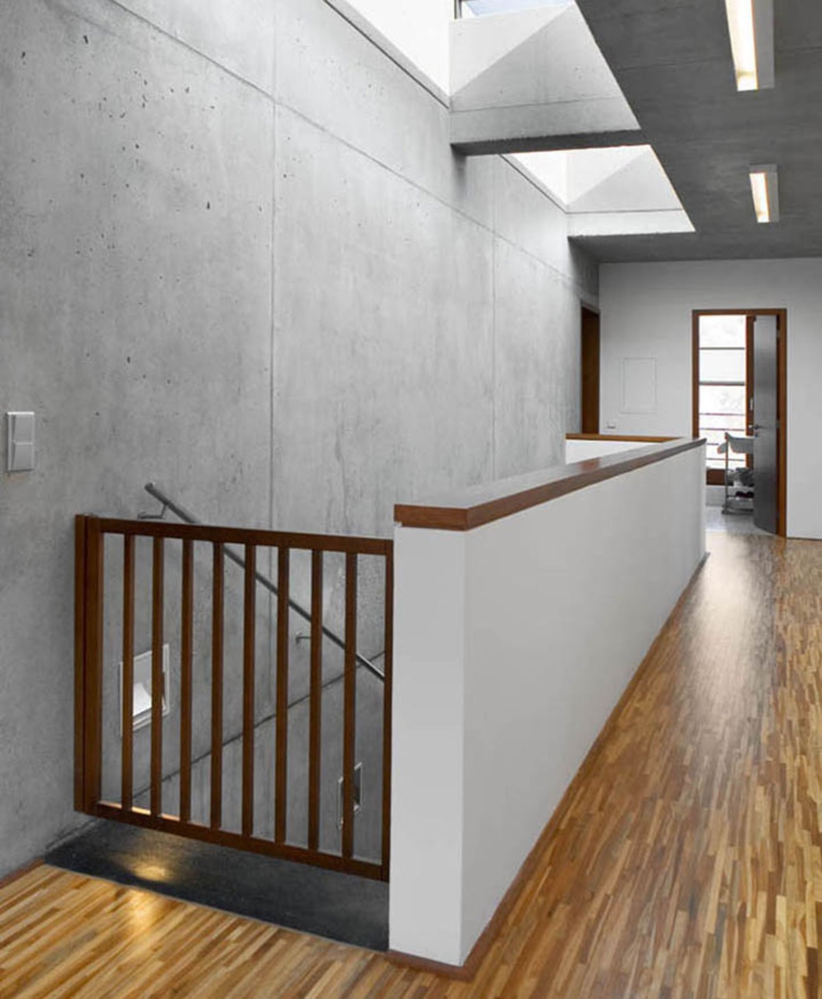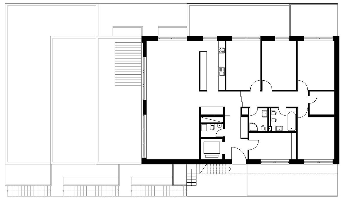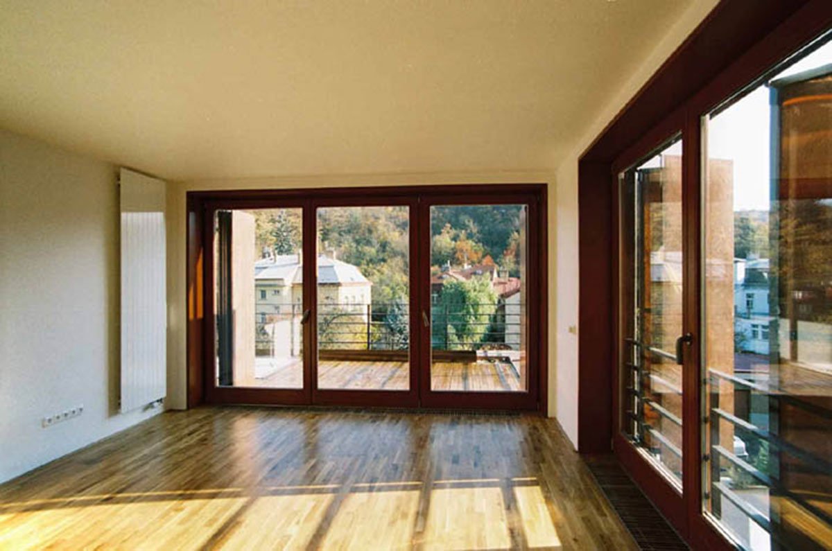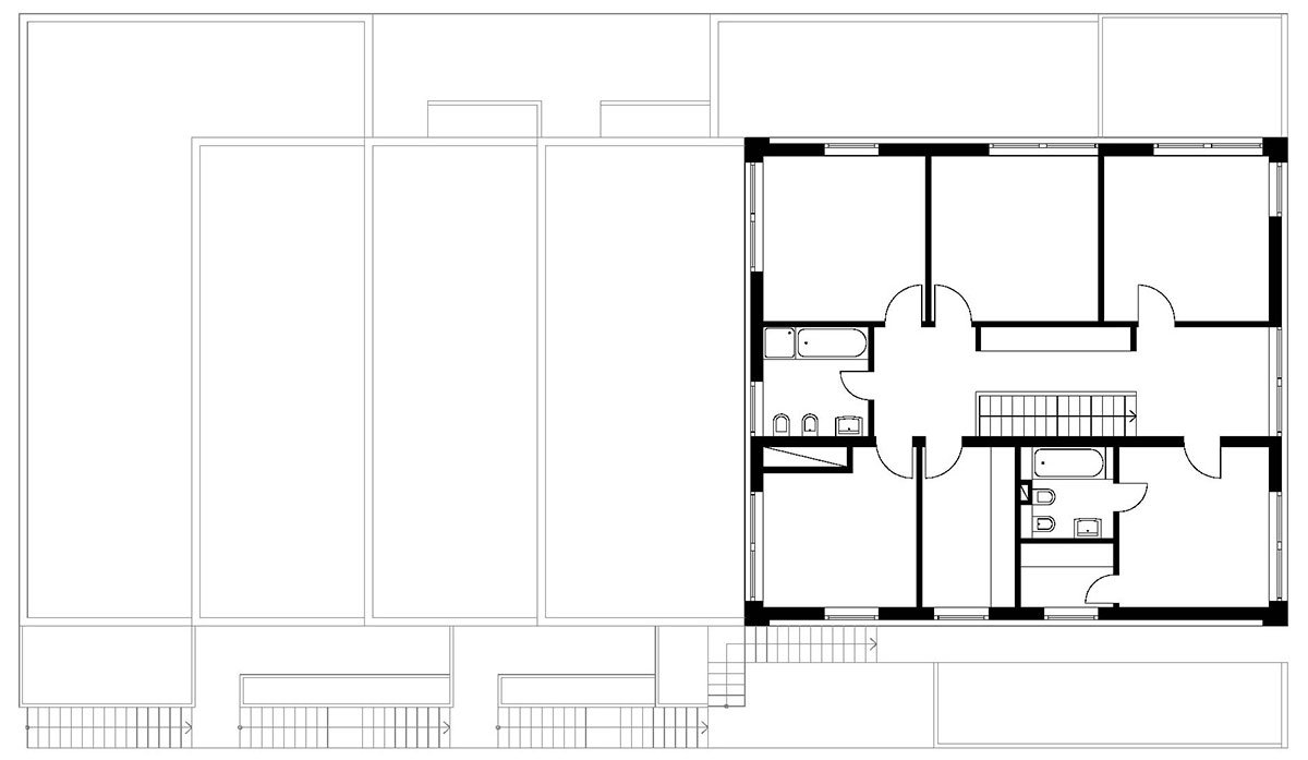 The house is divided into 4 apartments, of which one is an upper maisonette. There is a garage for eight cars, the entry lobby and small cellars for each apartment on the street level floor. The lift moves through the house and opens directly into each apartment; the stairway is located outside the house.