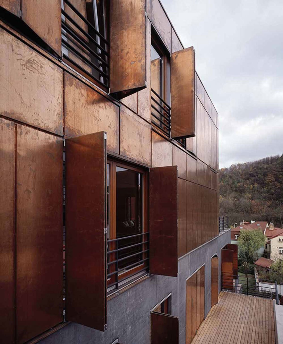 Excerpt: Terrace House by Pavel Hnilička Architects+Planners redefines hillside living by combining apartment efficiency with the quality of a family residence. Built into a steep slope, the concept of terraced structure assigns each unit a private roof garden, maximizing space and comfort. The structure contrasts a grounded concrete base with a light, copper-clad upper form, blending landscape, materiality, and modern living.