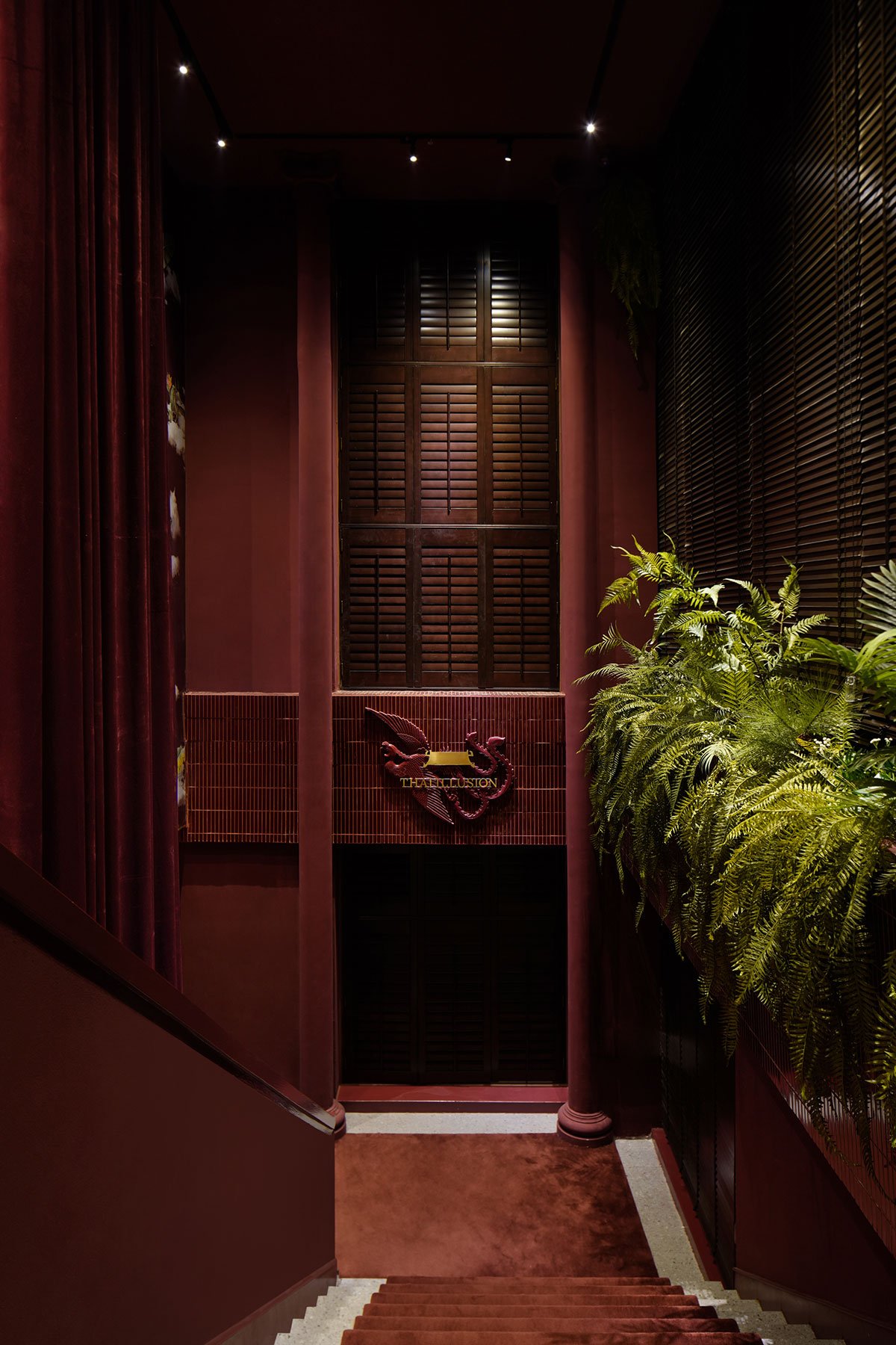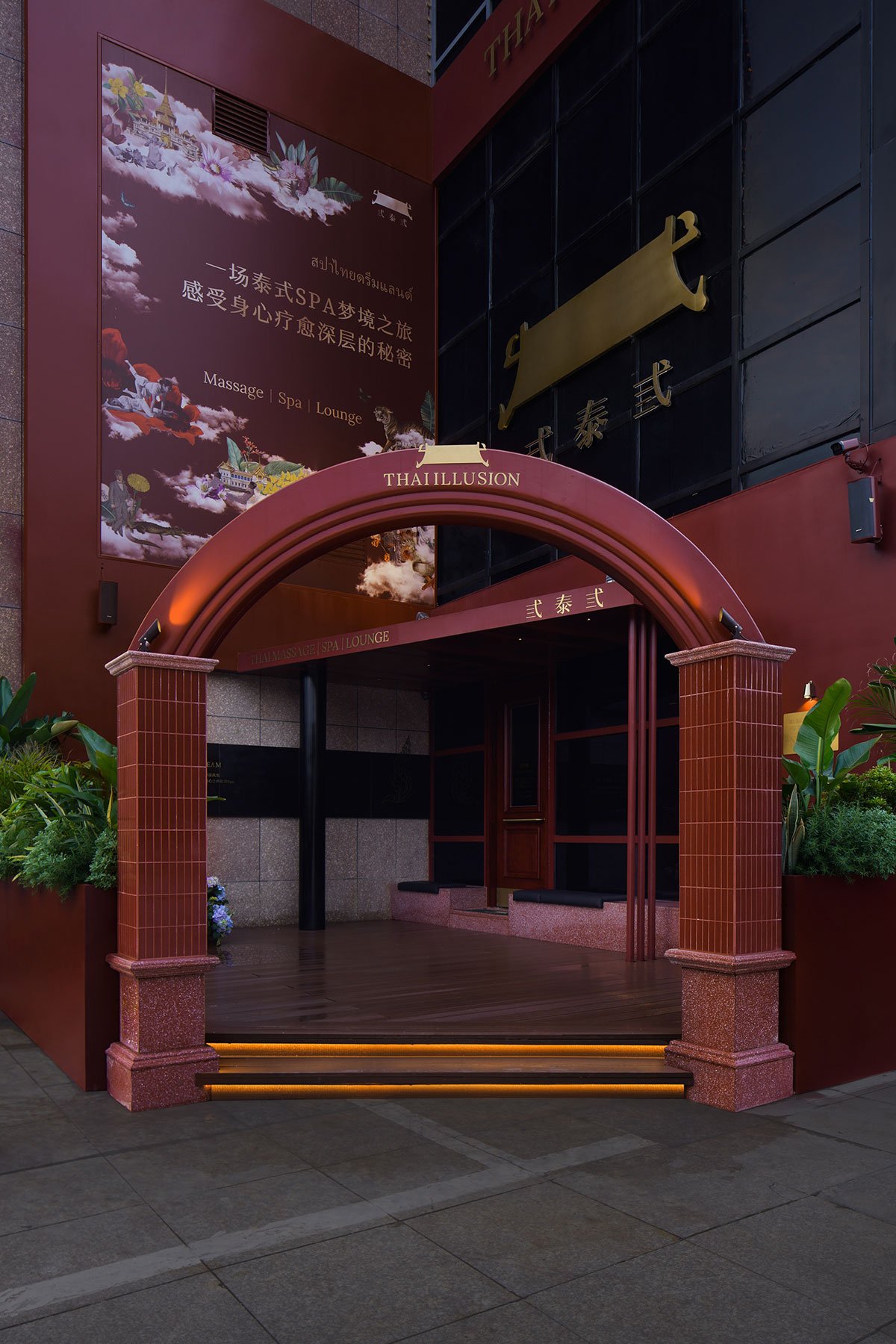 The whole space is around 913m2 with two floors. The ground floor is an overflow space for guests to access the first floor, which is smaller in size. Because of the long path to reach the next floor, this part was designed to be the most visually intense area. The space uses dark red in different materials, not only the texture of retro advanced, and leaves an unforgettable visual impression. Meanwhile, the sound of gently flowing water and the soothing scent of premium lemongrass hit the senses from a different dimension. It gives guests the feeling that they are being wrapped in a heavenly experience when they push open the door of THAIILLUSION.