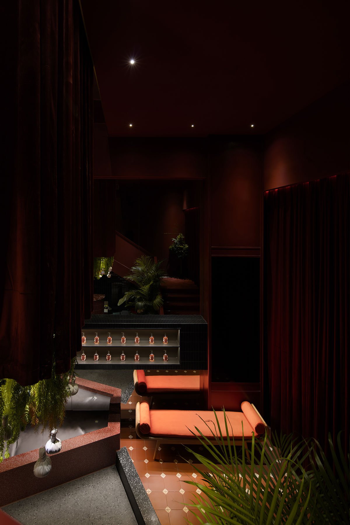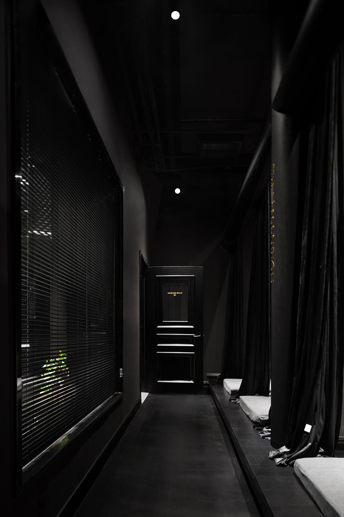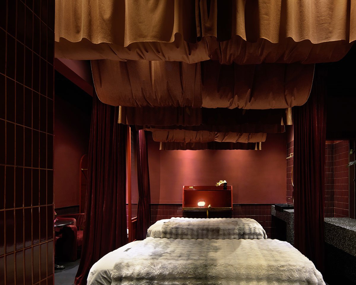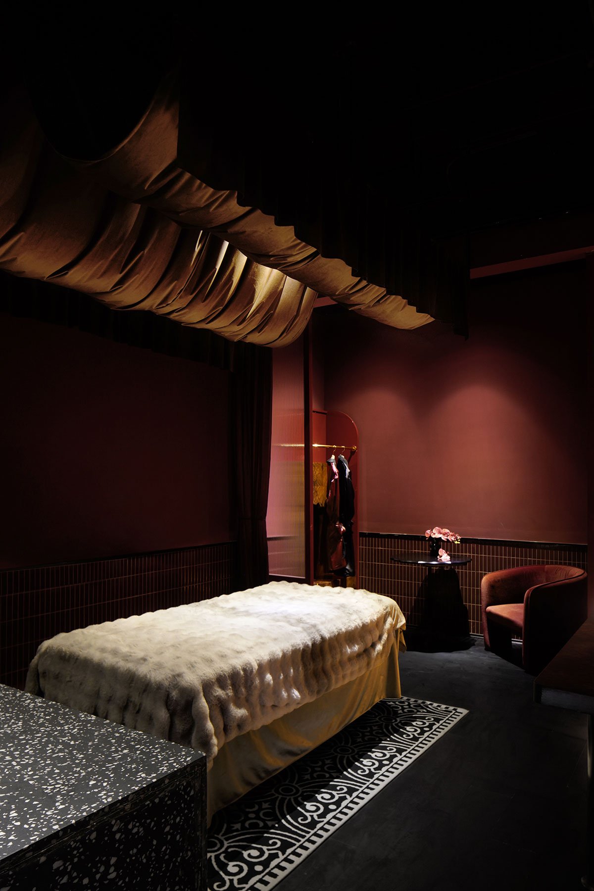 A gorgeous dark red runs through the entire front area. The space is decorated with English and French architectural lines. According to the reflection and refraction of different angles of mirrors, it brings guests a psychedelic illusion experience. Covered in terrazzo, carpets, heavy fabric curtains and matte lacquer, it creates a calming atmosphere that allows guests to relax and embark on an exotic spiritual healing journey.