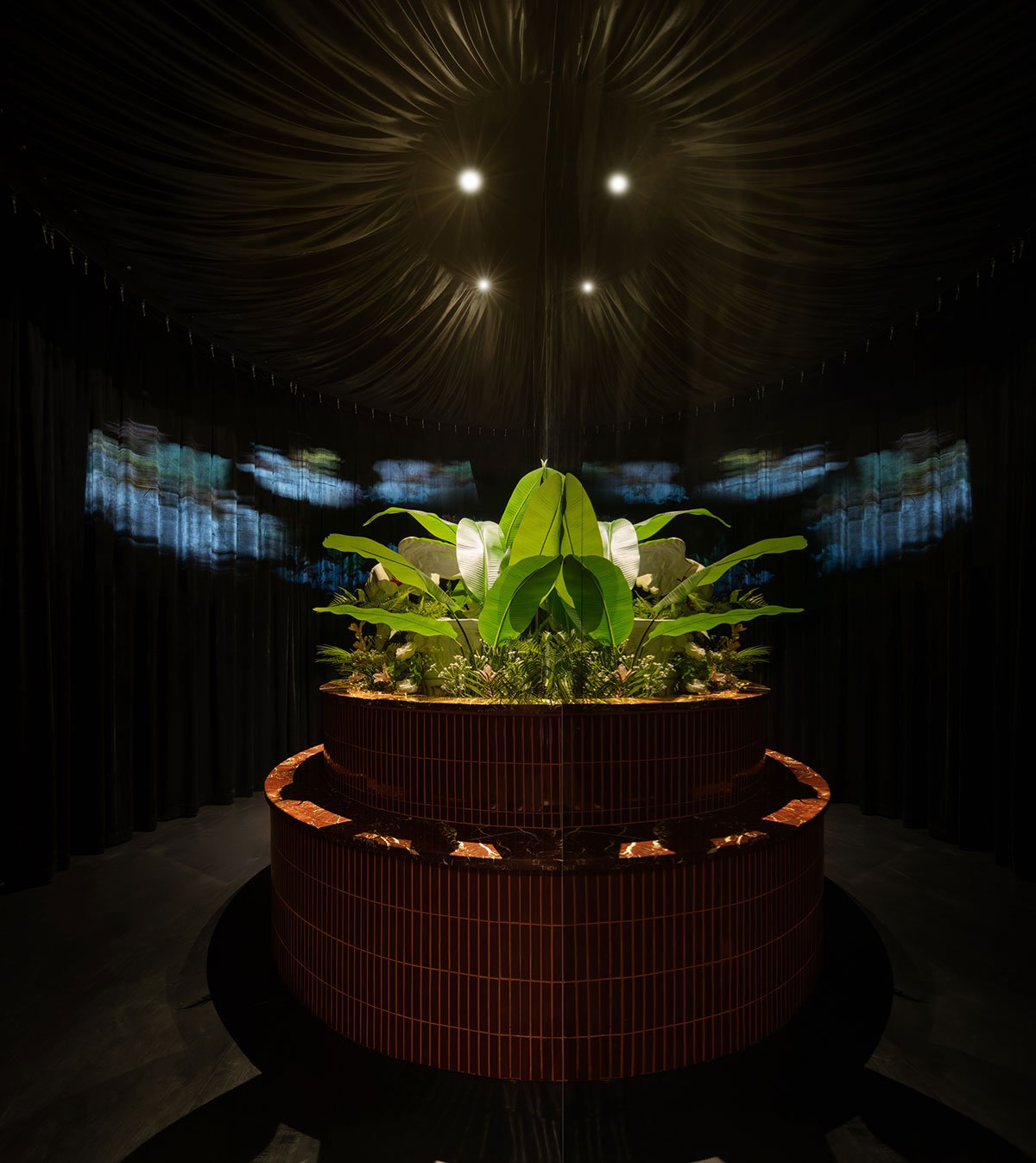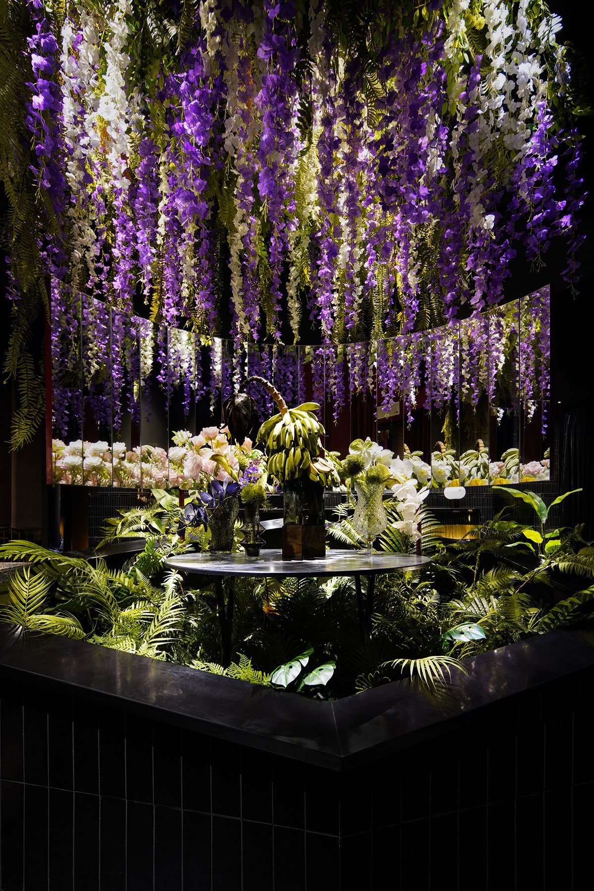 Dark and quiet: The enthusiastic colours of the flowers gradually transit into the quiet city forest. Tropical greenery is interspersed throughout the space, with dark lighting and colour tones to provide a peaceful and relaxing atmosphere, building a natural healing space.
