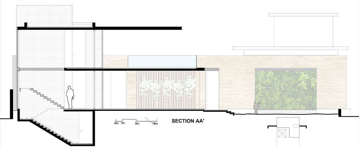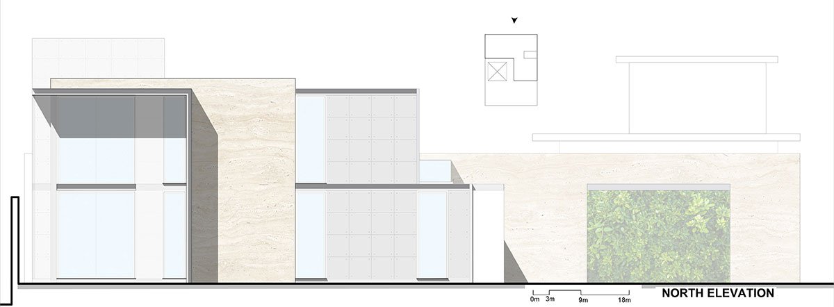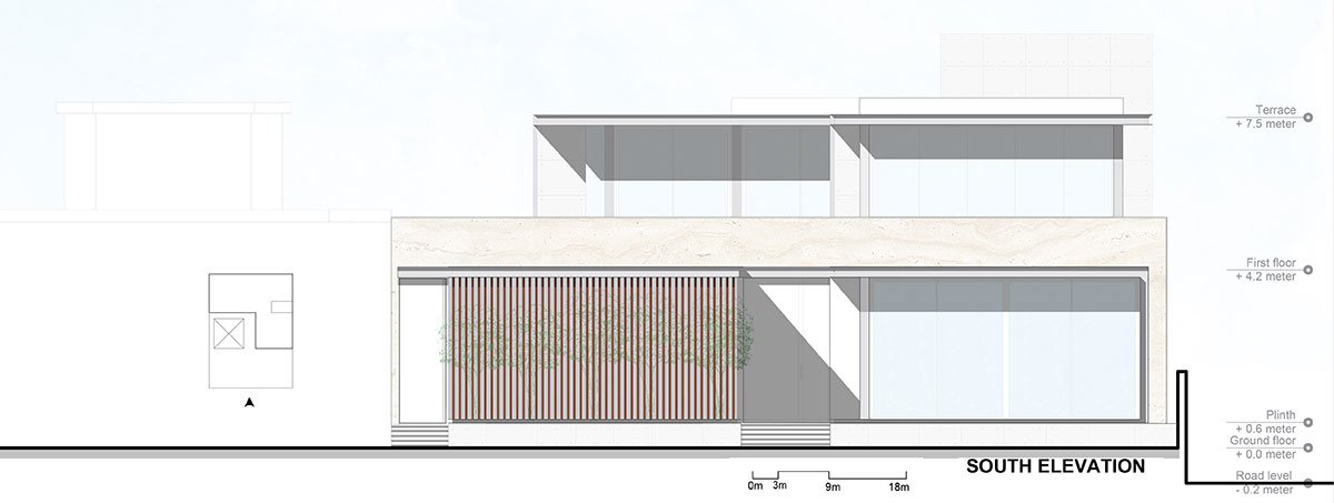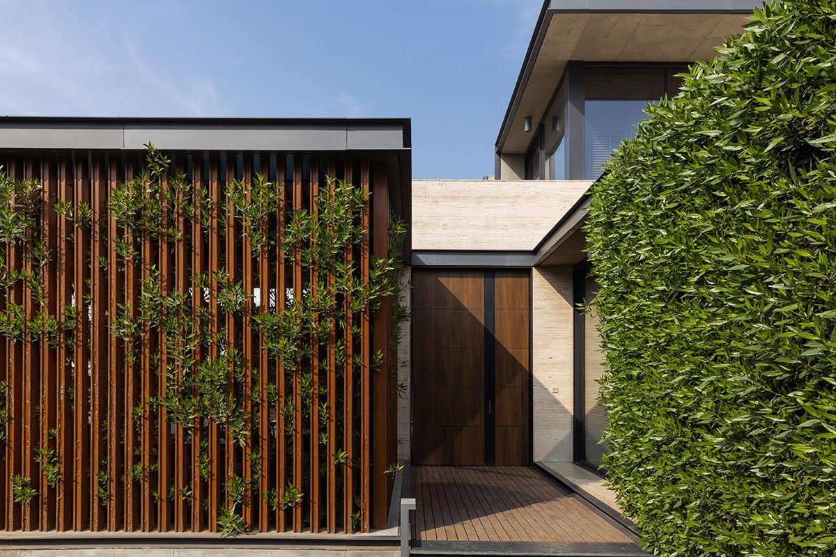 Exemplifying a modern aesthetic, the house sits as a sleek, elevated structure juxtaposed against a monolithic expression of travertine stone accentuated by subtle hints of concrete, metal, and wood detailed to perfection. Inspired by traditional Indian homes, the spatial layout centers around a semi-covered courtyard. Enclosed by family spaces and an adjoining lawn, this central courtyard acts as the heart of the abode.