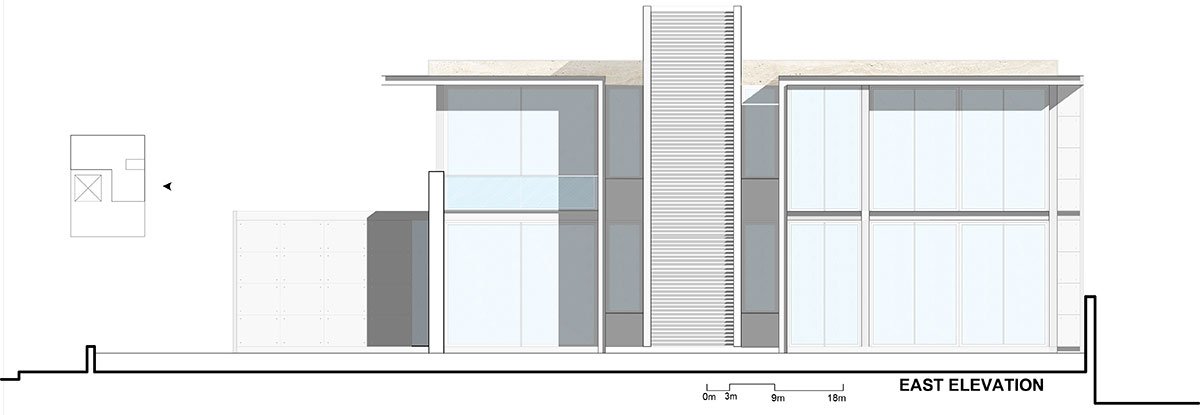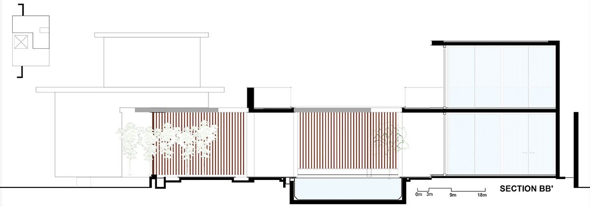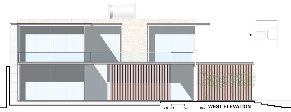 The upper level of the dwelling, showcases a captivating combination of glass, wood, and floating concrete canopies, adorned with metal accents along their edges, and is dedicated to private quarters that overlook the courtyard and pool. Abundant windows provide panoramic vistas that seamlessly connect the interior and exterior spaces. The compound wall, utilizing locally sourced stone as cladding and in gabion form, creates a sense of tranquillity and seclusion, shielding the abode from the clamour of the bustling street and creating a peaceful haven.