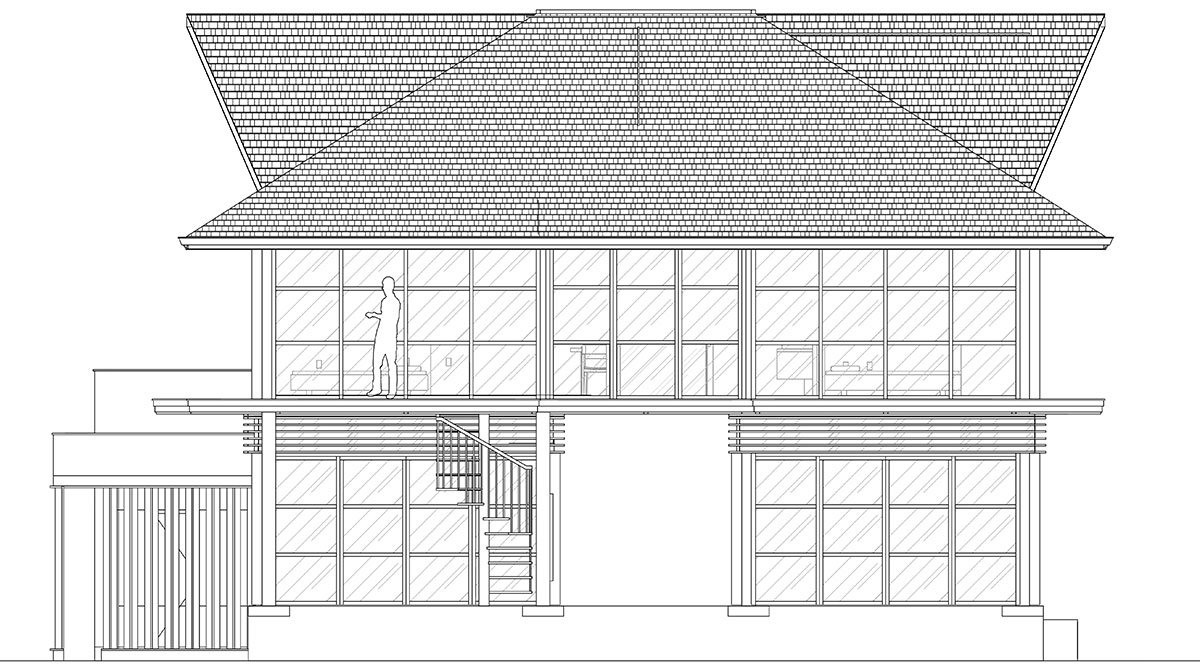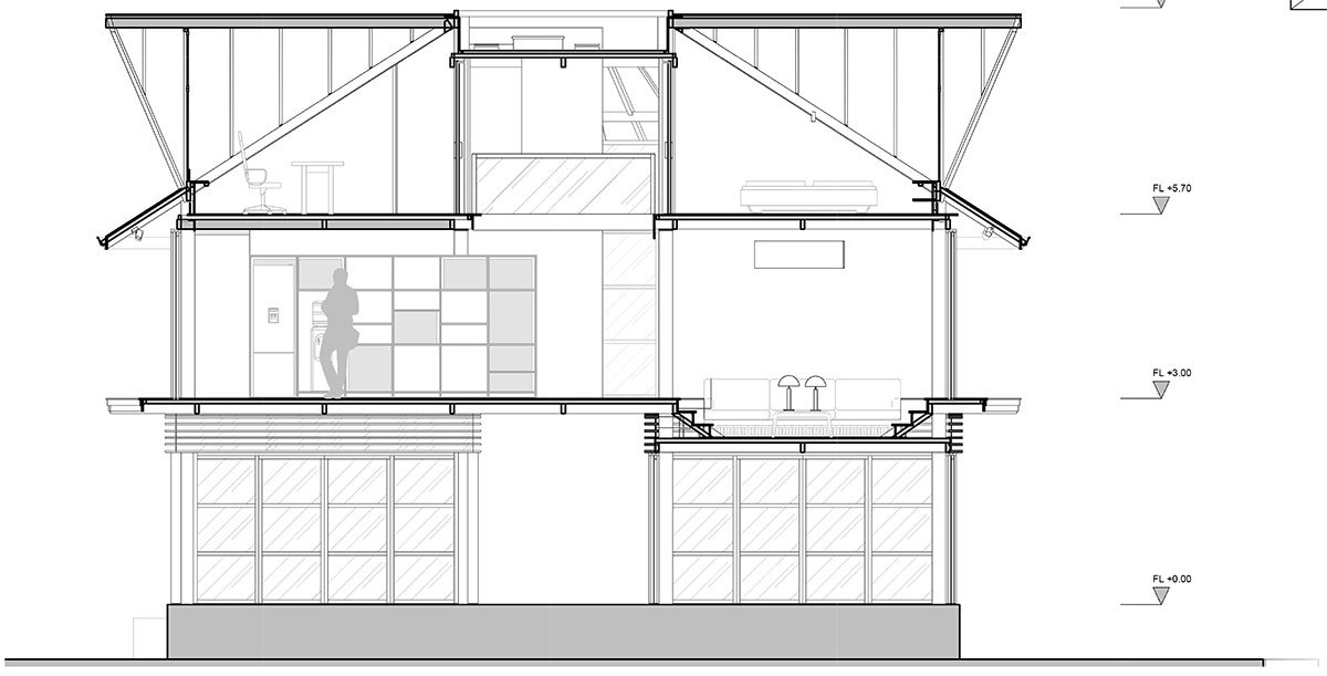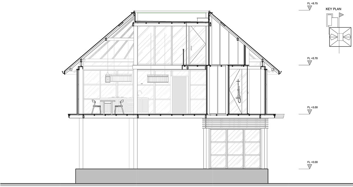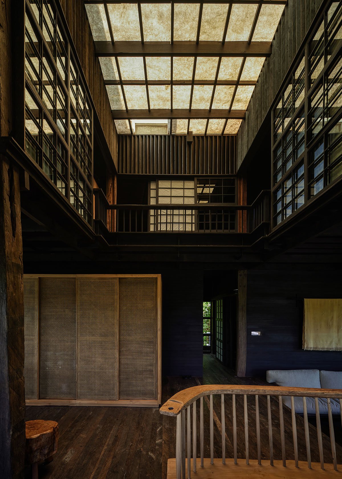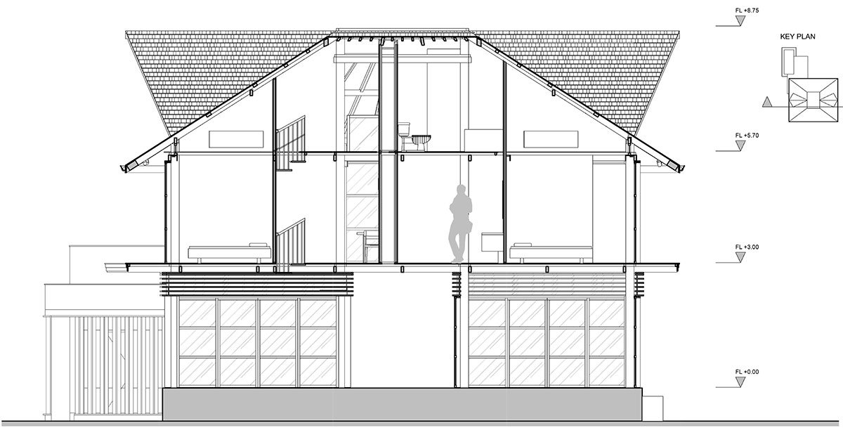 The major achievement of the timber craftsmanship, and thus the essential design idea was to incorporate these uneven building components into a functioning framework for walls, stairs, balconies and sliding windows and doors. Built over three levels, the floor plan and section strengthens the three dimensional experience of space composed around those columns.