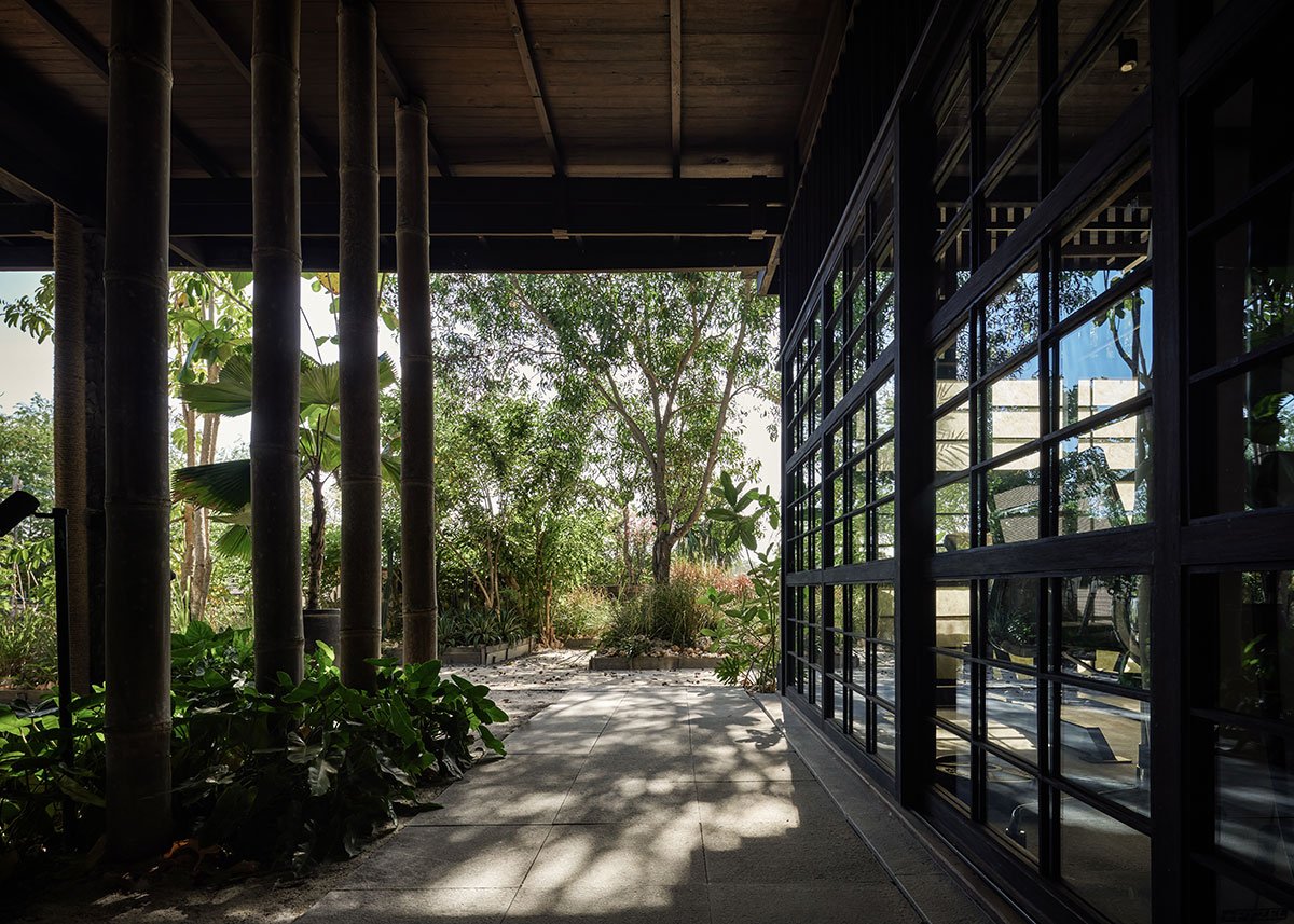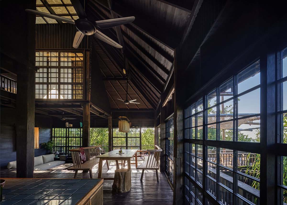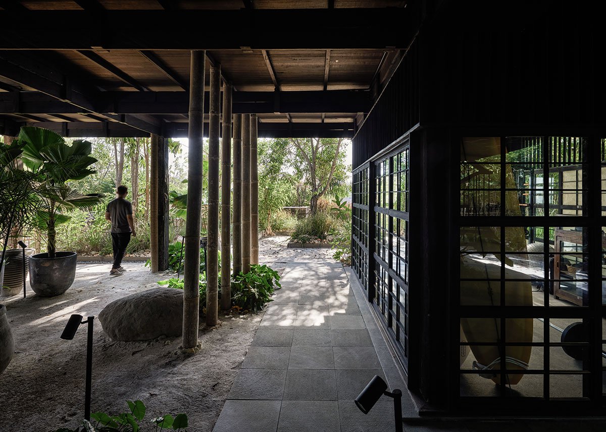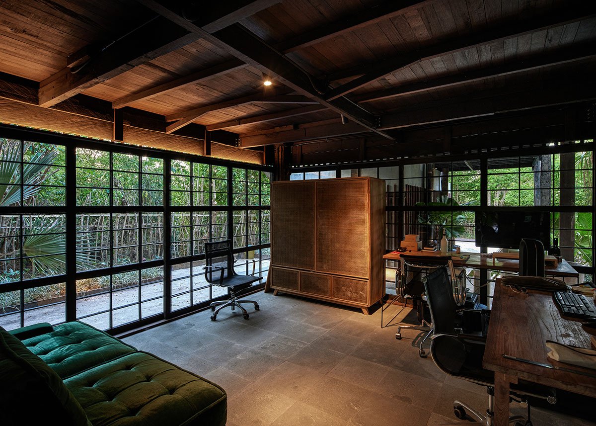 Evenly milled iron wood planks become the partition walls between the puristically designed spaces. No walls interrupt the building’s transparent circumference. The partitioned window elements define the correlation between inside and outside in a rhythmic way. Window partitions are in part obscured by paper screens made of banana fibre, handmade in Bali by an expat Japanese.