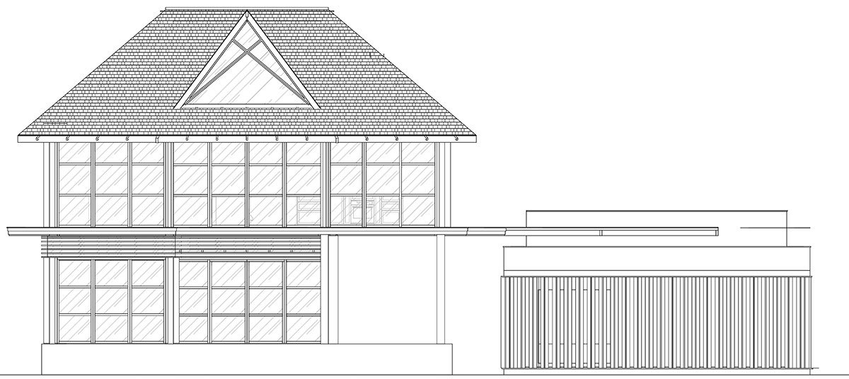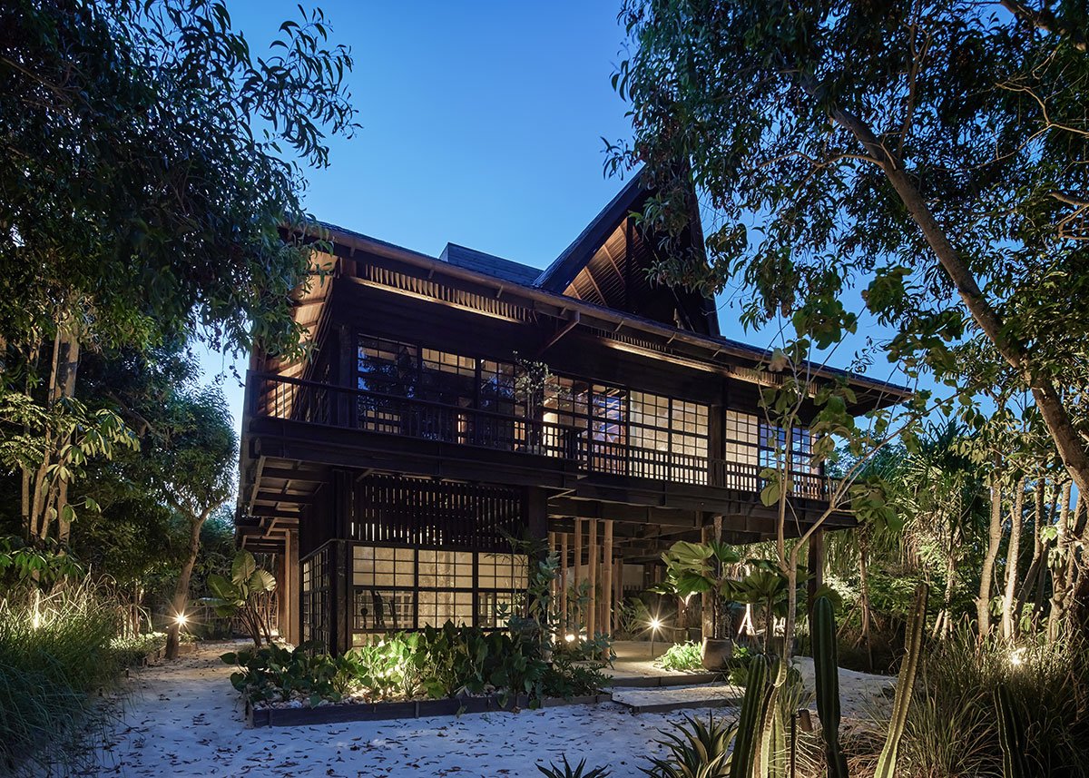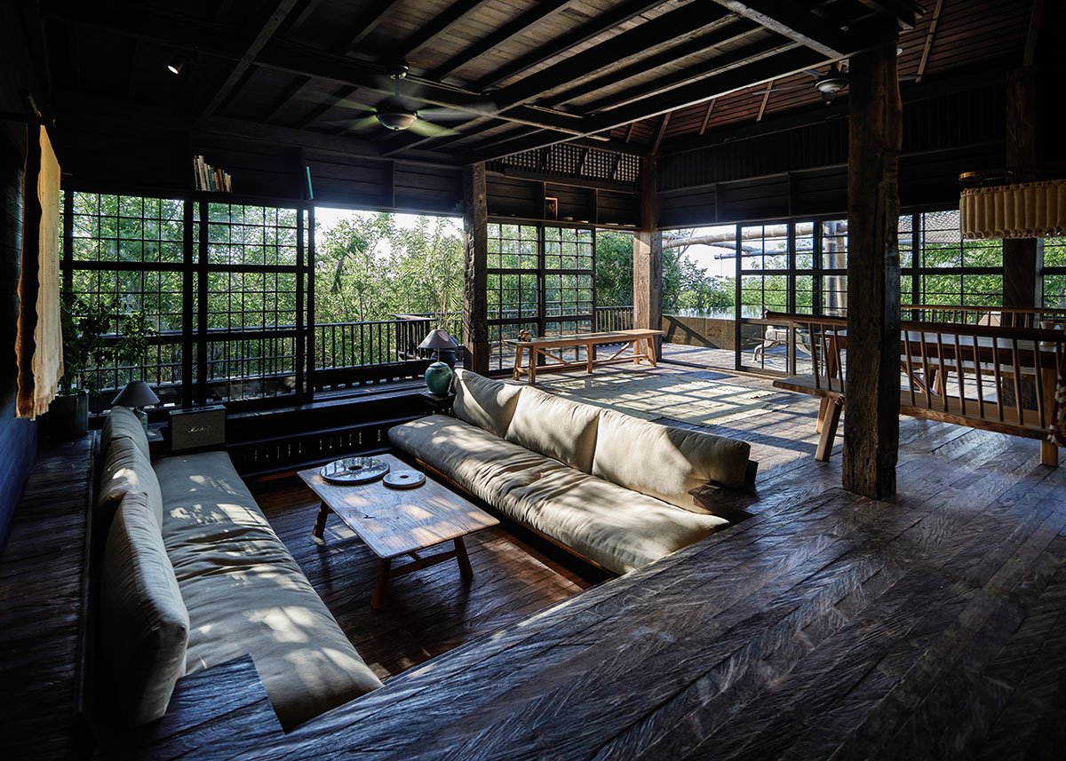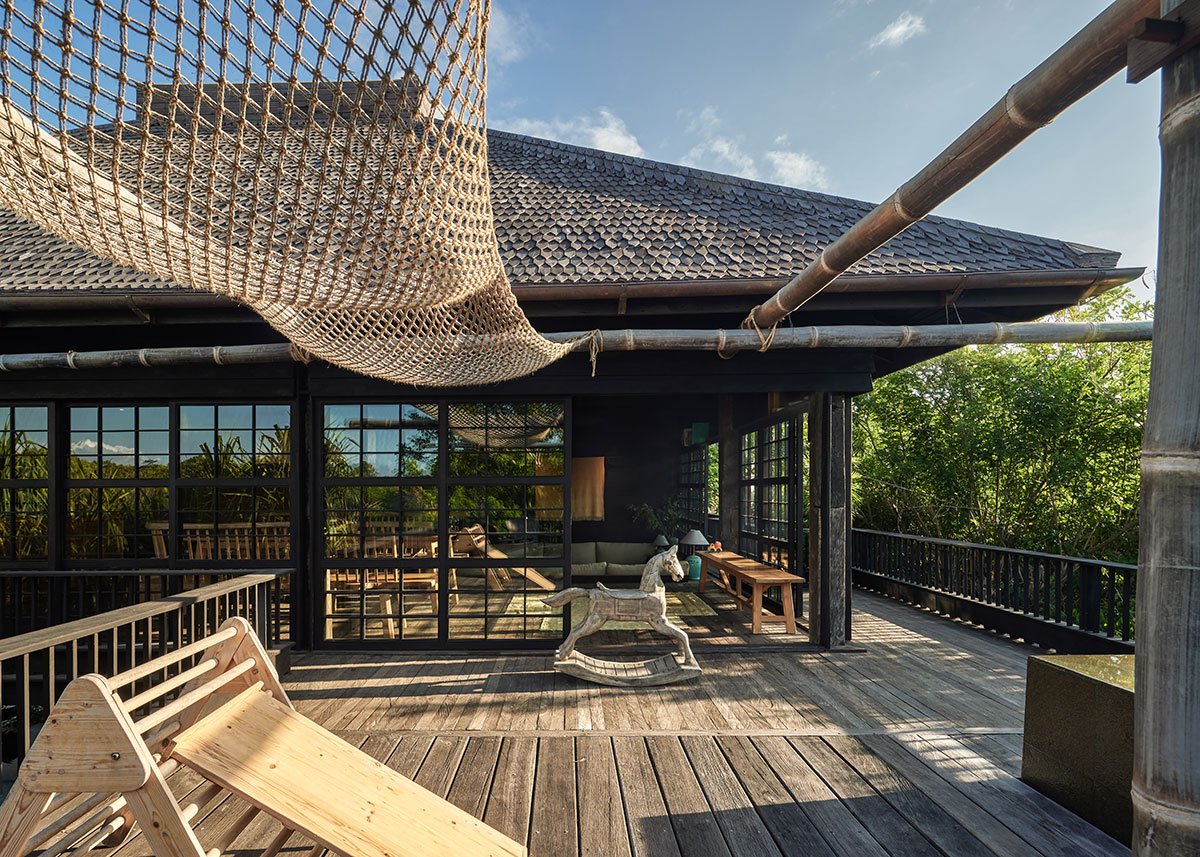 Evenly milled iron wood planks become the partition walls between the puristically designed spaces. No walls interrupt the building’s transparent circumference. The partitioned window elements define the correlation between inside and outside in a rhythmic way. Window partitions are in part obscured by paper screens made of banana fibre, handmade in Bali by an expat Japanese.