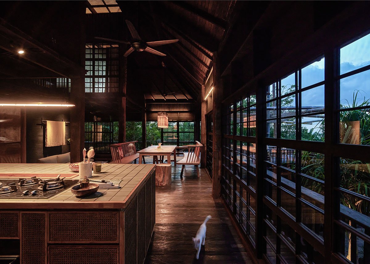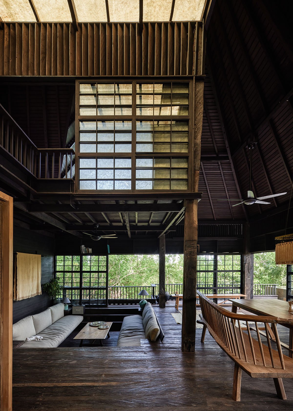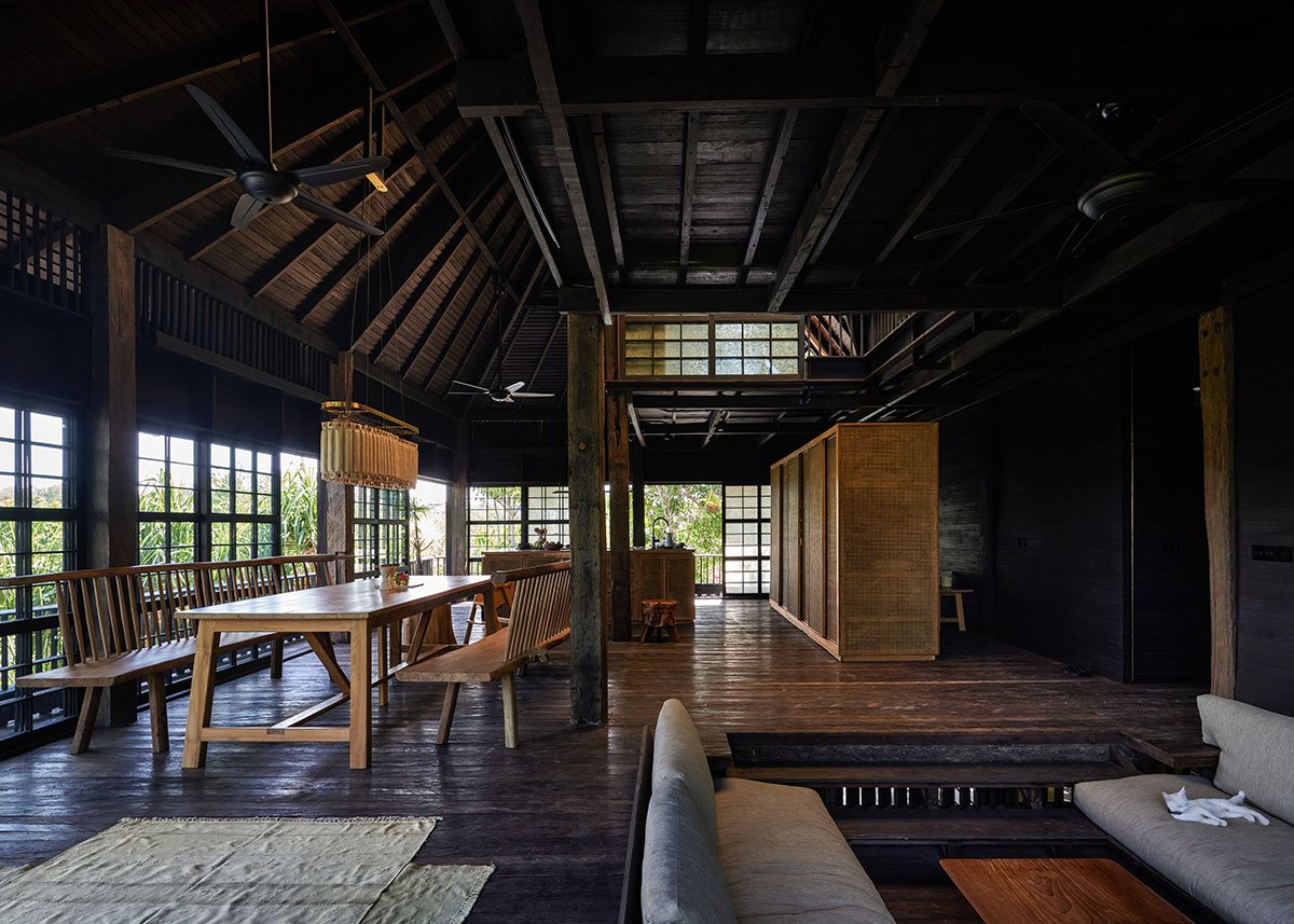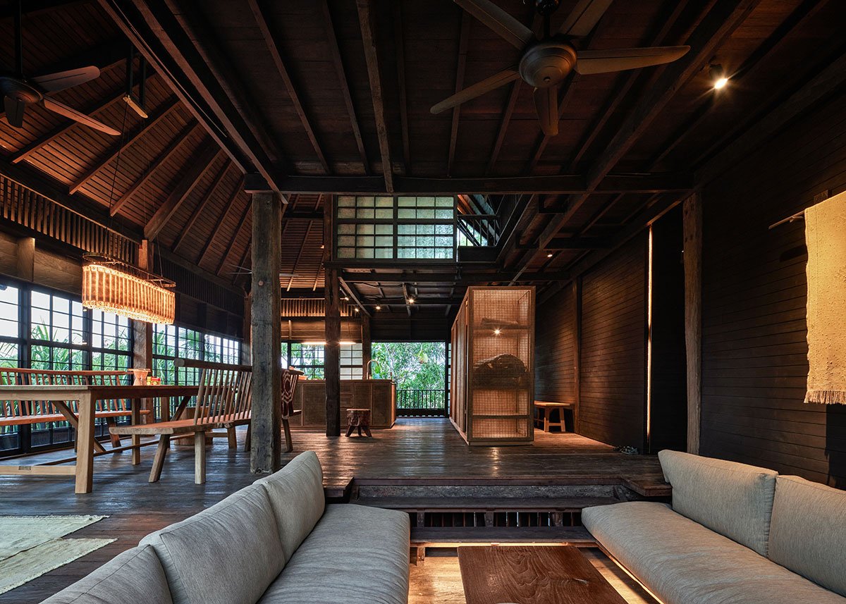 Excerpt: The Barn, a residence by Alexis Dornier, is constructed mainly from ethically sourced reclaimed timber (kaltimber). Featuring 16 curved columns that once were part of a road in Borneo, they are integrated into a functional structure that supports walls, stairs, balconies, and sliding doors. Built over three levels, the design highlights a three-dimensional spatial experience centered around these unique columns.