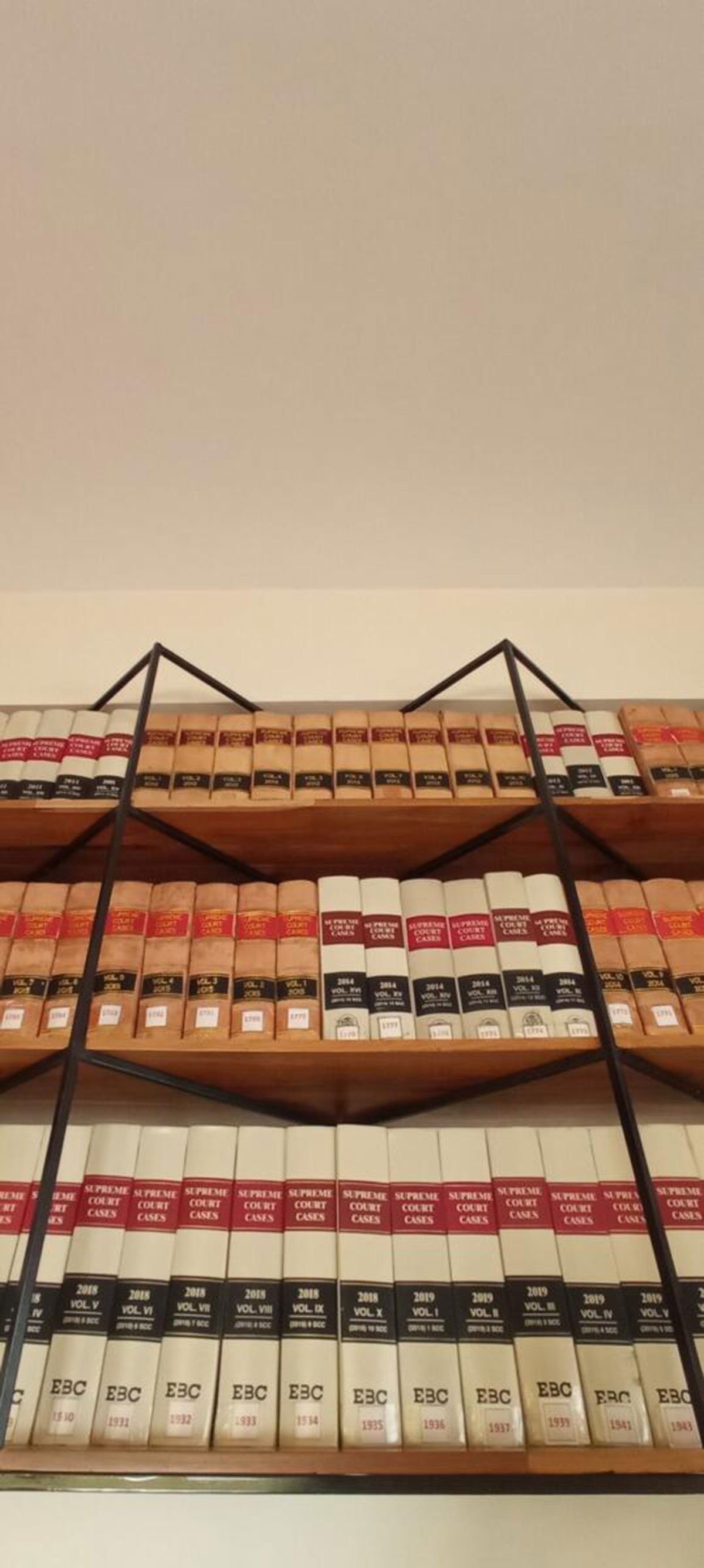 Wooden panels with finger-joints was picked for the horizontal surfaces to alleviate the warmth of the space yet keep it light. Furthermore, every wall available in the office had to be decked with a bookshelf to accommodate the hundreds of books on law. We created a unique pattern for the bookshelves such that the system could be tweaked and used everywhere in the office.