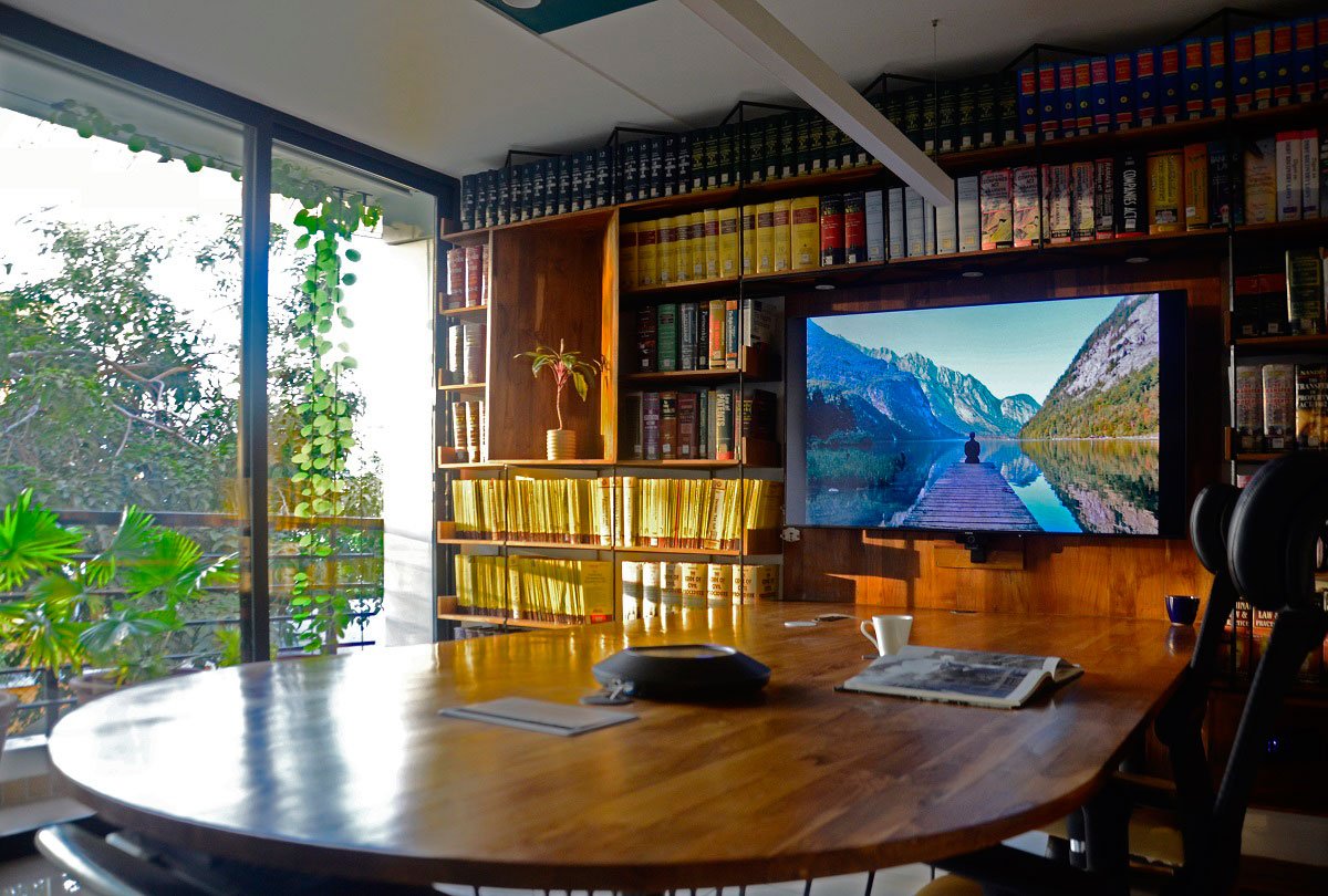 Every work table too was customized keeping each person’s comfort and use in mind along and beside the bookshelf. A deep blue color used sparingly on some walls in sync with furniture added a tinge of color to the workspace.