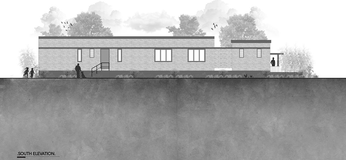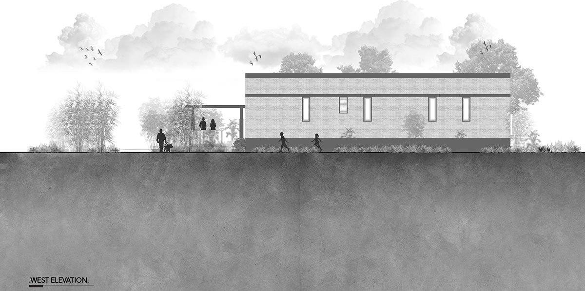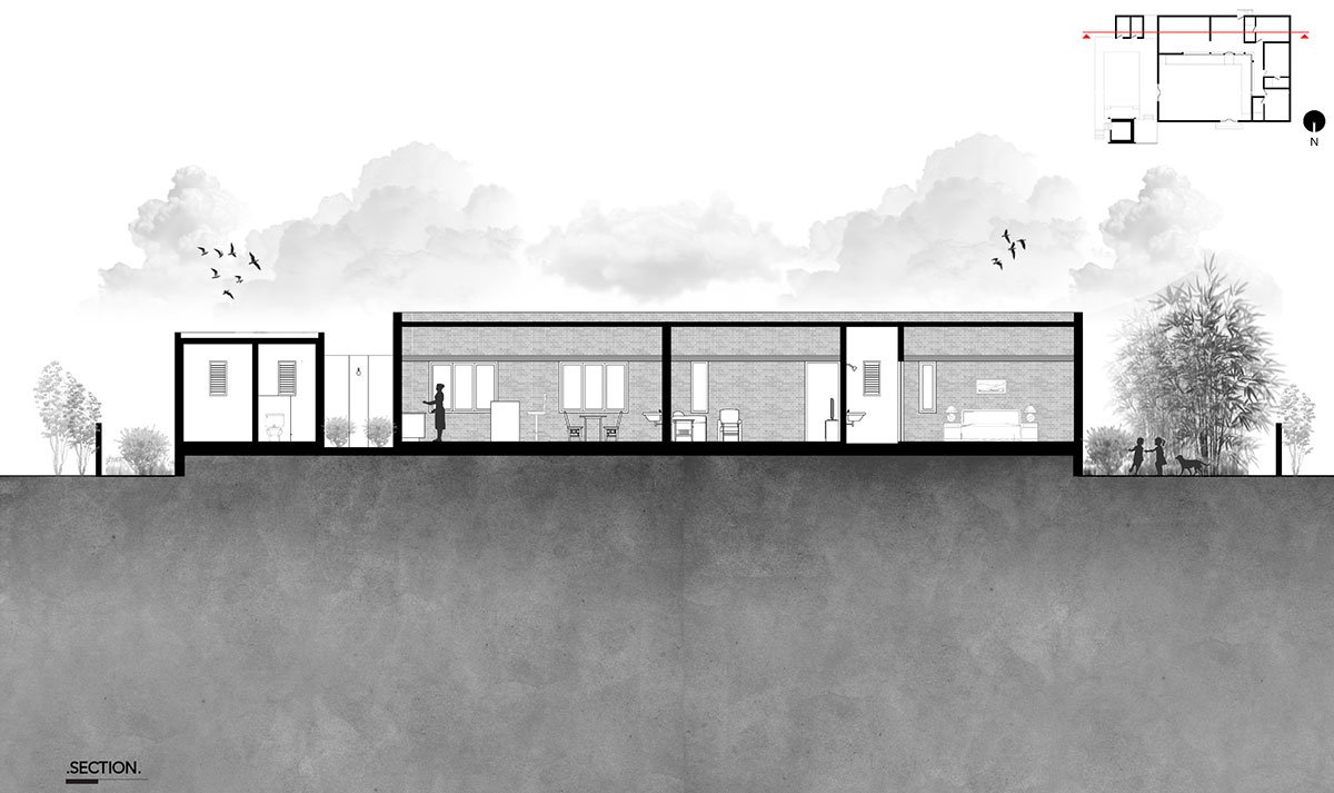 The brick-checkered entry to the villa is purposefully unmonumental and draws viewer’s focus to the green spaces in the courtyard with the backdrop of the house. The ceilings and floors are muted so that all the viewer focus is on the living spaces, human interactions, and the surrounding nature.