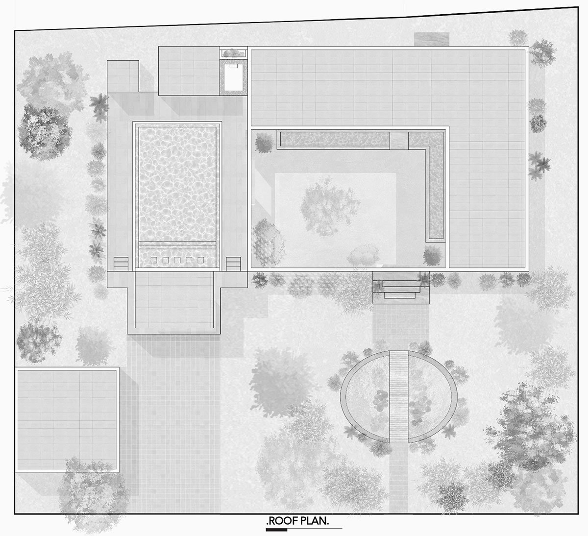 The main entrance of the house is through the courtyard. The L-shaped house surrounds a rectangular courtyard in such a way that all rooms overlook the courtyard. This form provides the openness for the living and entertainment spaces and privacy for the bedrooms.