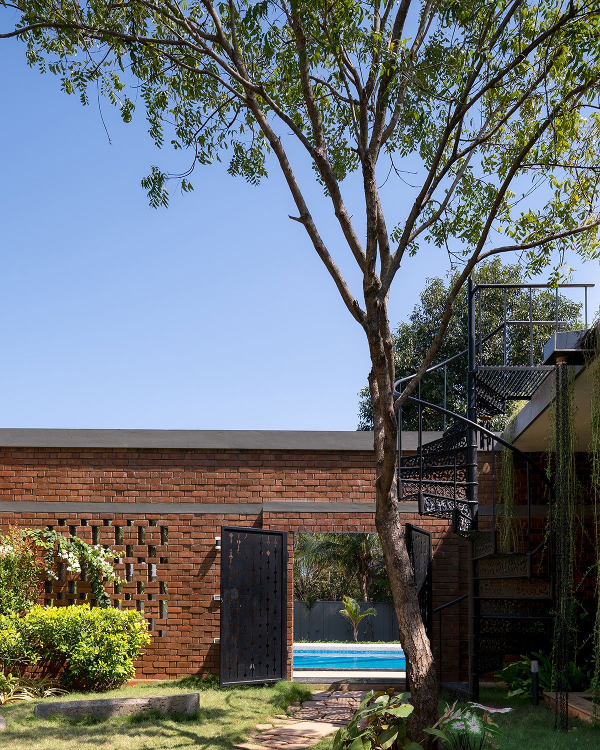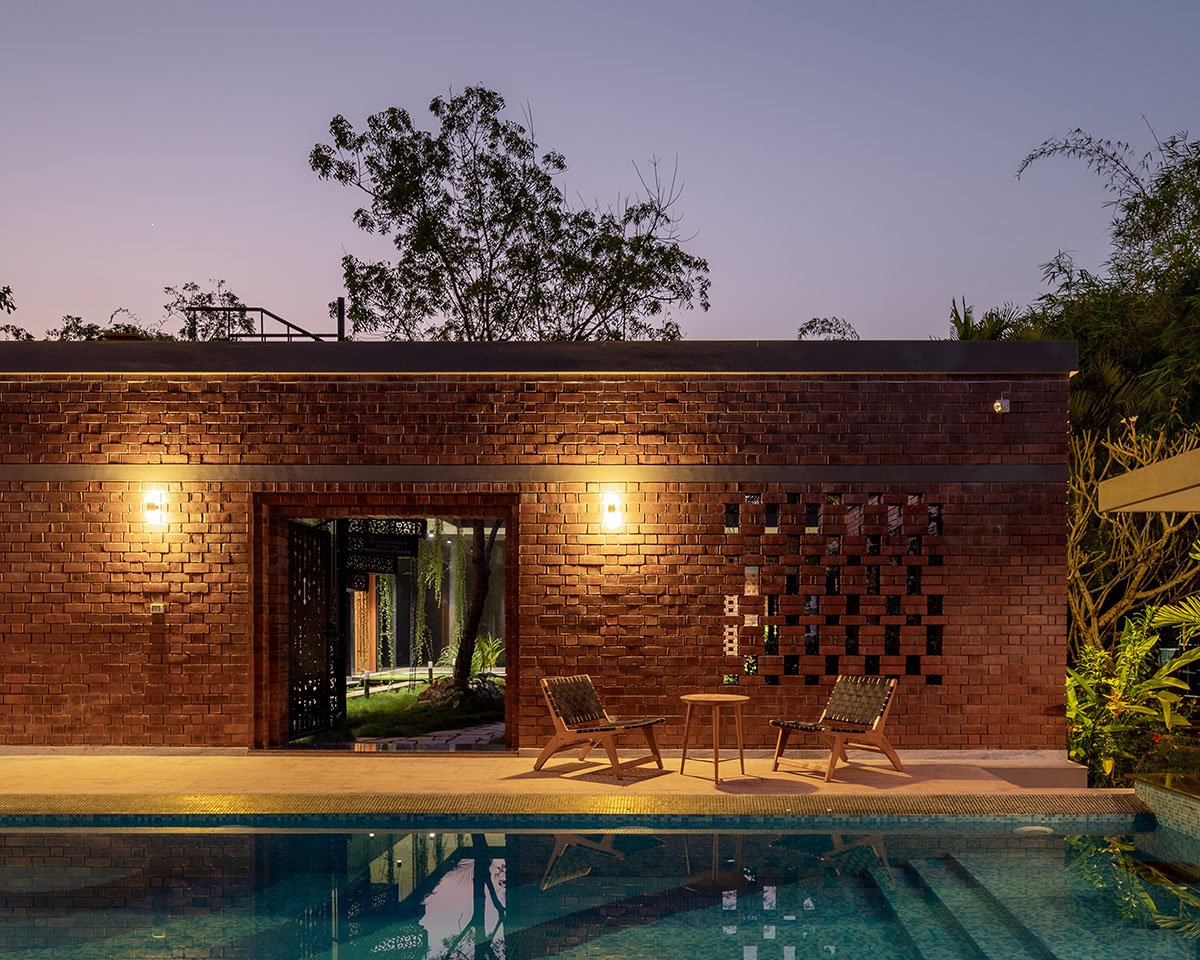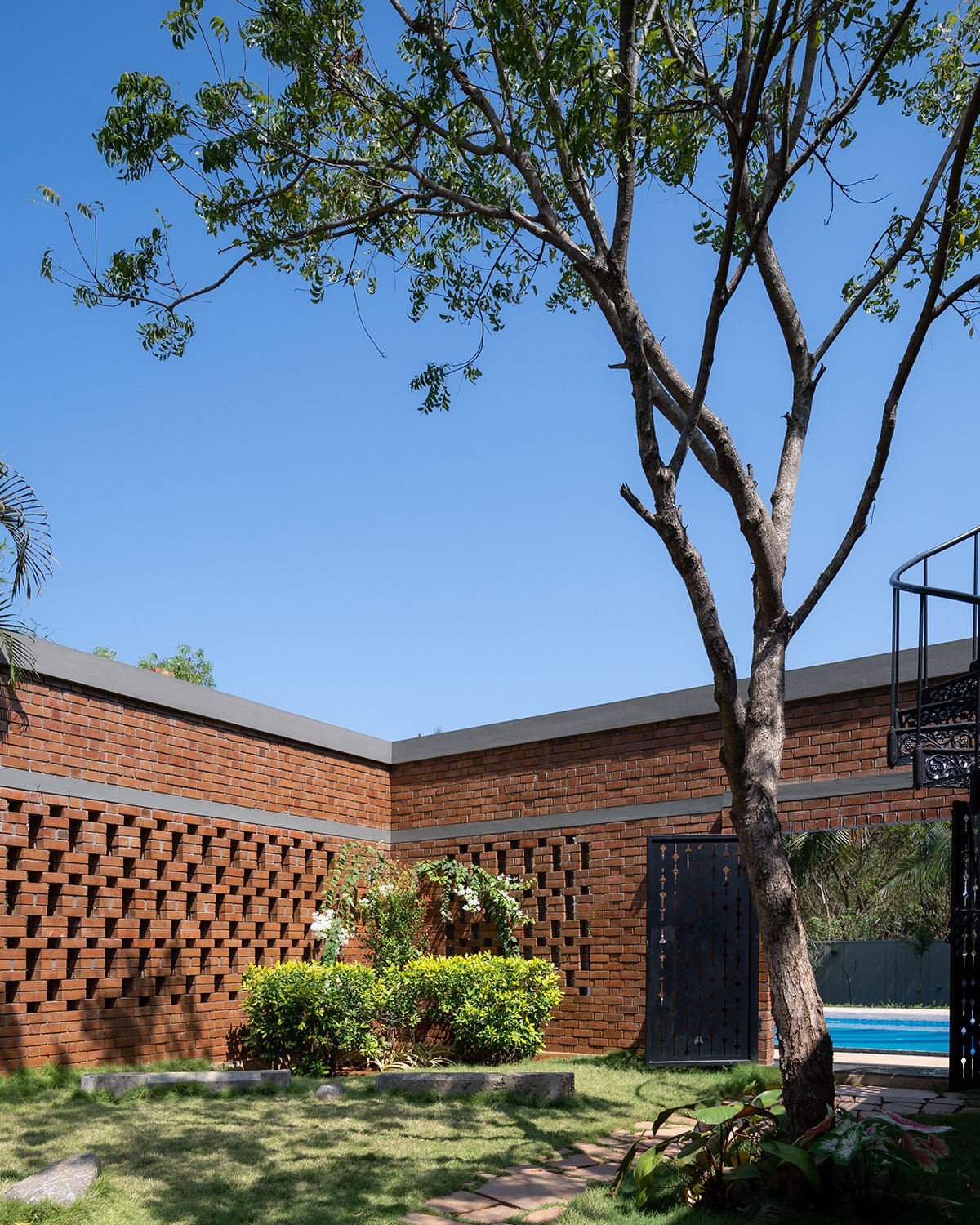 Excerpt: The Brick Abode designed by Architecture_Interspace is a residence designed to reveal and glorify the surrounding context and the local Indo-French architecture. The L-shaped house surrounds a rectangular courtyard in such a way that all rooms overlook the courtyard. This form provides the openness for the living and entertainment spaces and ensures privacy for the bedrooms.