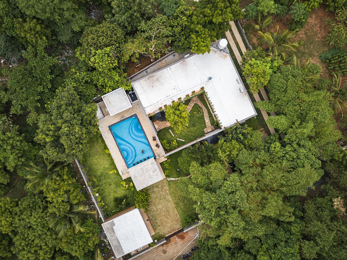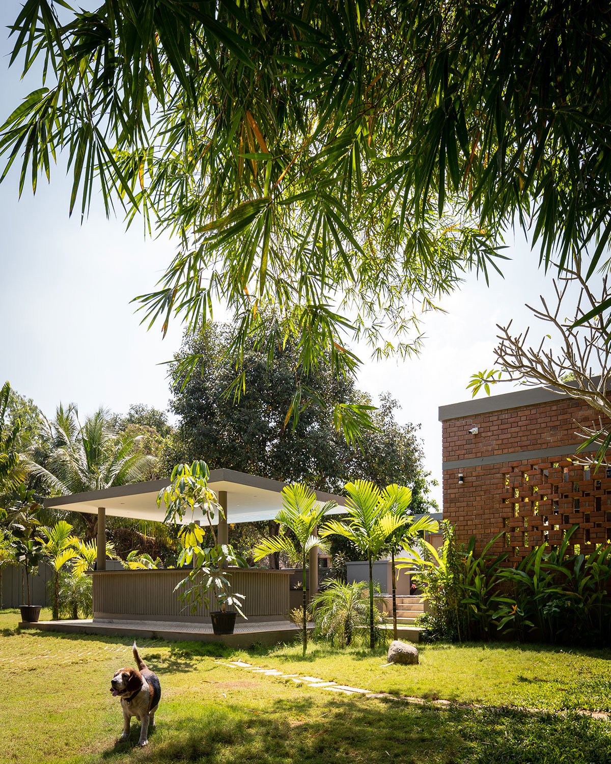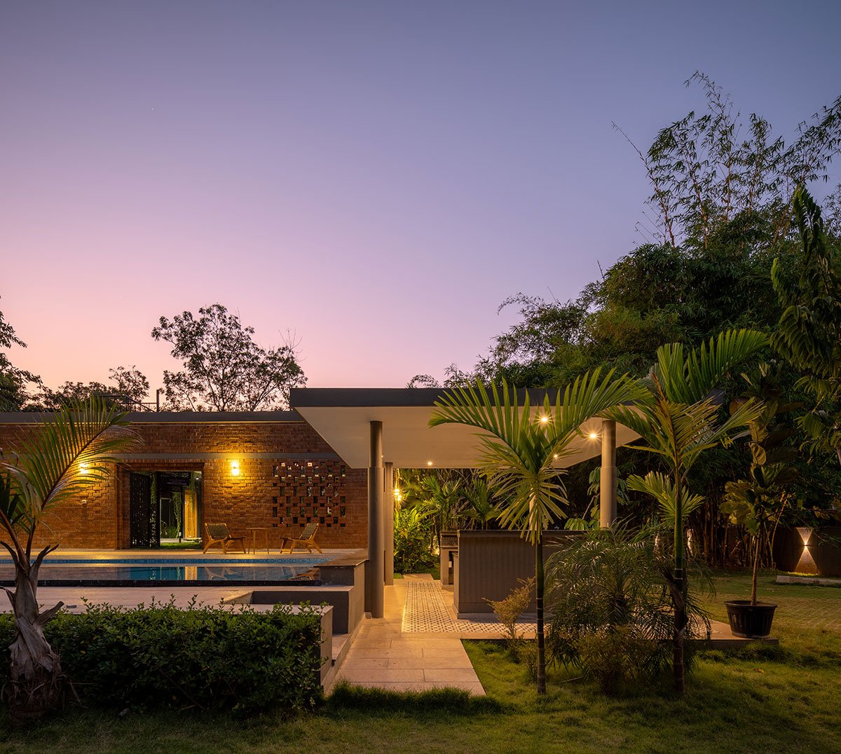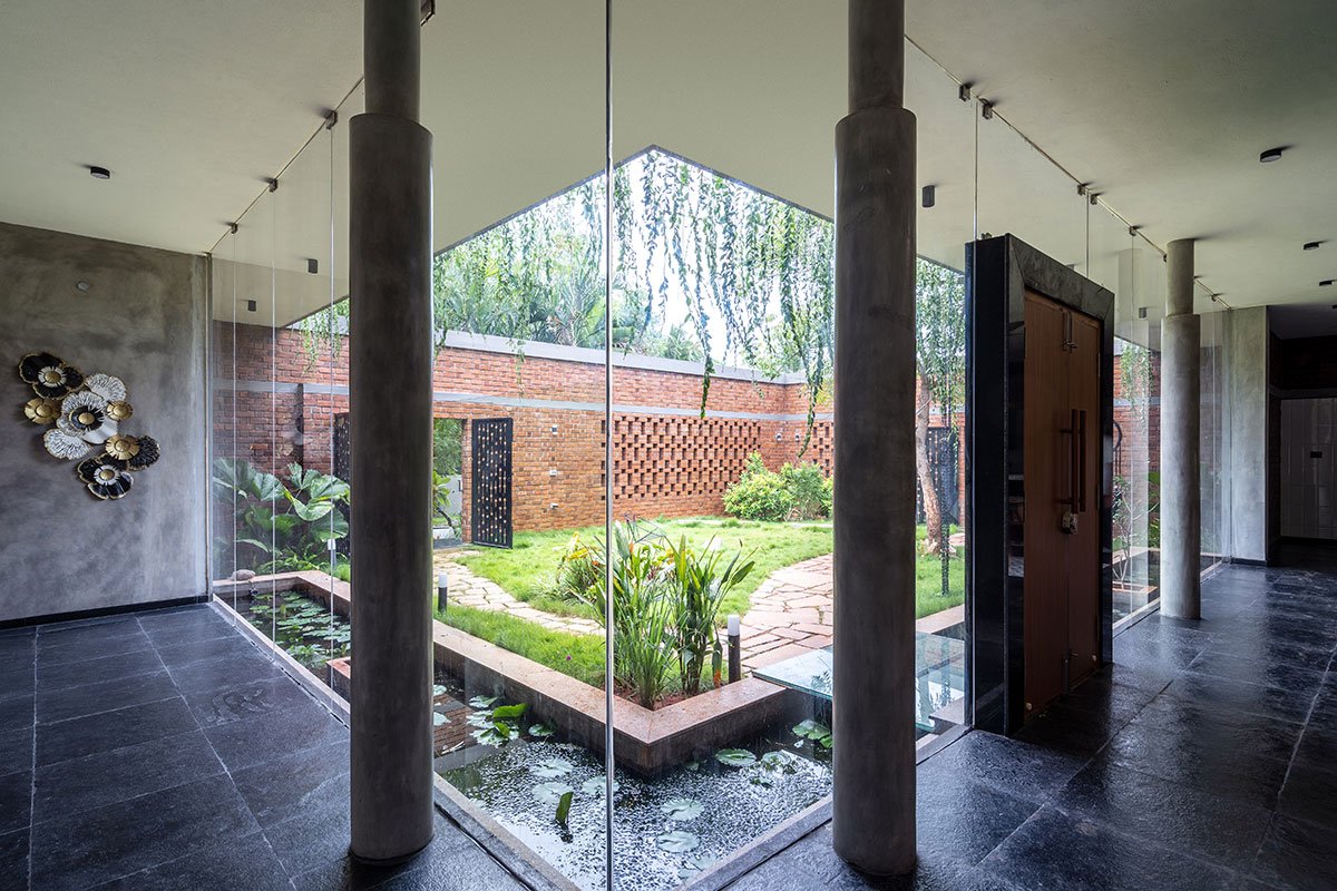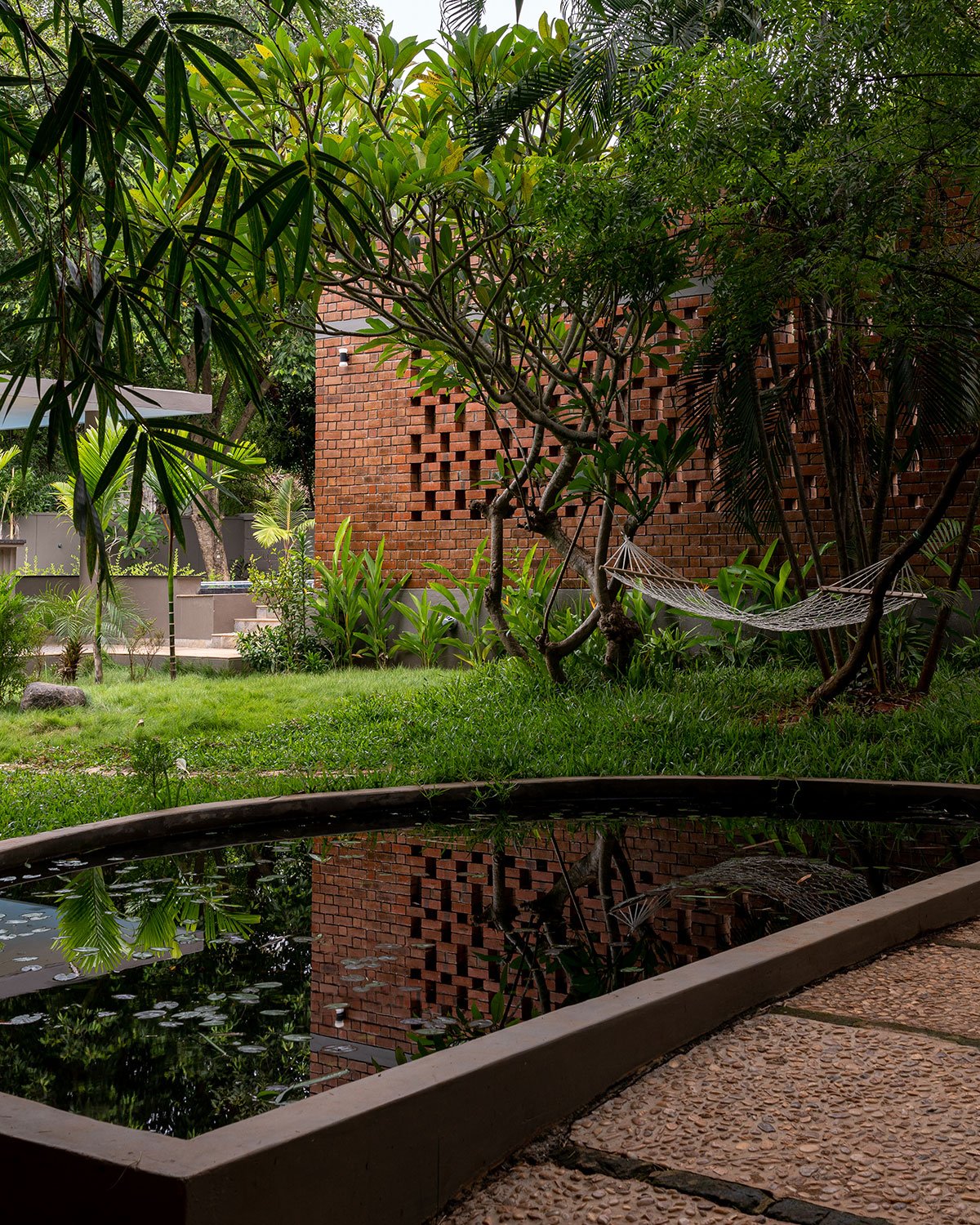 Architectural planning is dictated by two major factors – context and climate. Contextually, the red earth soil abundantly nourishes the horticulture, so, the landscape boosts the character of the site and lifestyle of residents. Also, this plot of land does not offer views outside, so, views are focused on the landscape and interiors.