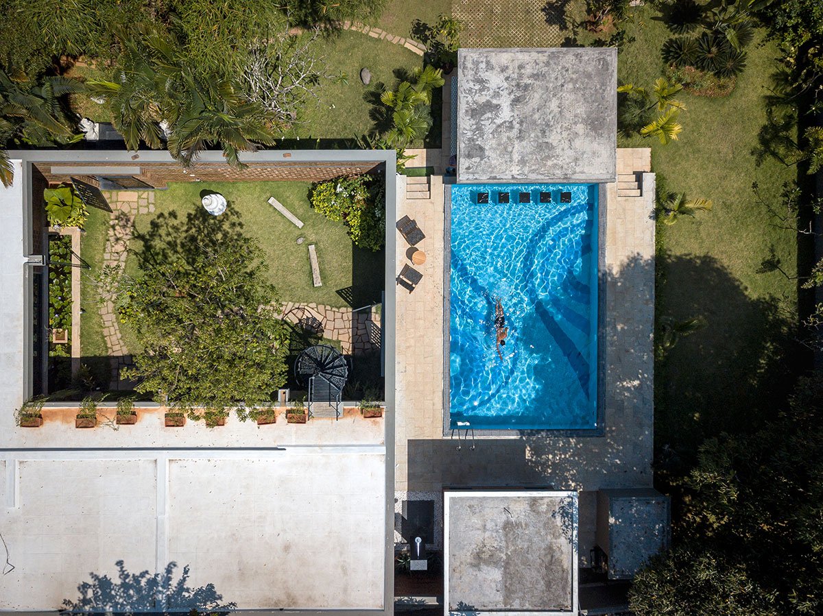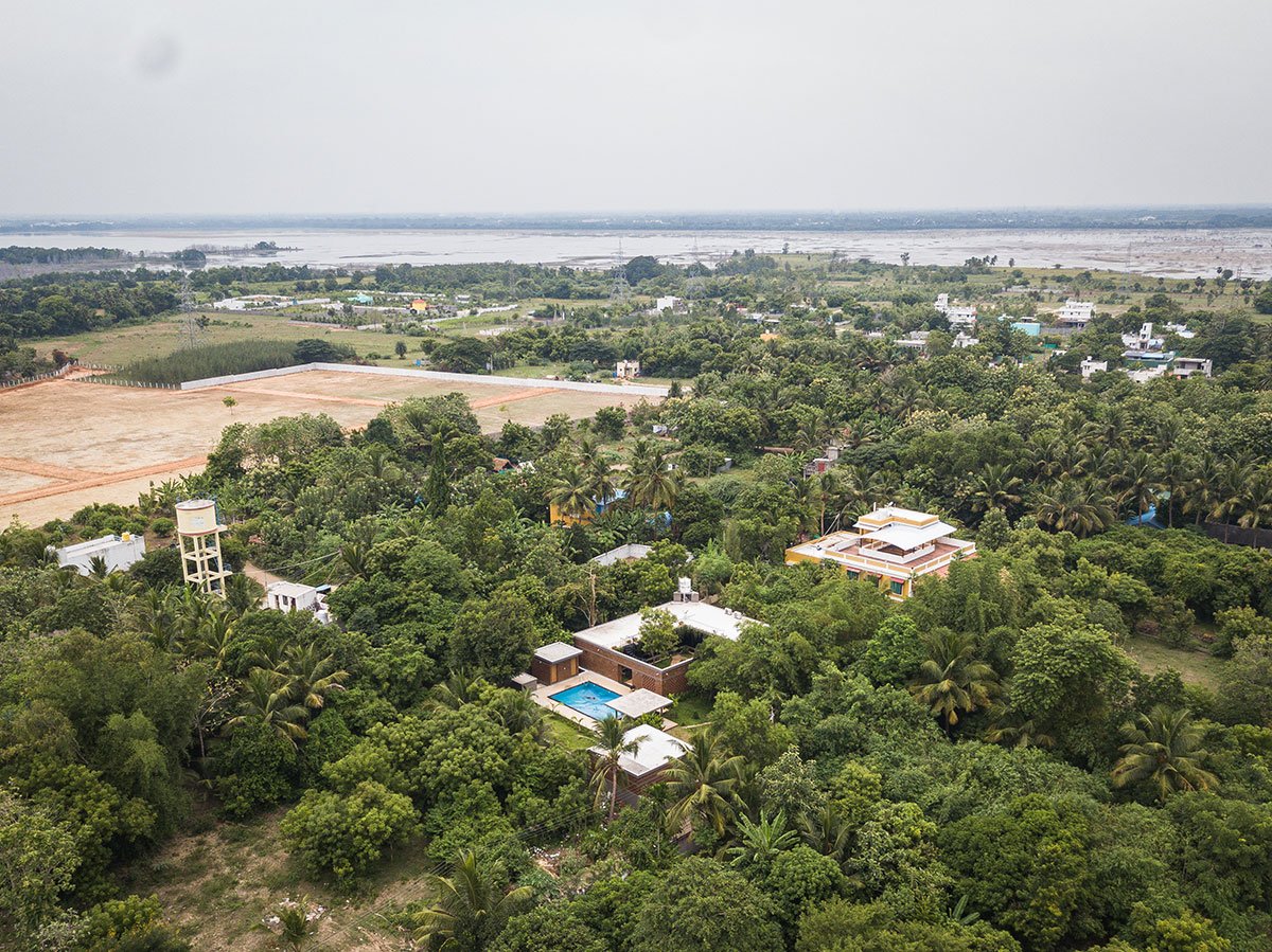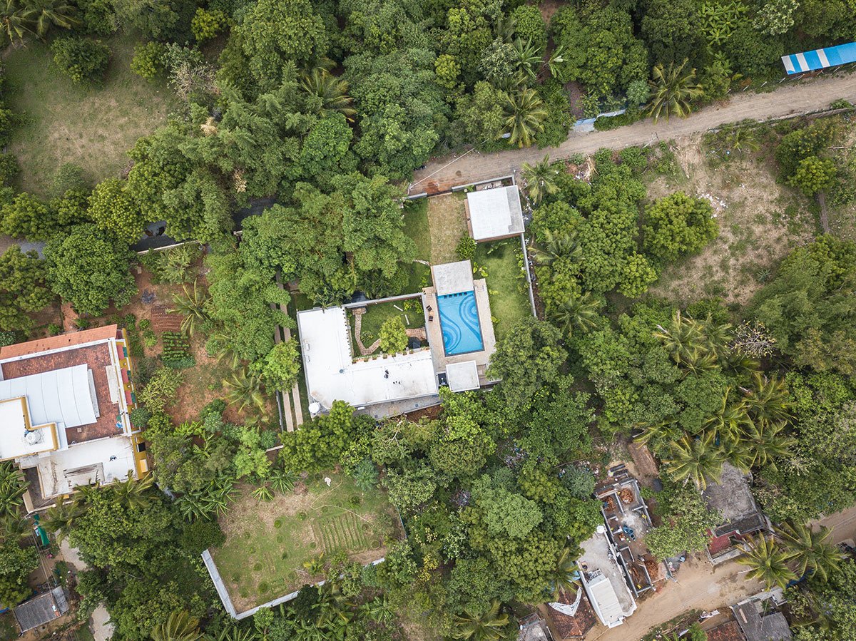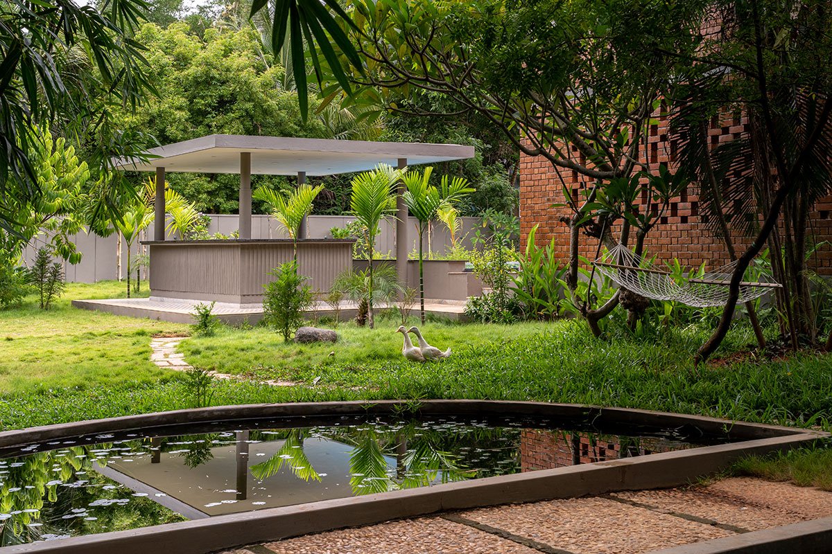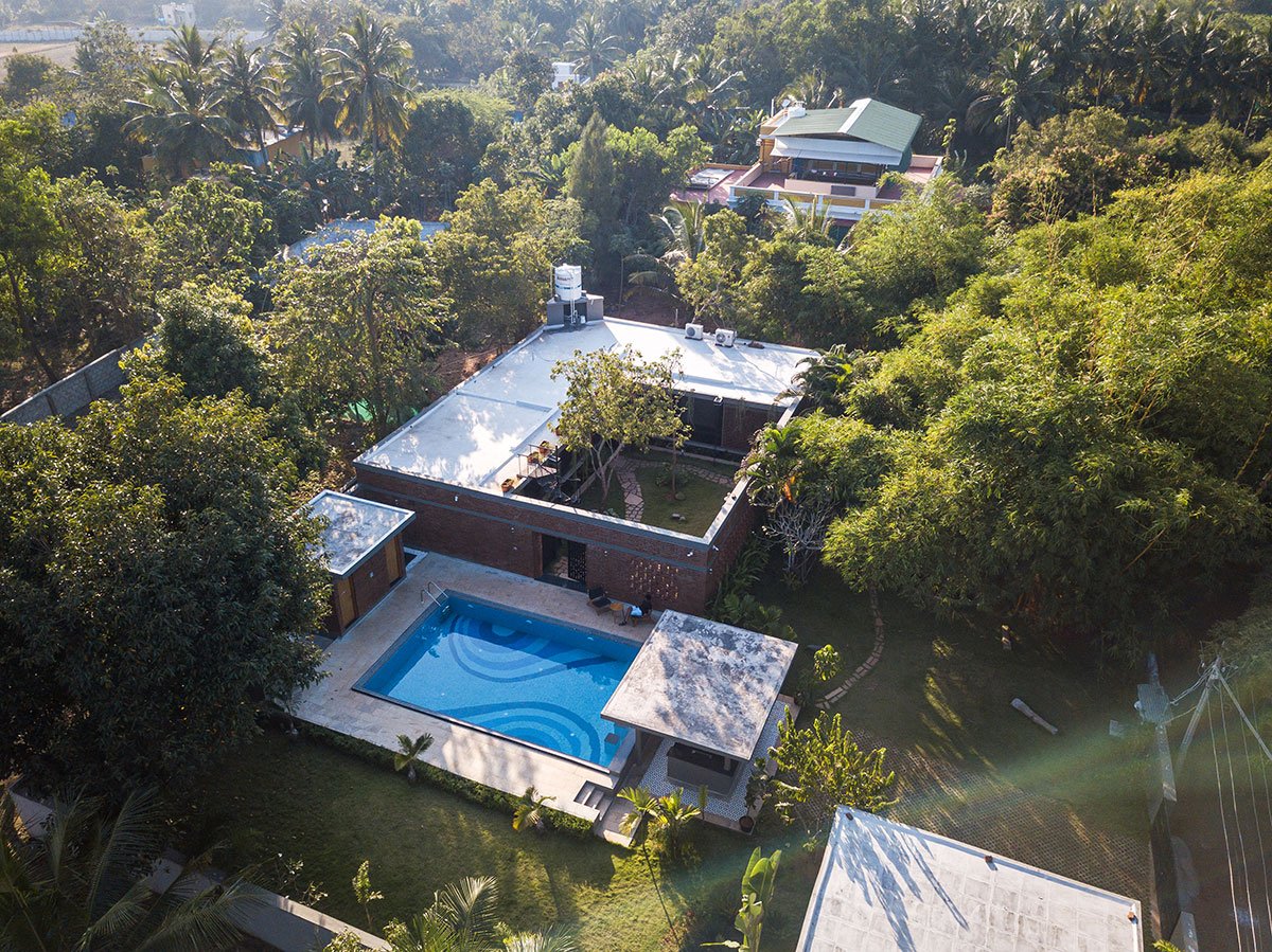 Climatically, the hot humid weather made the designers turn to the traditional Indo-French architecture in the nearby French town Pondicherry. They studied the climate mitigation factors adopted by traditional Indian and French courtyard houses and derived the layout for the house. The house feels bigger than it is because of its connection to the landscape and the efficiency of the layout.