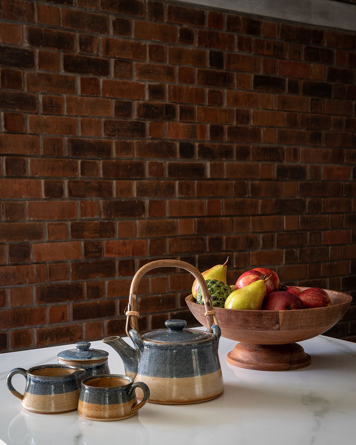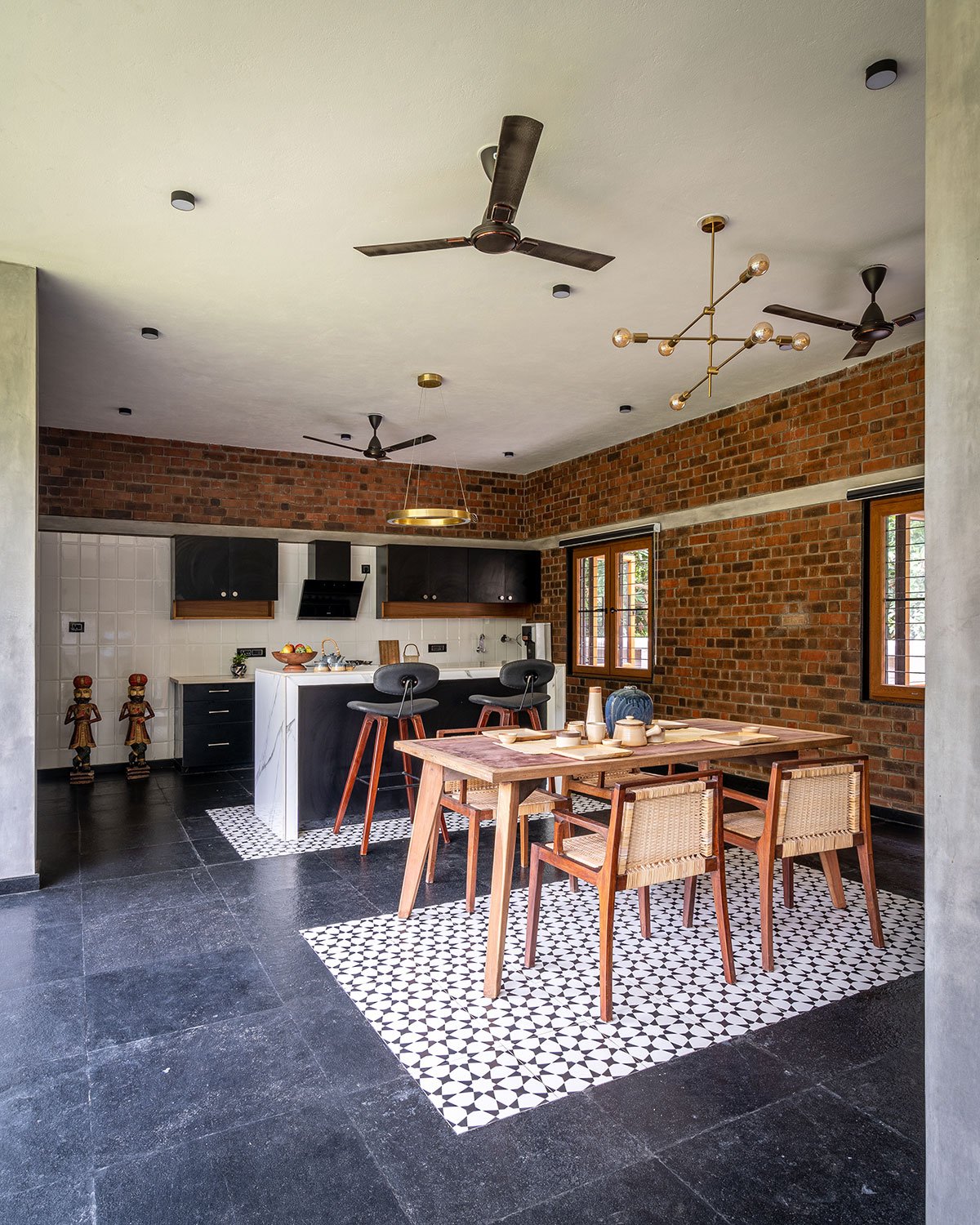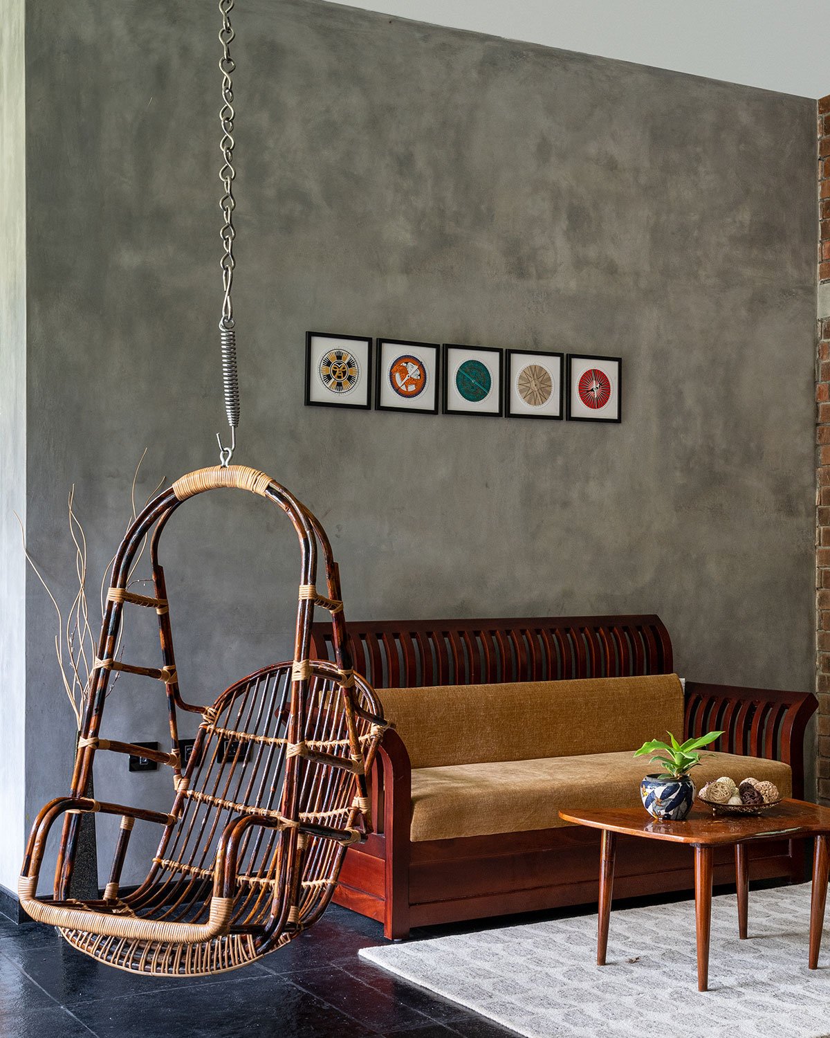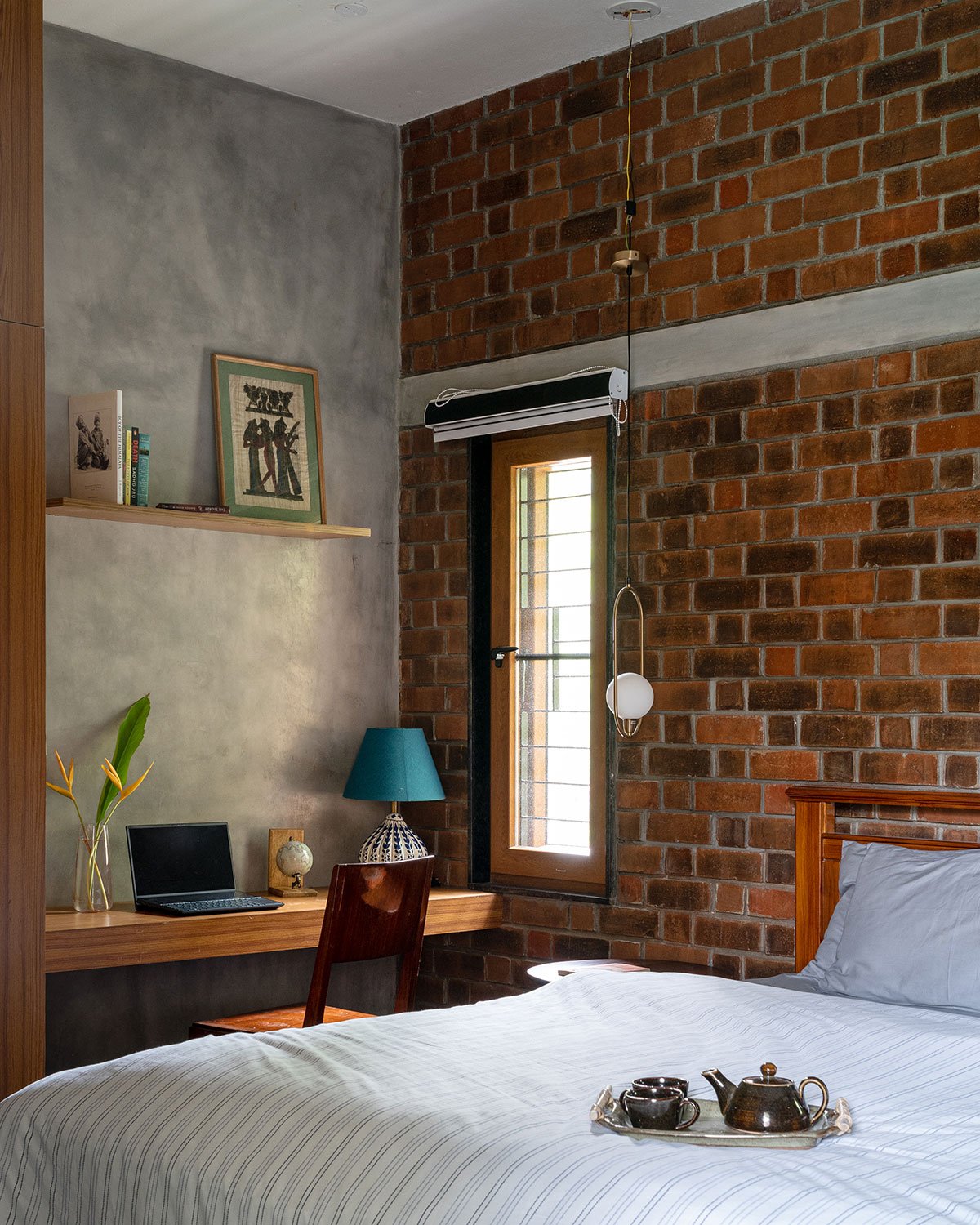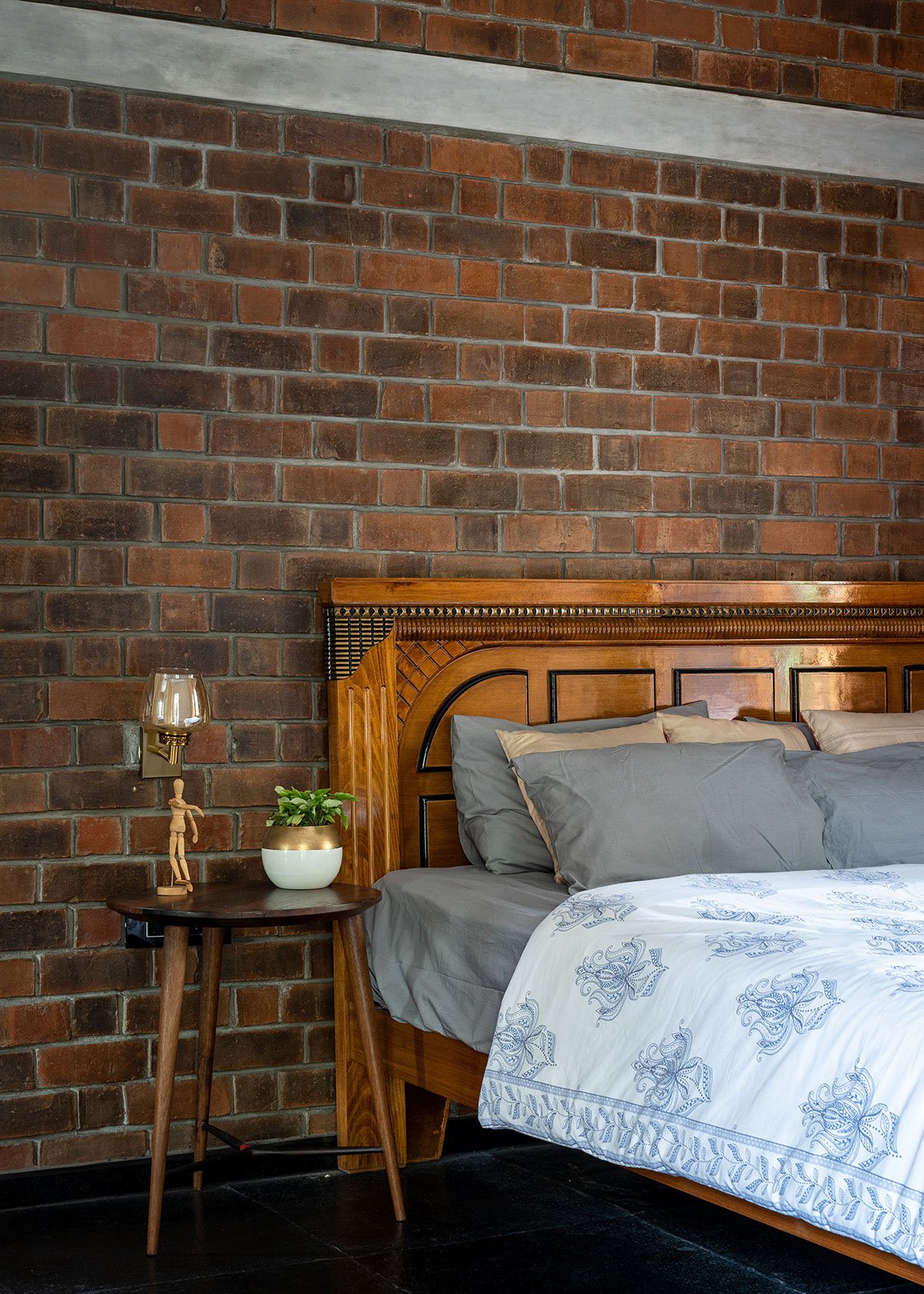 The exposed red earth brick walls are inspired from a unique feature of the village – the red earth soil which nourishes agriculture and horticulture in the area. The bricks are locally sourced. Waxed natural Cuddapah stone is used for the flooring.