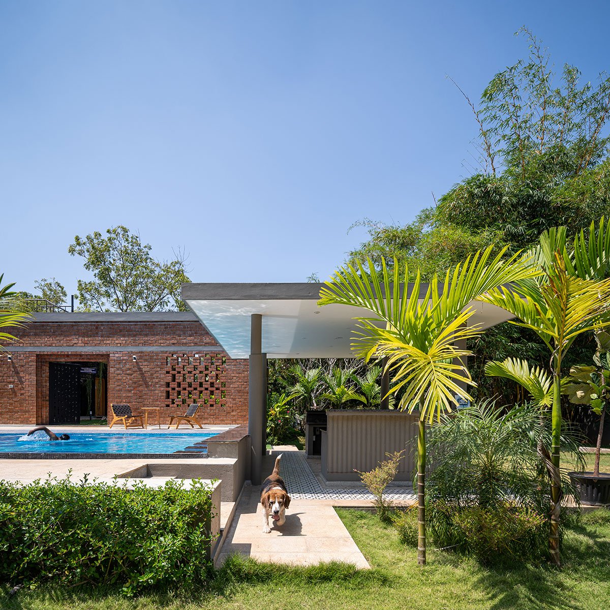 The jaali-walls of the courtyard act as filters for the harsh sunlight and hot air during peak summers. A separate side entrance leads to the pool and party lawn. The courtyard houses small parties while the pool and lawn host large gatherings.
