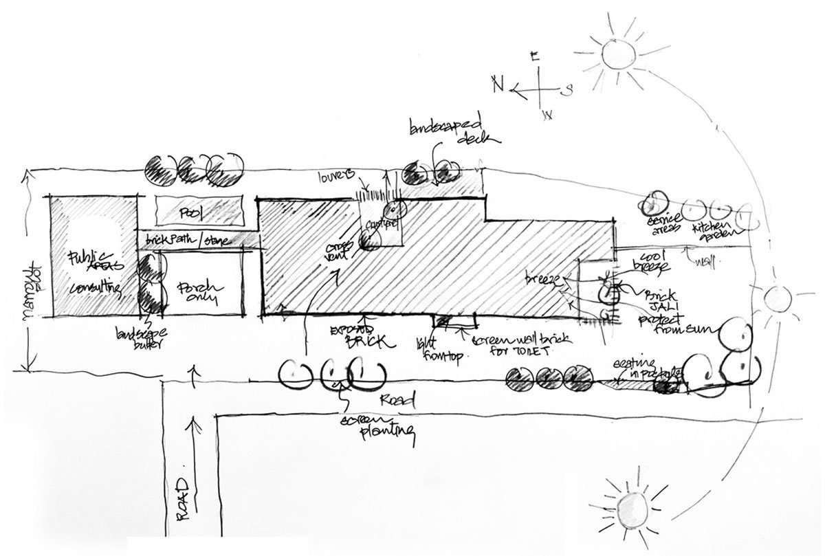 From a functional layout, the Dining area with its east-west orientation opens out to a landscaped internal Courtyard, connecting the house with the ‘out-doors’. This functional syntax is carried across to other parts of the house also, such as the master bedroom having a landscaped court bounded by brick louvers bringing in cool breezes whilst also being privacy screen controlling views in from the outside.