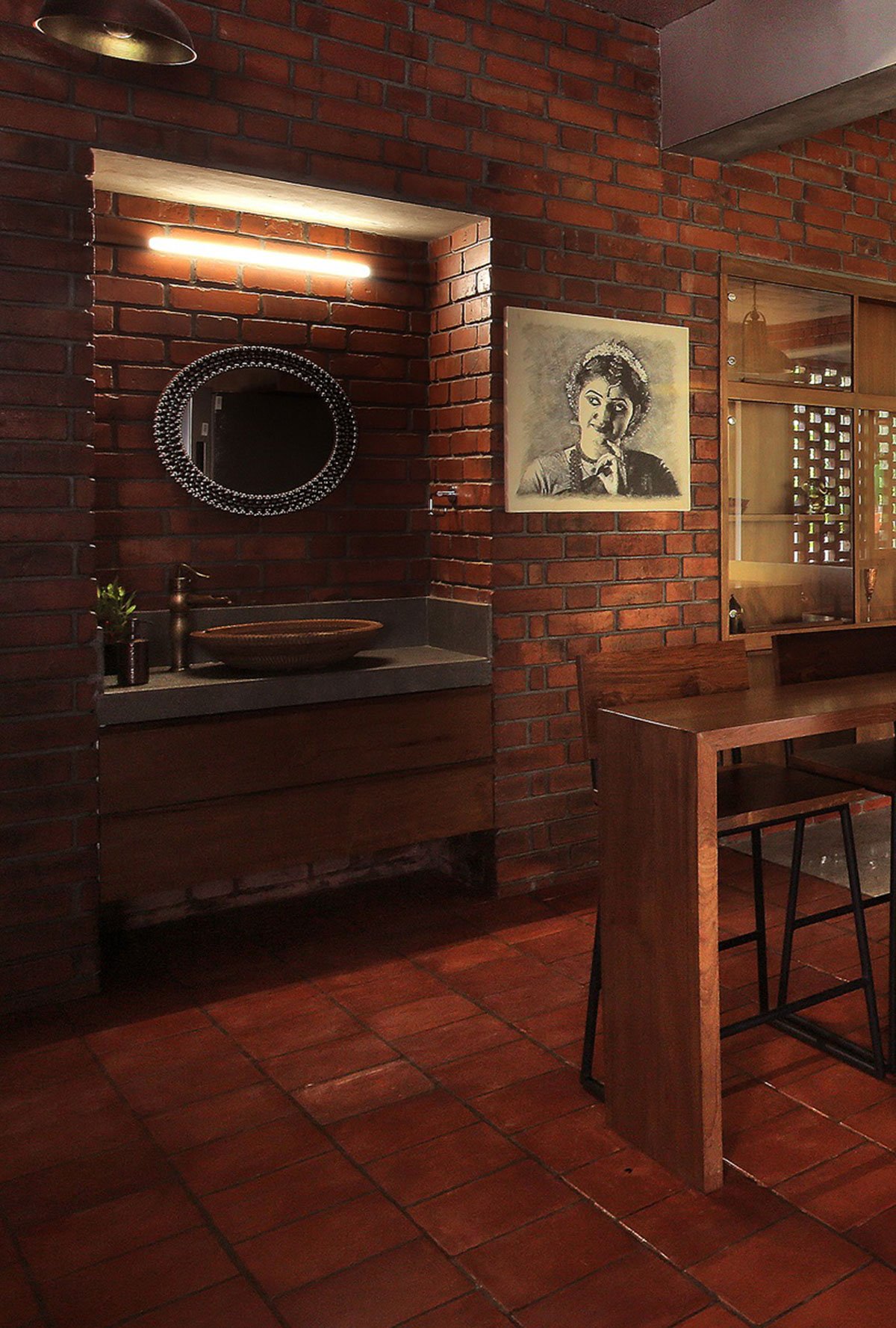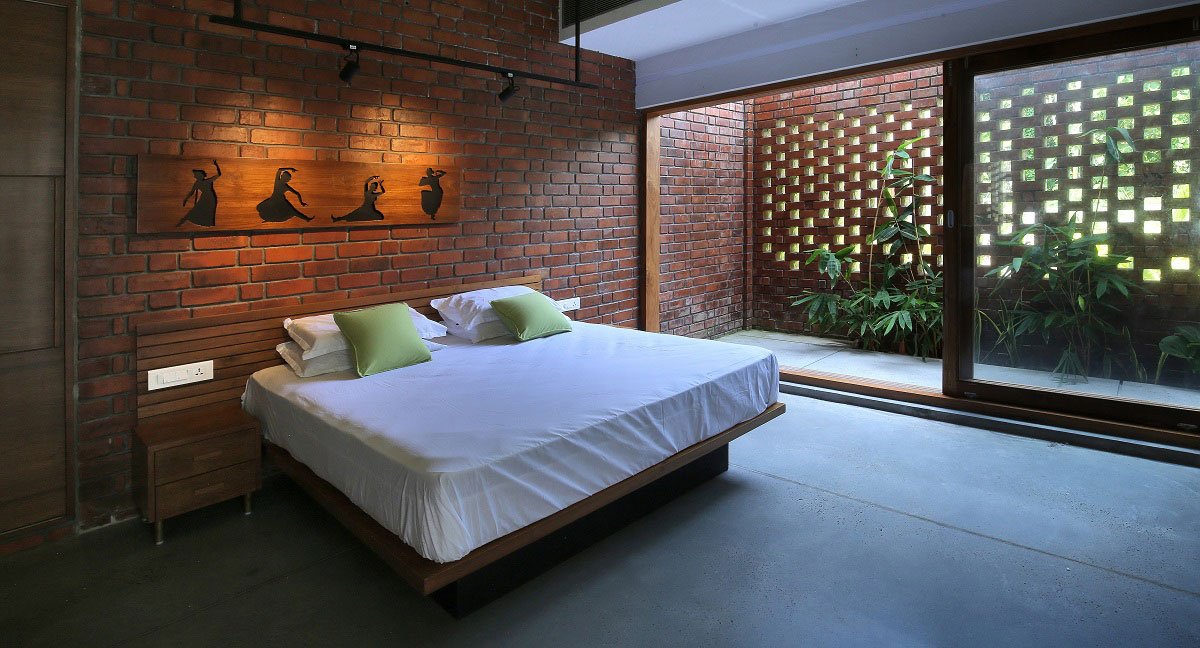 The house is an exploration in transitionally revealing the beauty of ‘burnt earth’ in the form of one of the oldest and most versatile man-made construction materials – the ubiquitous BRICK. The design and ensuing construction process was a purposeful journey of allowing exposed brick utilizing a uniquely customized bond layout pattern, together with exposed concrete ceilings, polished concrete floors to lend rich texture, form and warmth to the tectonic ensemble.