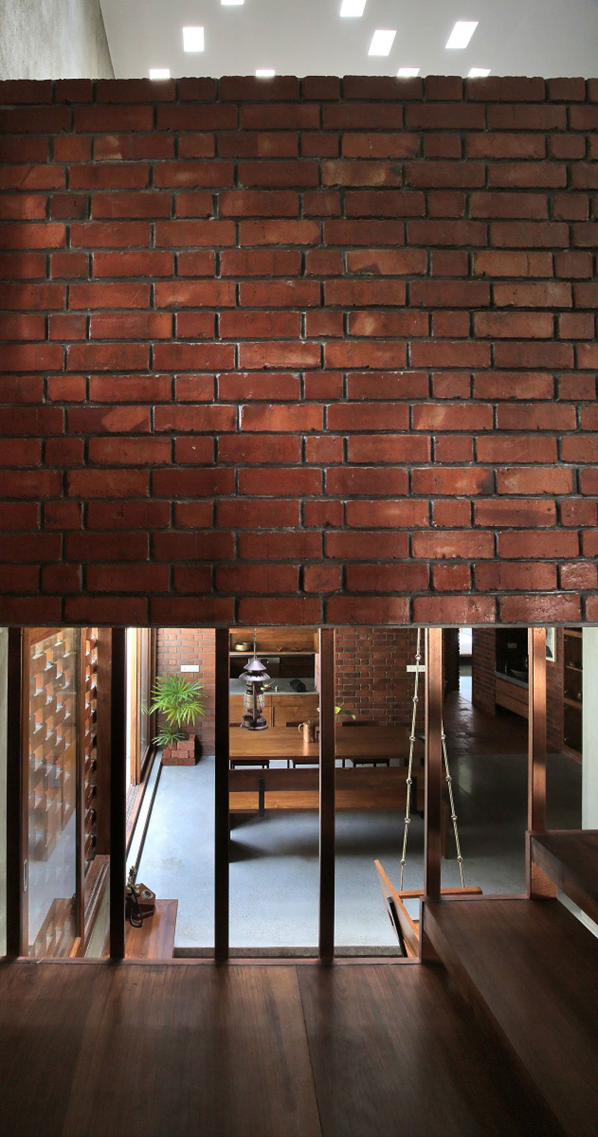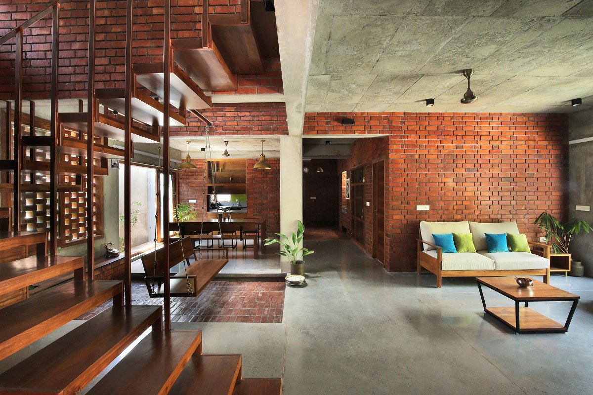 The house becomes a celebration of the imperfection of the material substrate, and the organic expression of asymmetry conspicuously present throughout all adding to a sense of sensory dynamism. The custom-built furniture and joinery items add to the charm of the house. Internally, the ethereally designed timber staircase and its juxtaposition to a traditional swing in the adjoining internal courtyard, uses the visual language of litheness and motion to tie together the larger layout of contingent spaces, whilst also allows through-views to allow for a sense of a spatial continuum of sorts.