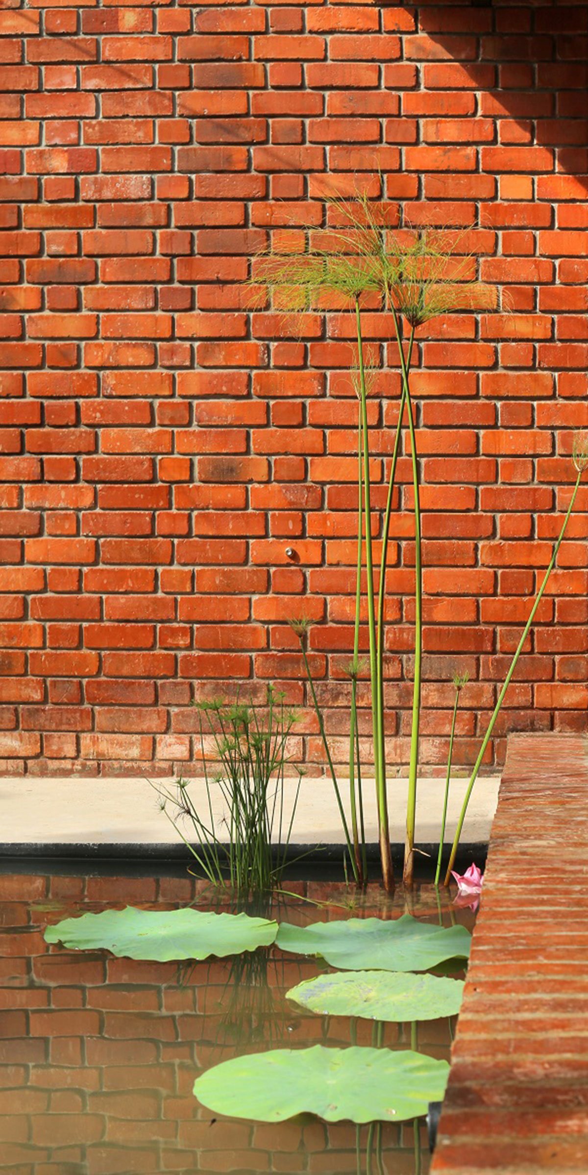 Public v/s Private: On this same theme, the Medical Consultancy space and its adjoined Guest Bedroom form a separate block spatially separate to the rest of the house, but nonetheless subtly blended in with the house such that the whole presents itself as a single entity. A carefully detailed brick-paved path forms the tectonic cord connecting the two spatial blocks together whilst also doubling up as a performance stage floor for small family gatherings. The quiet reflective brick-edged lotus pool besides informal stage gives a palpable and inviting vibe to this space.