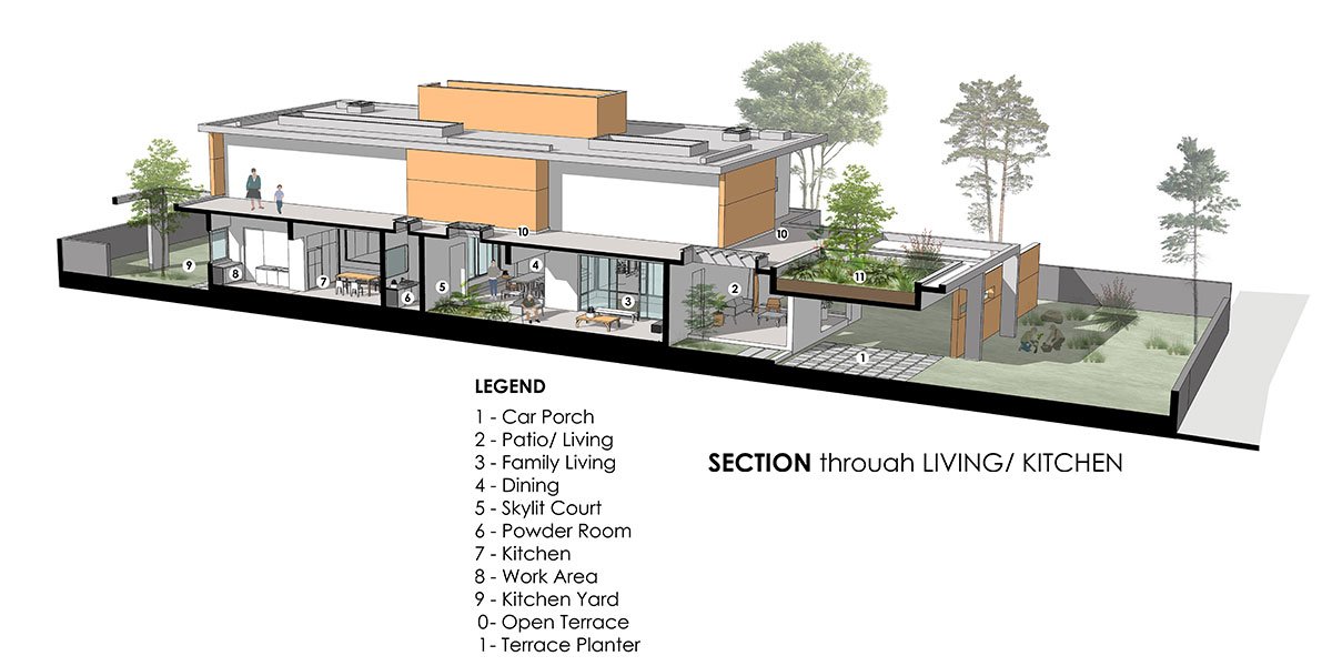 The house placed perpendicular to the road with the landscape surrounding it has three bays of horizontal development designed to make use of the site’s length and the direction of the prevailing wind. In the primary bay, the car porch, sit-out, living, powder room, kitchen and the work area are arranged in the indicated order. The secondary bay has the bedrooms and their toilets flanking the staircase and a hidden courtyard in which all the bedrooms open. With the dining room in the middle and an indoor patio above it that serves as the family room in this home, these two bays are joined by two large double height courtyards in the central bay. These courtyards in conjunction with the carefully placed monsoon windows in them and the horizontal strip ventilators opening to the exteriors in each room create a microclimate inside the house that helps keep the house cool during the hottest months.