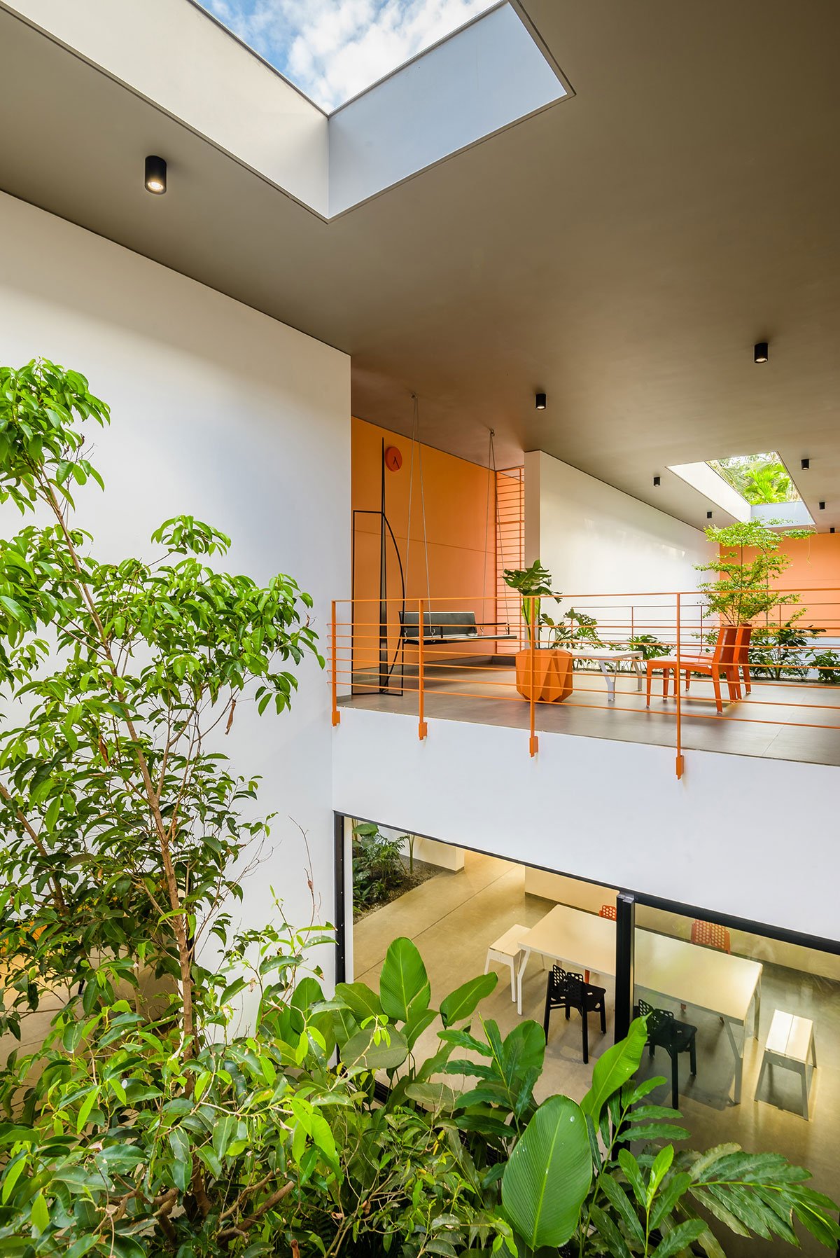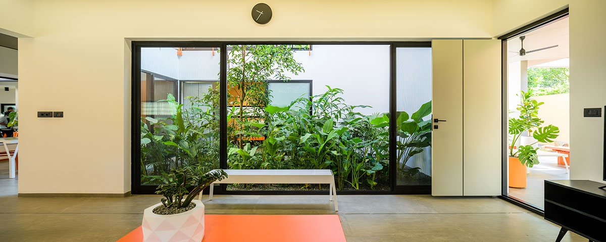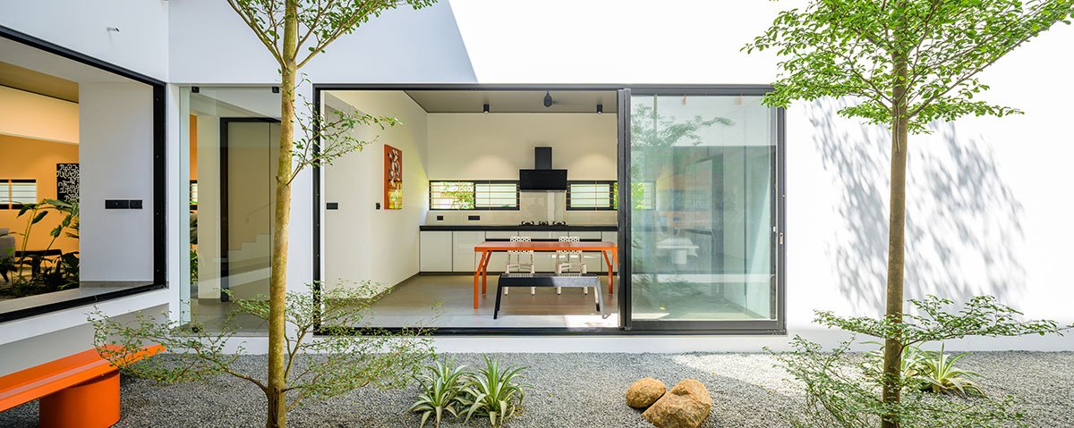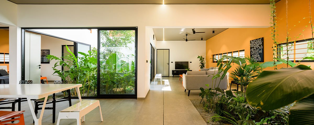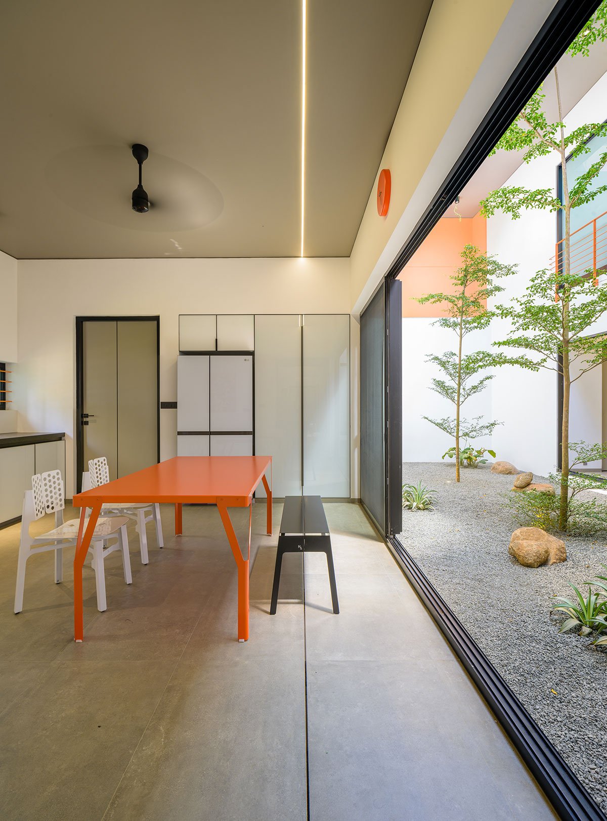 The internal spaces seamlessly flow into one another, creating an openness even a wheelchair bound young resident in this house enjoys. Tropically lush vegetation covers the courtyard between the living area and the first bedroom, giving the private bay the required visual separation. However, the courtyard that connects the kitchen, dining, study and second bedroom has less vegetation to encourage movement through it and is used as an alfresco dining or a space to unwind.