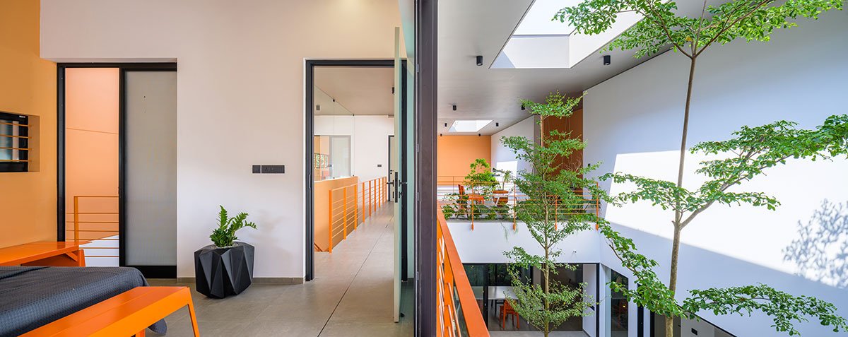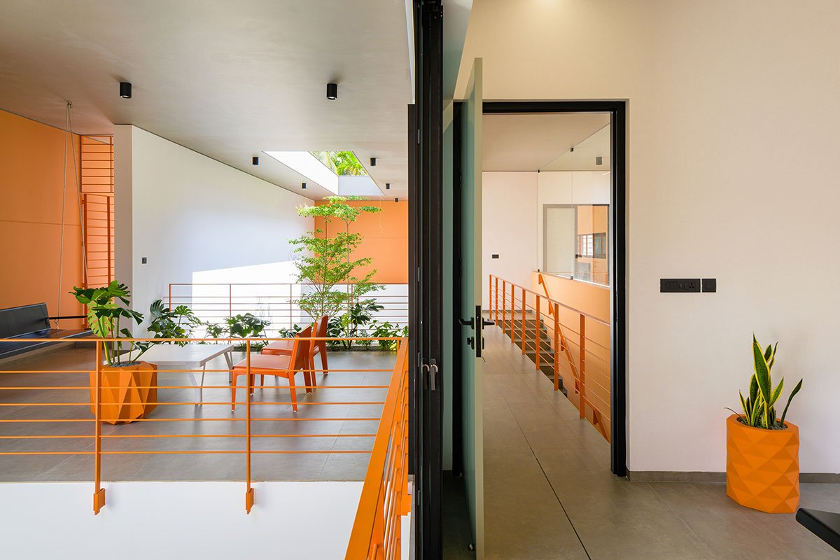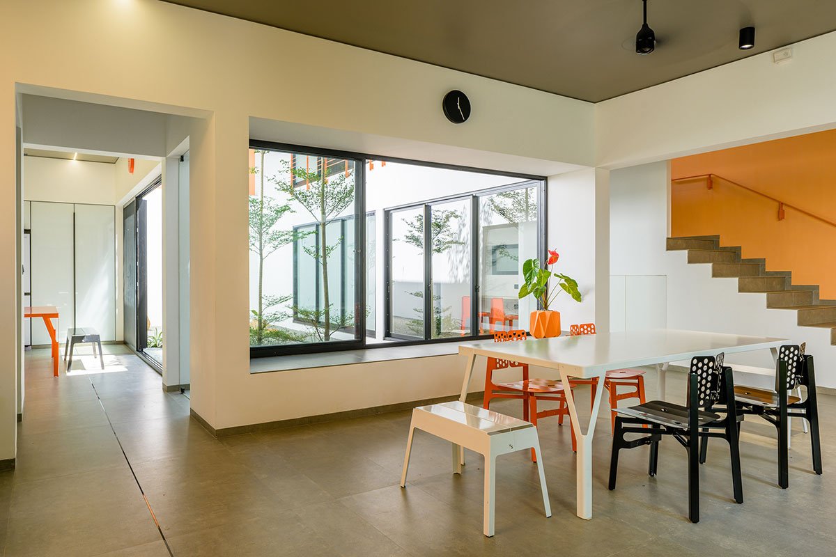 The moniker of this project refers to the burst of colours employed throughout the home. The house is filled with contagious energy by the orange, black, white, and grey hues that appear on the walls, furniture, wall art, metal fabrications, décor items, soft furnishings, etc.