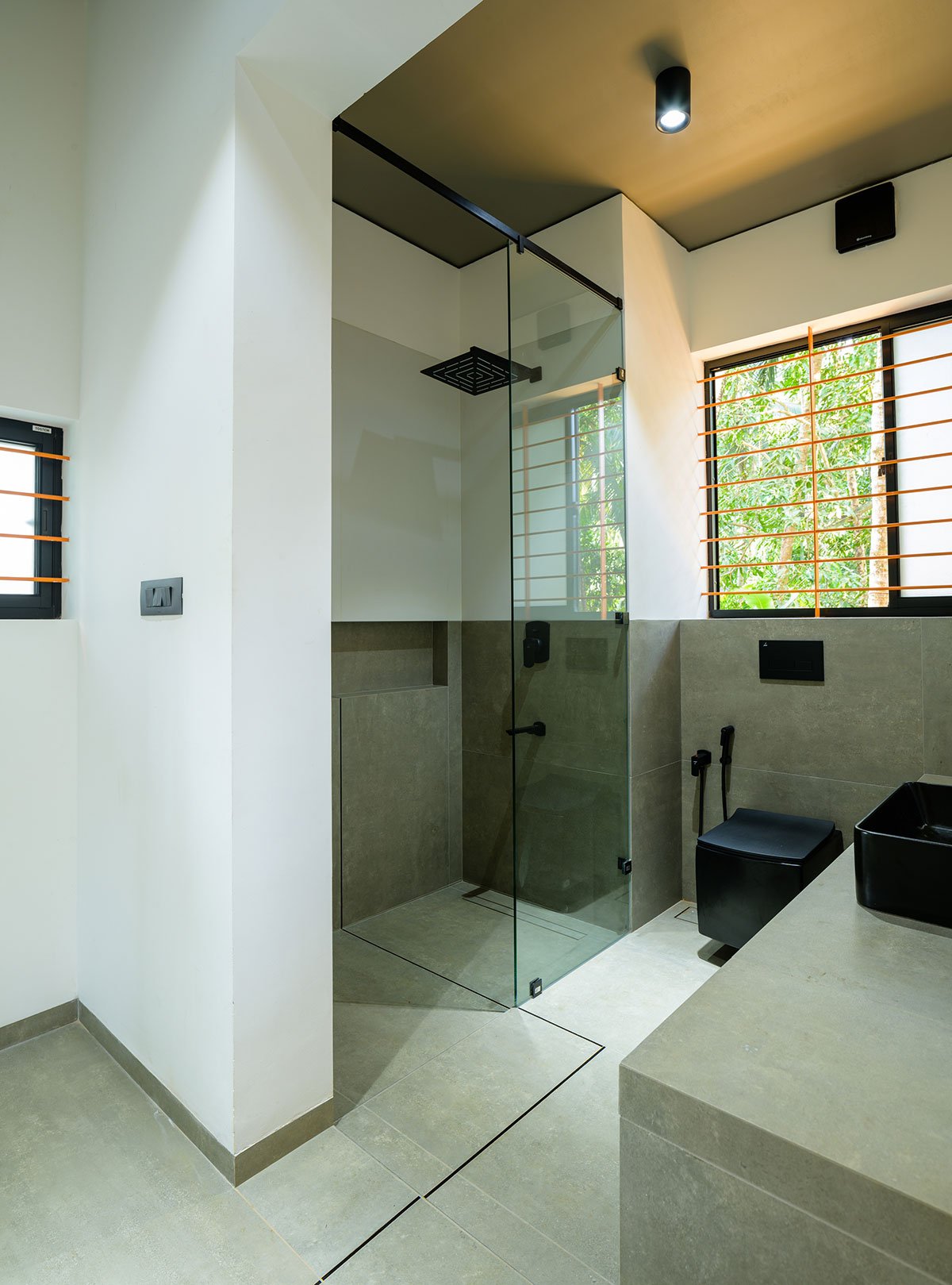 The simple yet bold rectangular form of the building is softened at both ends by means of walls and frames extending into the landscape, the car porch with the terrace garden above it, and the transition of the tropical garden into the dry garden around the entry. The entrance to the house is through a modest skylit landscape and the pavilion-like sit-out that is exposed to the landscape and serves as an outdoor living area. The experiment in blurring of indoor and outdoor, shaded and open, and built and unbuilt begins here in the project.