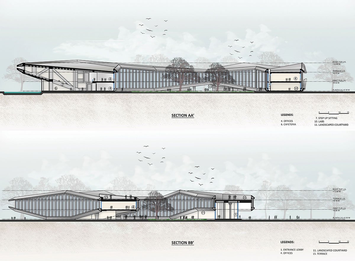 [Text as submitted by architect] A linear office space twists organically in plan, creating a large landscaped courtyard within it. Varying from two to four levels sectionally, the office floors are lifted from the ground at the southwest and northeast sides to facilitate a south-westerly breeze through the courtyard.